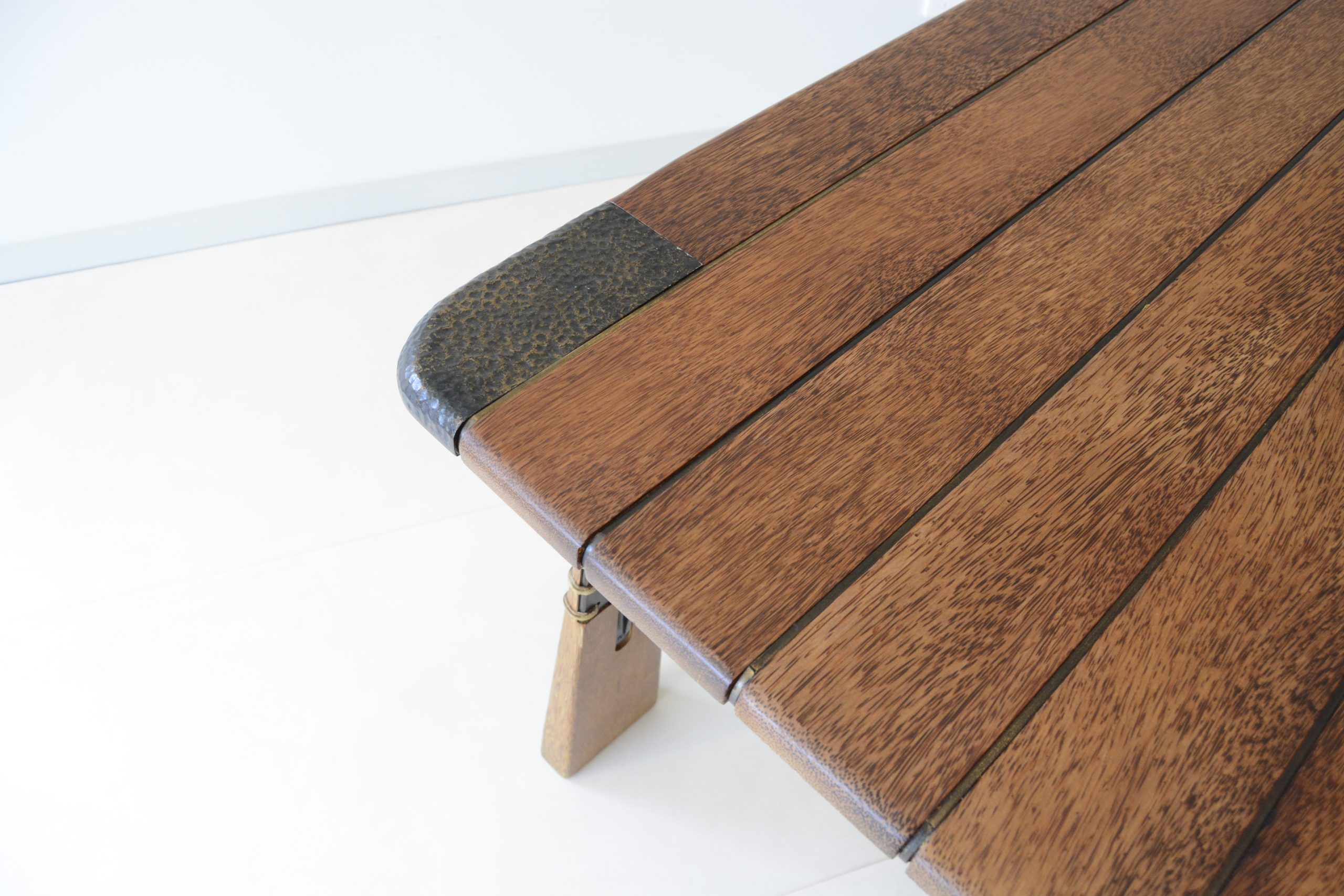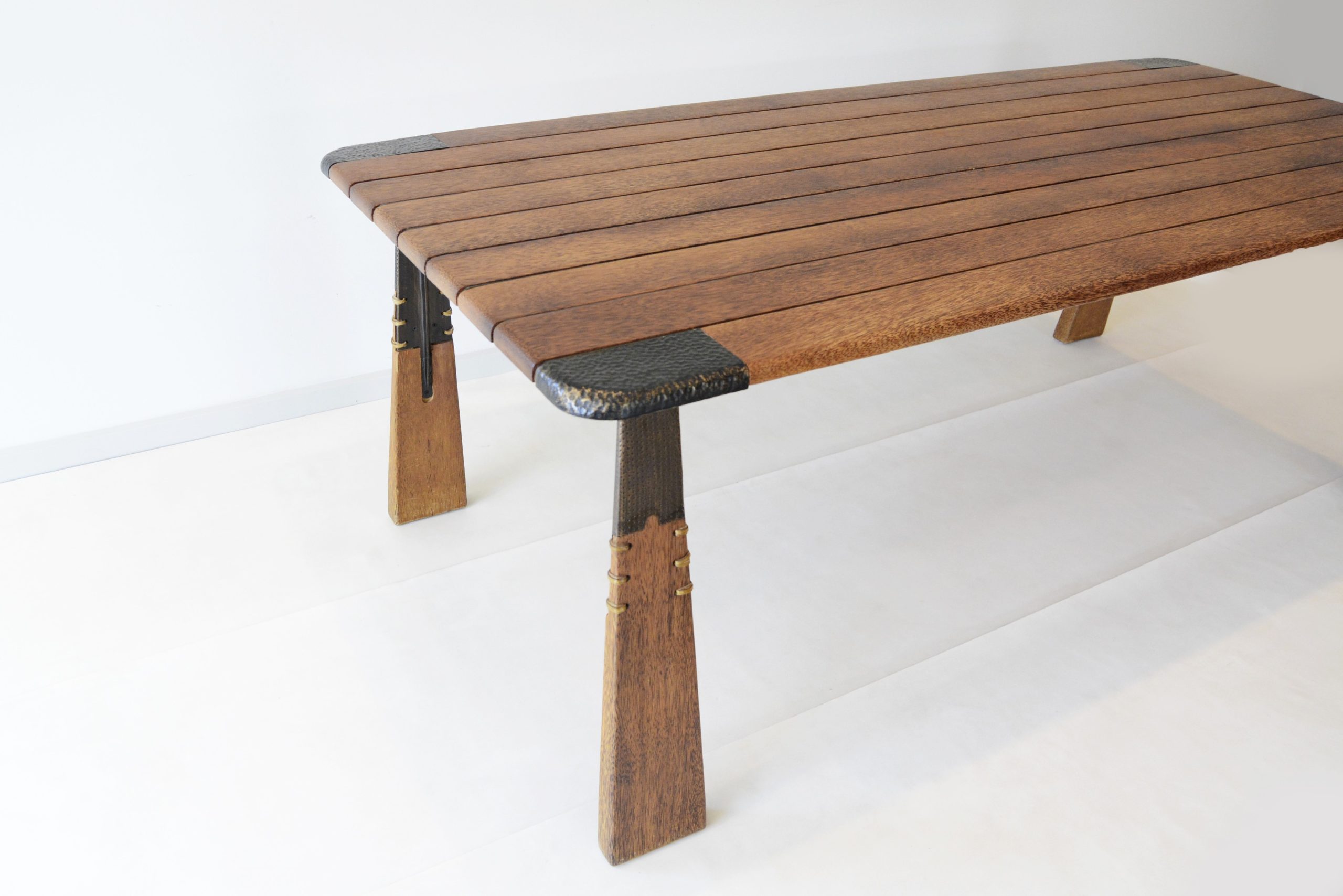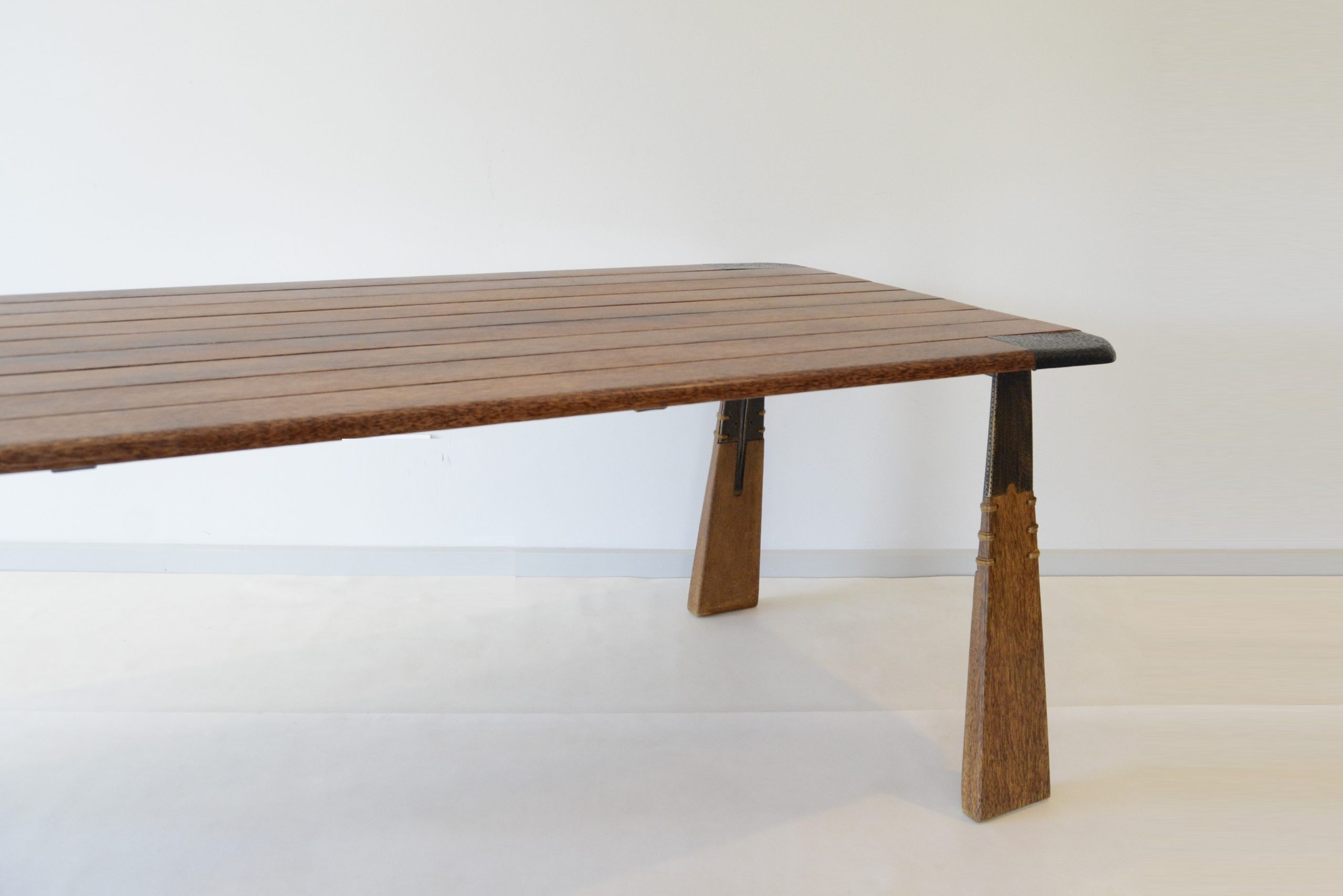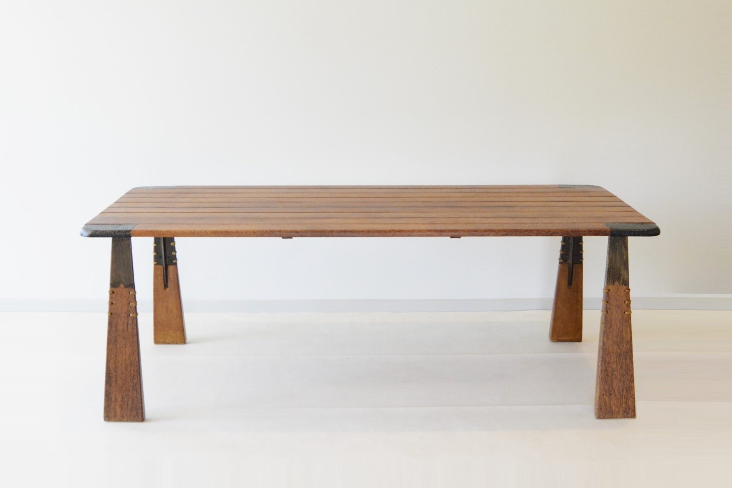 This is the “Verite” dining table design, one of Pacific Green’s newer designs. I’m pretty sure this design was released about 10 years ago. I think it’s the best dining table design Pacific Green has ever done. I love the hammered bronze detailing and shape of the legs- the angular design here gives the piece an architectural slant. And obviously the quality is exceptional. This piece is SOLID timber- no shitty Parker veneer here and the steel sub-structure creates a table of unmatched durability. This piece is almost impossible to break. And the solid timber top means it can be sanded and refinished whenever it needs it but after 8 years of solid use all it needed was a polish- as the photos show, it presents beautifully, ready for its next custodian. Our reserve price offers an exceptional investment- at less than ONE THIRD the new retail price, this table would be below cost price to make it.