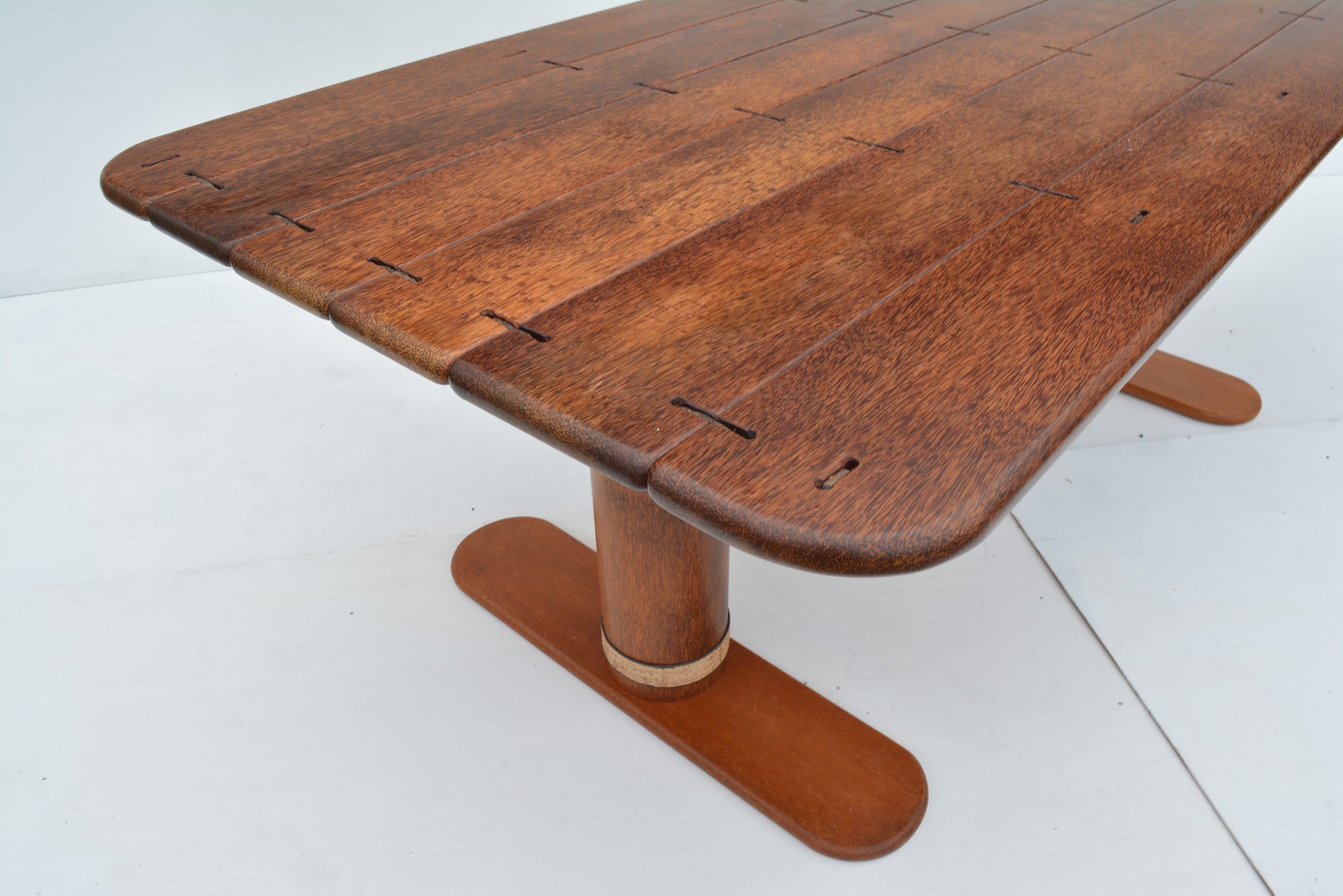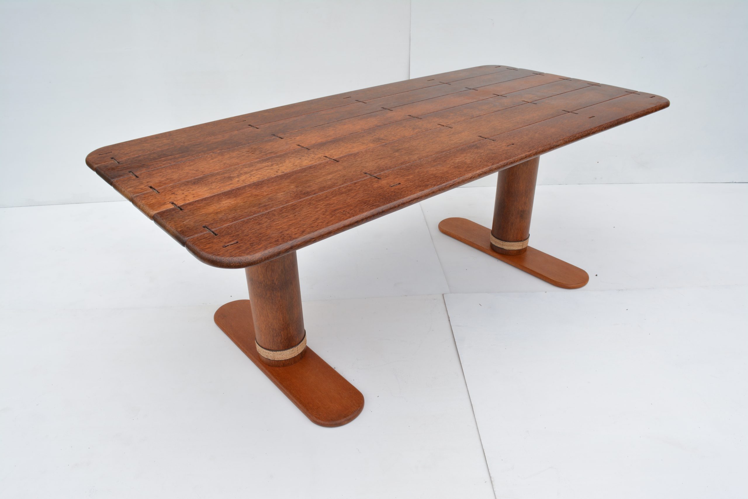 Okay, I must talk about the table on offer here. (Sorry for such a long-winded affair but the Pacific Green story needs to be told.) The thing is the design sells itself- it’s this story behind the table that needs to be told. You can see from the photos the table is the highest quality. The twine that connects the planks of coconut timber gives the piece an interesting slant but it’s not over the top- this handiwork sets it apart. The two trunk sections add to the effect yet still contribute to a “clean” designer look.