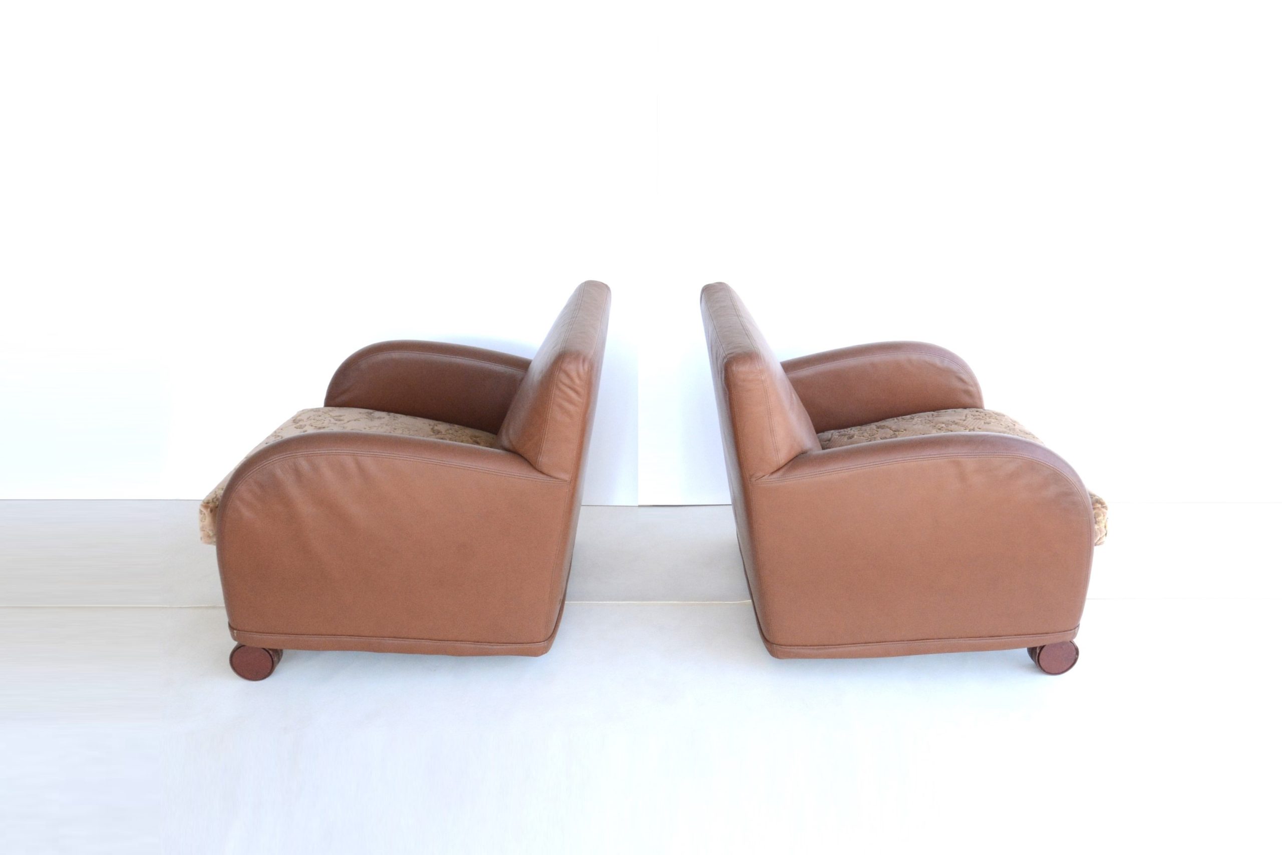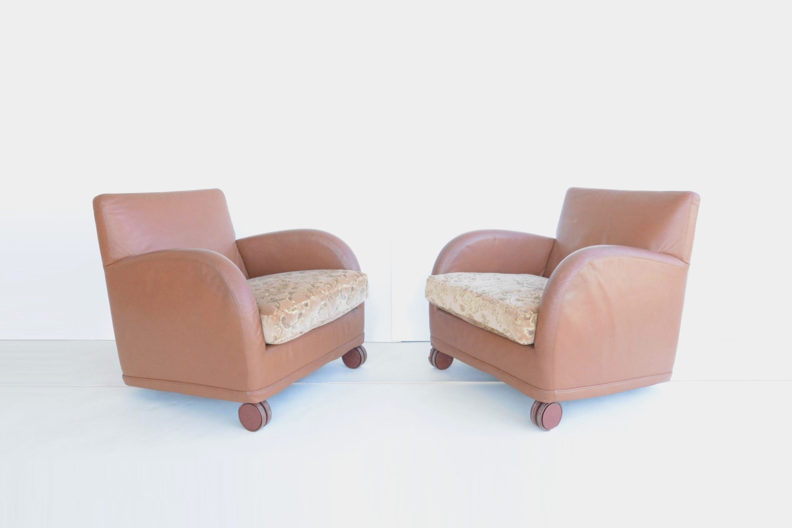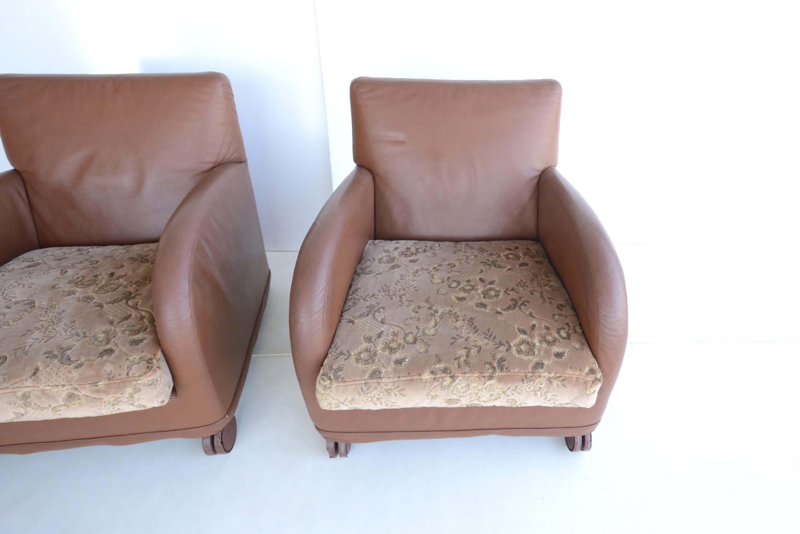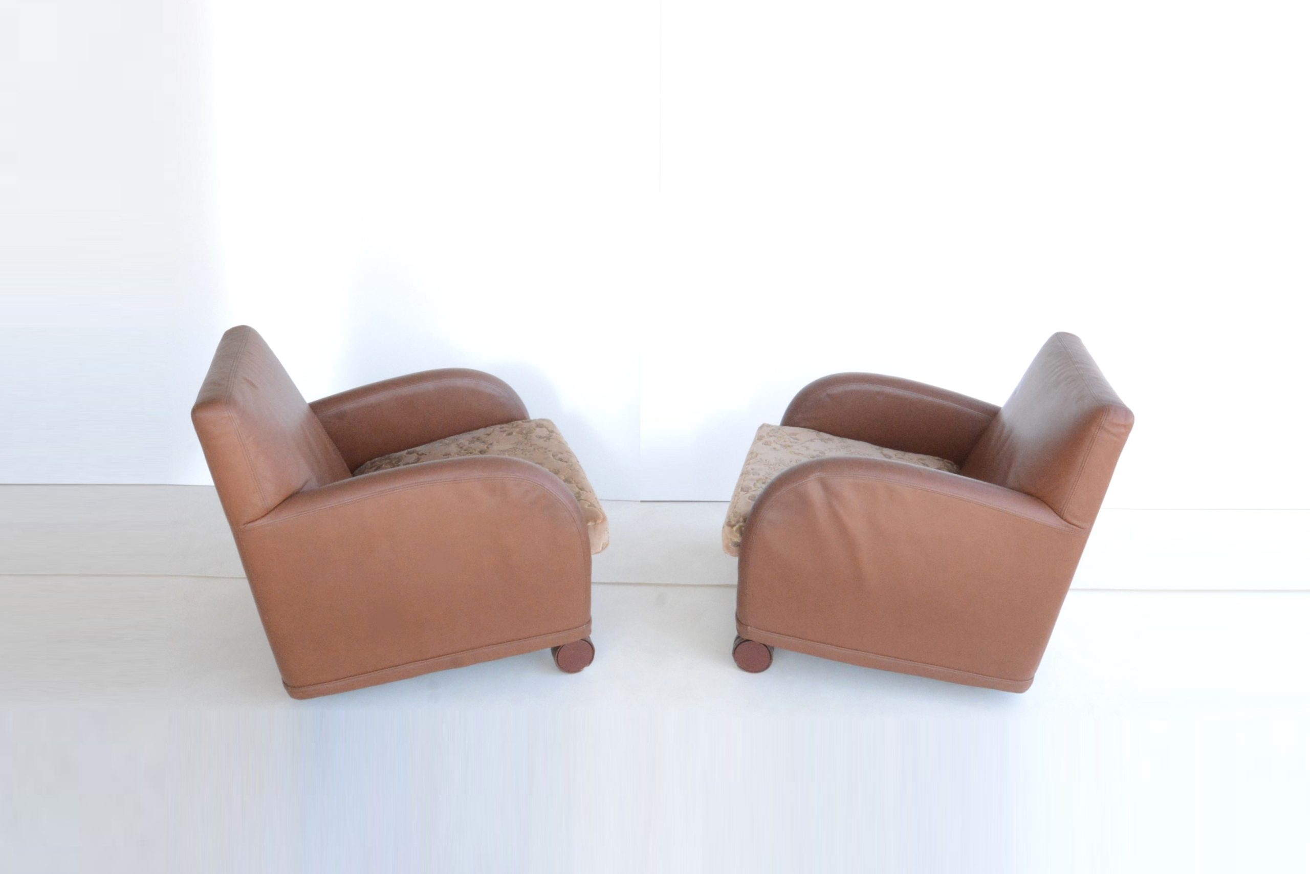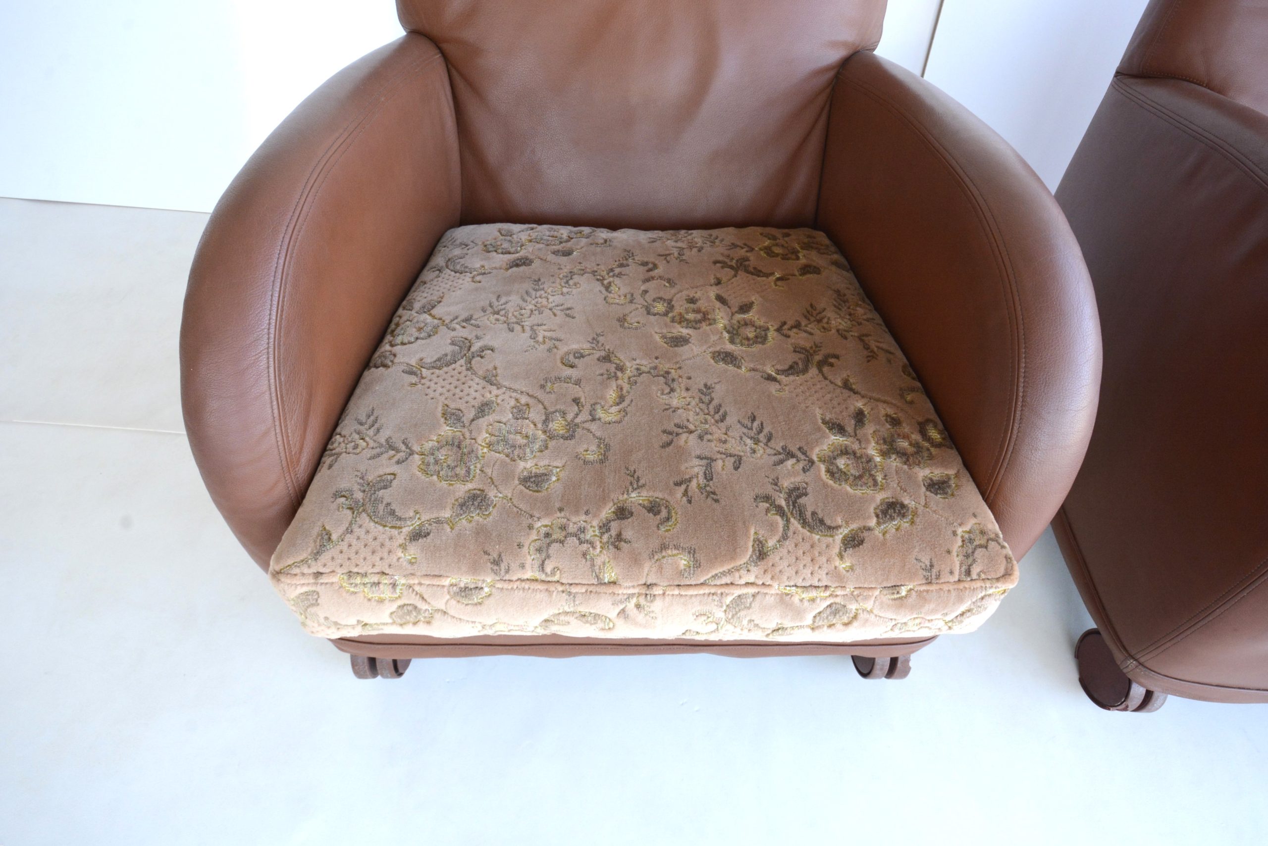 I love the curves, the Damask fabric on the cushions adds a touch of opulence and the Memphis design vibe gives this pair a unique designer style. The curves and circles offer a pleasing look that’s soothing and calming. The construction is also durable- just look at them after about 40 years of use! B & B Italia has long been heralded for quality- the “Sity” designs certainly maintain that legacy. The full-grain Italian leather also looks great after all these years.