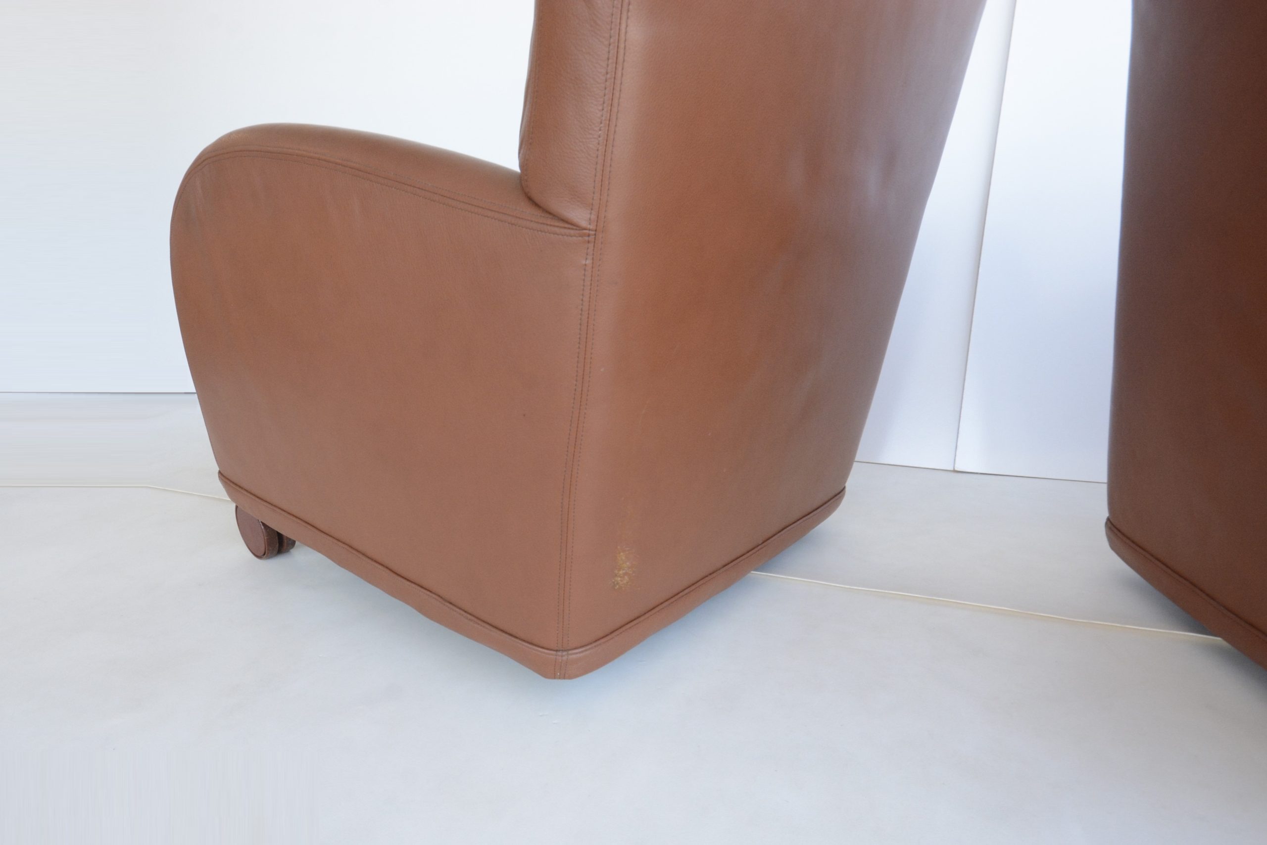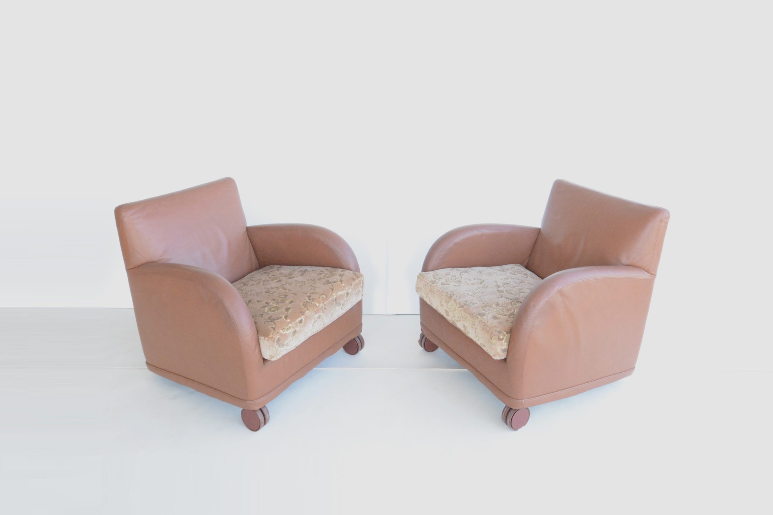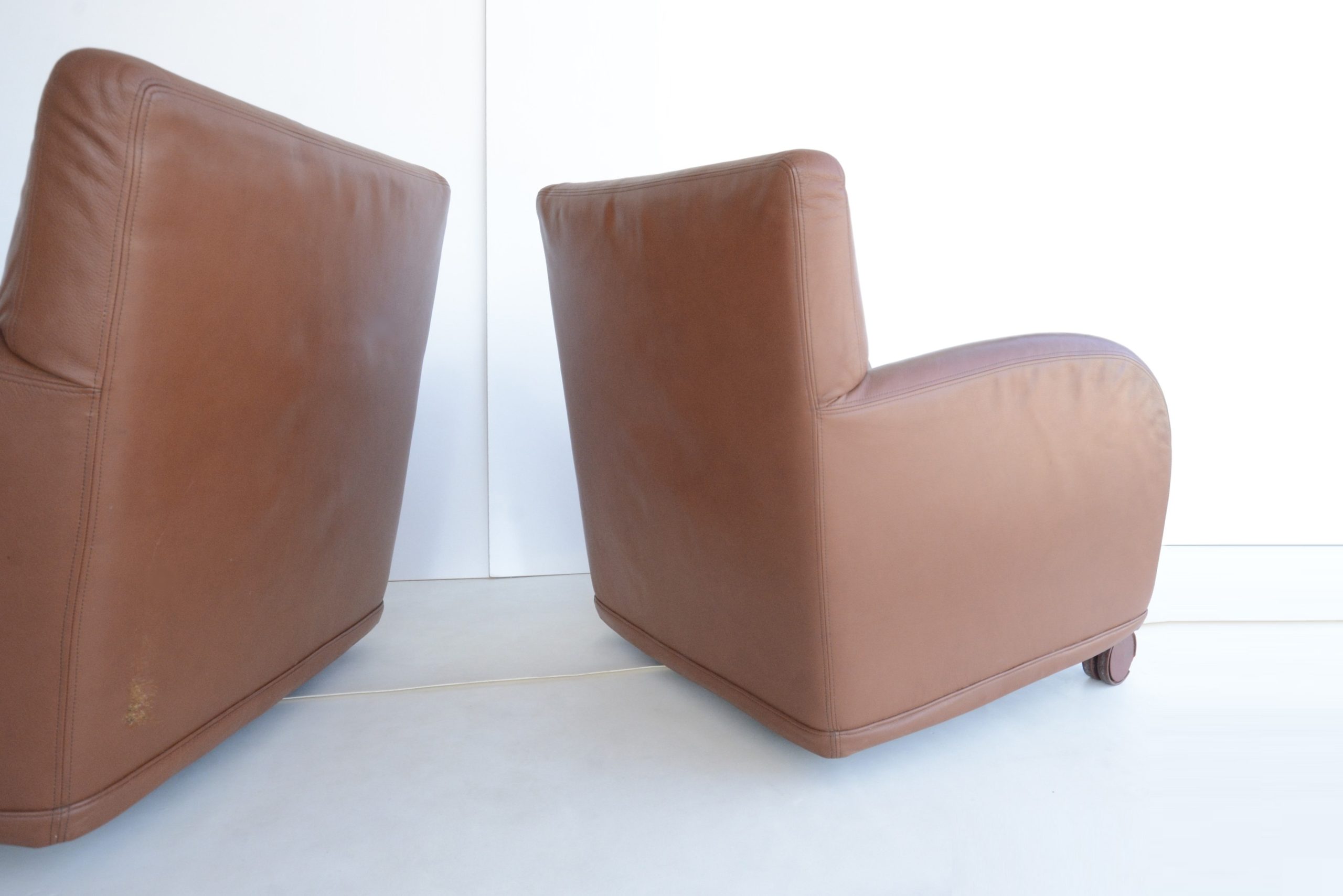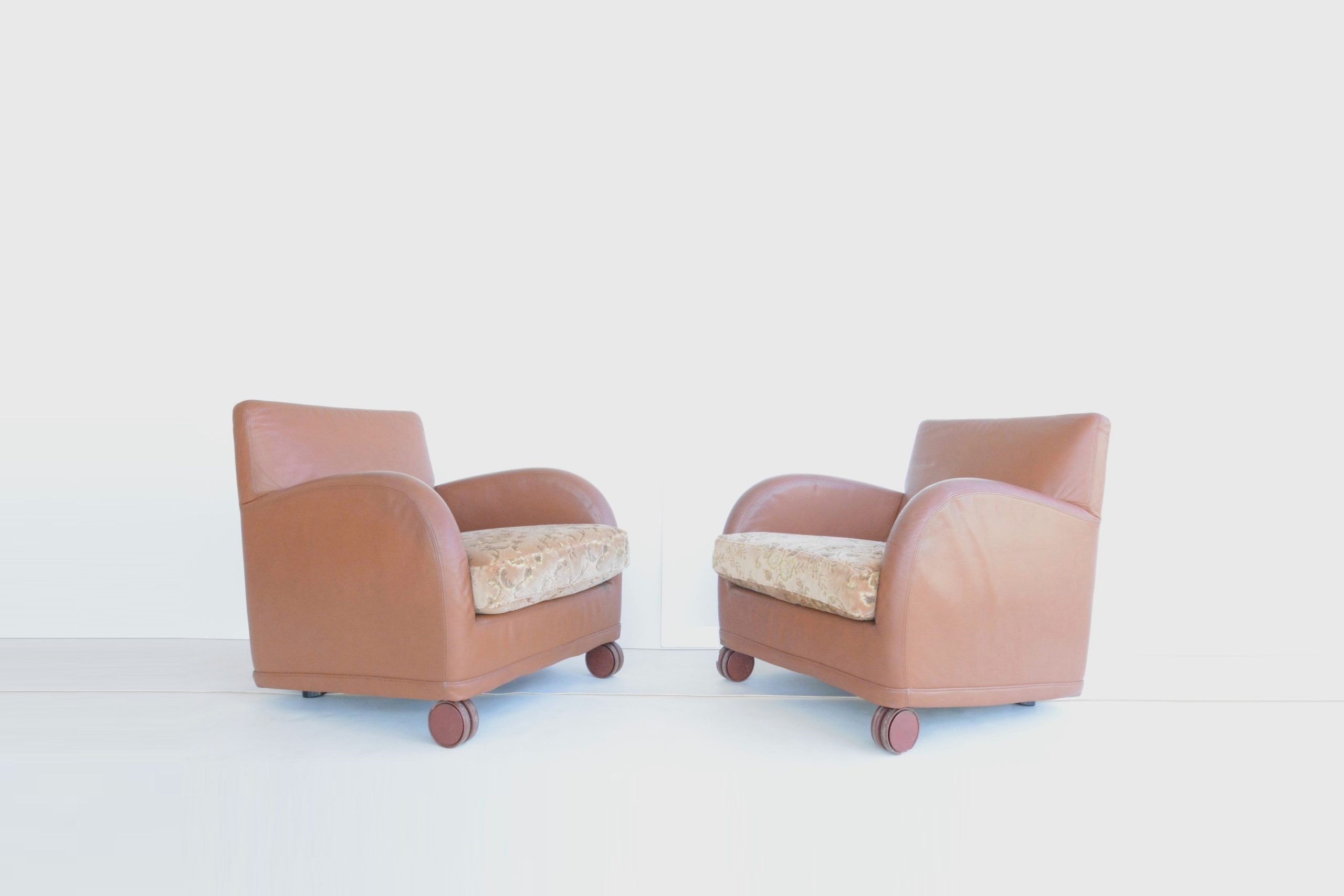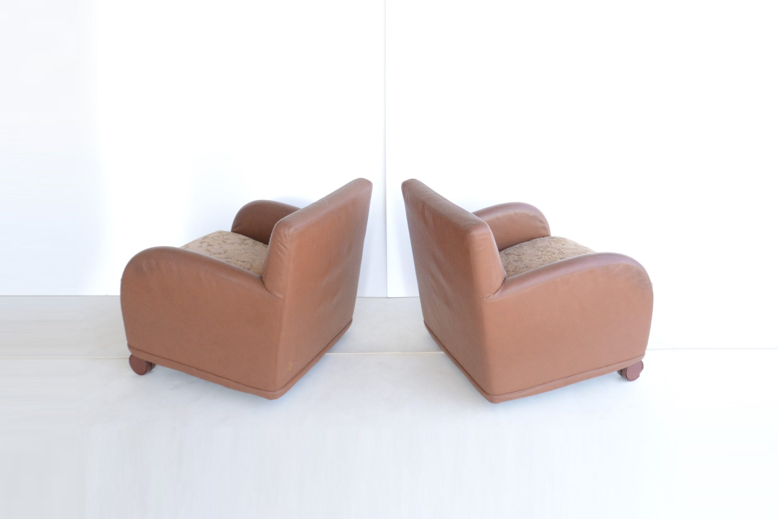 I love the curves, the Damask fabric on the cushions adds a touch of opulence and the Memphis design vibe gives this pair a unique designer style. The curves and circles offer a pleasing look that’s soothing and calming. The construction is also durable- just look at them after about 40 years of use! B & B Italia has long been heralded for quality- the “Sity” designs certainly maintain that legacy. The full-grain Italian leather also looks great after all these years.
