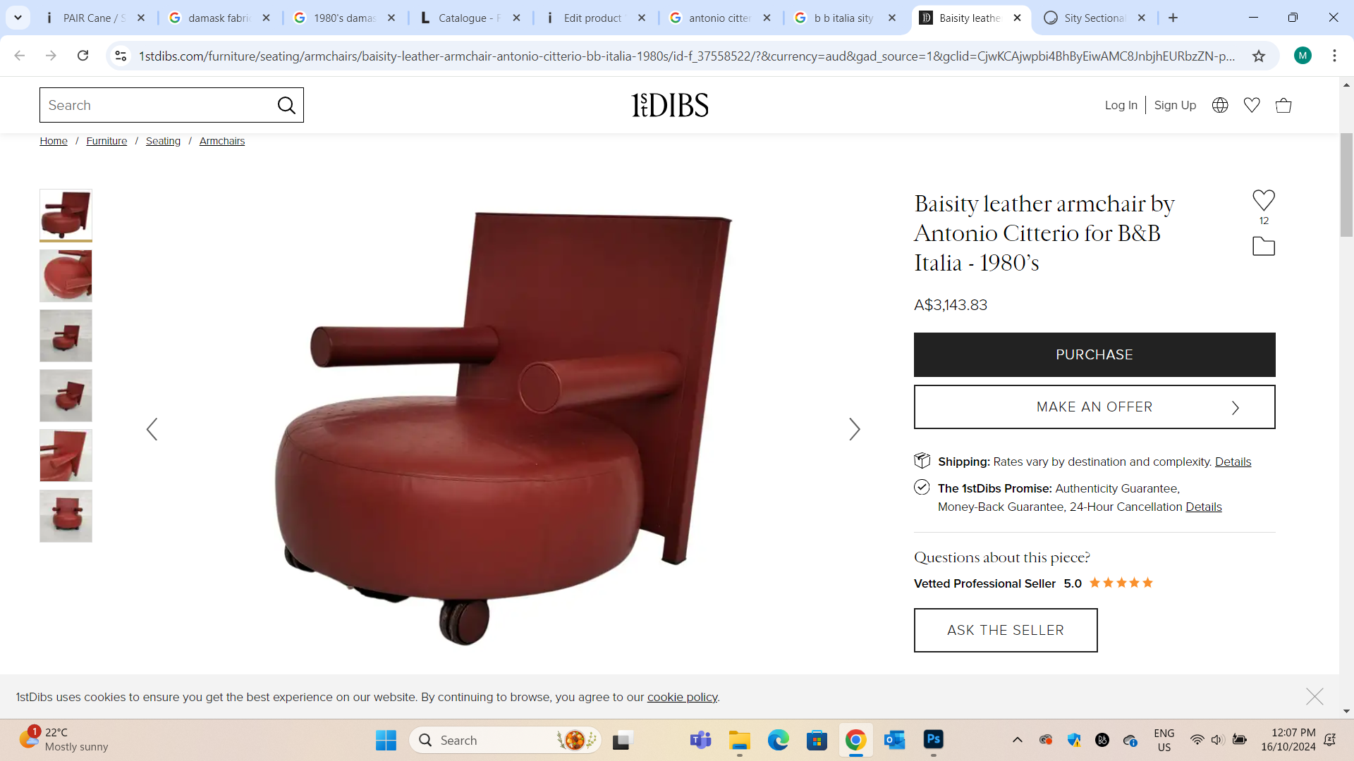 As the photos show, both chairs are in excellent condition. The construction is VERY solid- the frames are heavy and this is quality leather- virtually nothing could happen to this design. The suite is strong and sturdy with NO cracks around any joint, NO movement or wobbles, NO breaks, NO repairs. This pair are about 40 years old so show some signs of use but nothing that draws your eye. I didn't have any leather cleaner in Sydney so they'd likely come up even better with a leather clean. The leather presents well overall. Click on the Magnifying Tool to enlarge each image, then click on the enlarged image to Supersize it. There's nothing unsightly- just what you'd expect after 40 years of use. There is a concentrated area of wear down near the floor at the back of one chair, because it's near the floor and to the side it's not really noticed. This area could be tidied up by a leather technician but I didn't think it was necessary- it took me a while to even notice it. I'd say a leather technician would charge about $140 to get this area looking good again. The outer rim of the wheels has some chipping but this does not affect the function of the wheels at all- the wheels still turn as they should. This also took me some time to notice as the wheels are under the chair. The Damask fabric is in brilliant condition- it looks great. _____________________________________________________________________________________________________________________________________________________________________________________