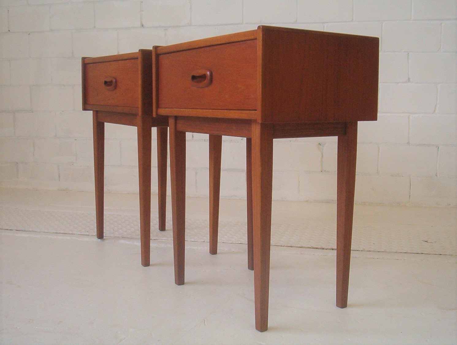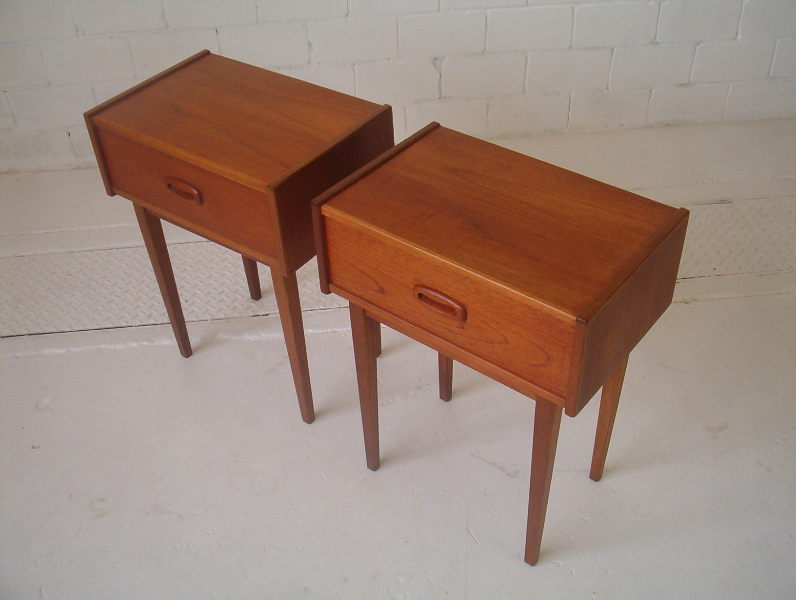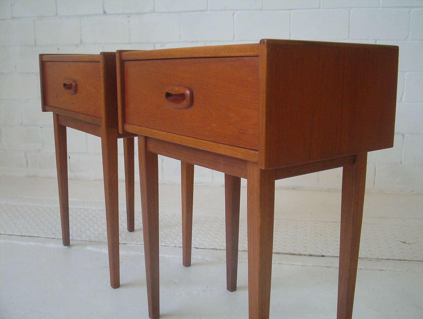 A stylish PAIR of 1960s bedside cabinets with the sleek lines and beautifully refined style of Danish furniture. These were made by PARKER Furniture in the early 1960s when Parker was doing some of their best work. I have seen very few PAIRS of vintage bedsides in my time as the PAIR concept on each side of the bed only became popular in the late 1980’s. I can confidently say this pair by Parker would be close to the rarest you can get in Australia- the last pair of these I found was about a year ago now. Singles in this design are occasionally found but pairs are near impossible to get- we collected them as two singles and each was found over 6 months apart. This vintage pair of bedside tables boast expert construction qualities that has seen Parker Furniture emerge as an Australian market leader in furniture. This is a great furniture investment for the astute buyer as vintage PAIRS are always sought after but rarely found. One of these tables has the original PARKER foil tag from the 60’s which further strengthens the investment appeal.