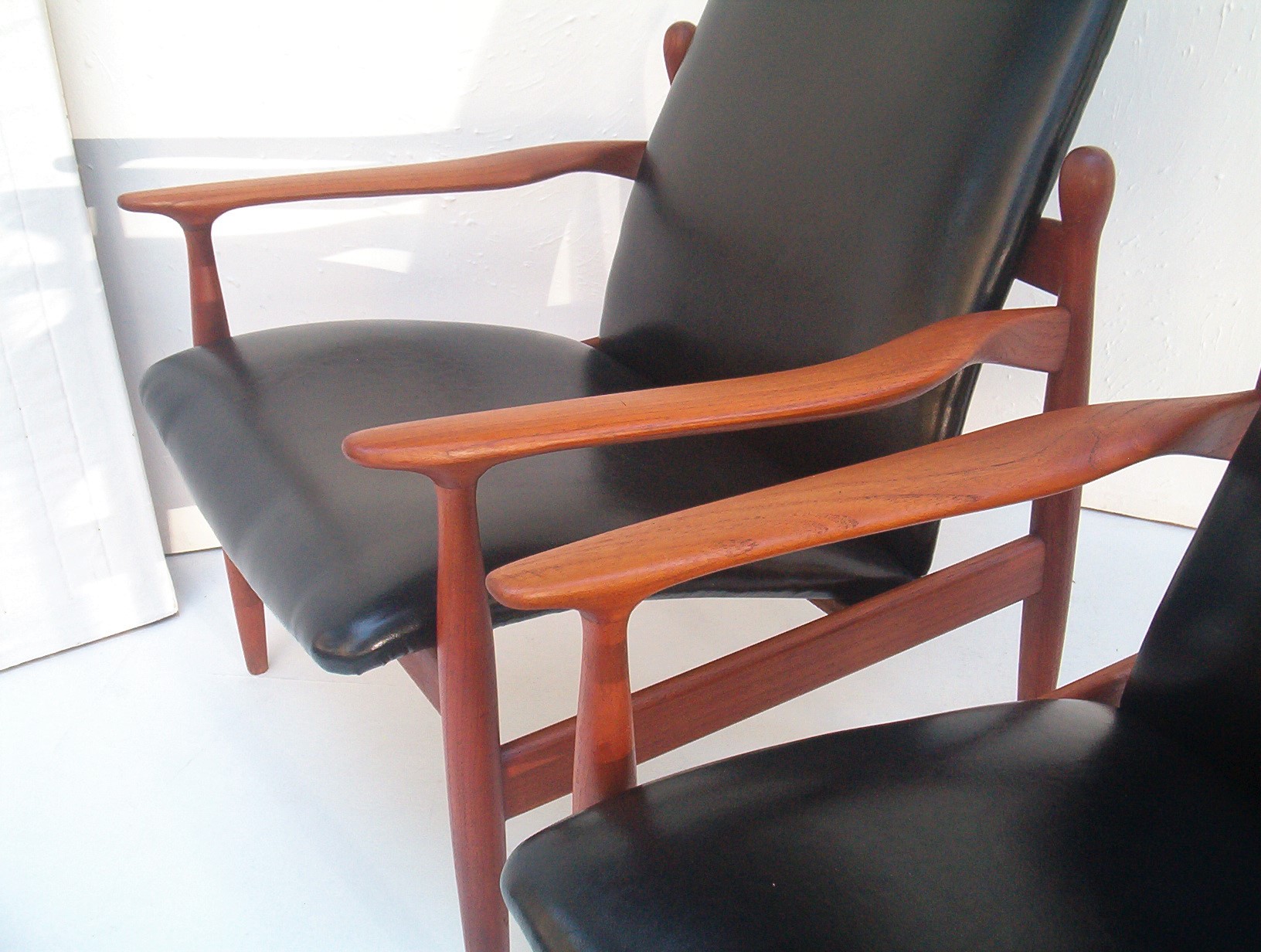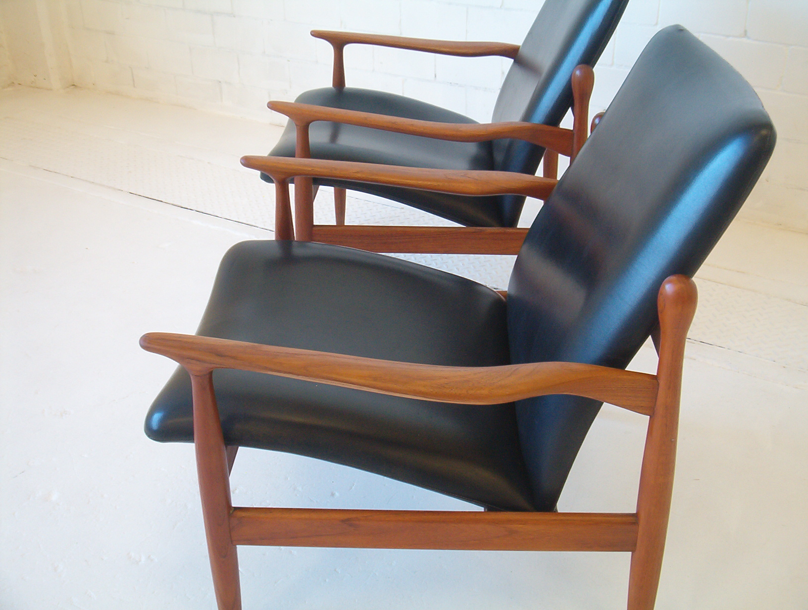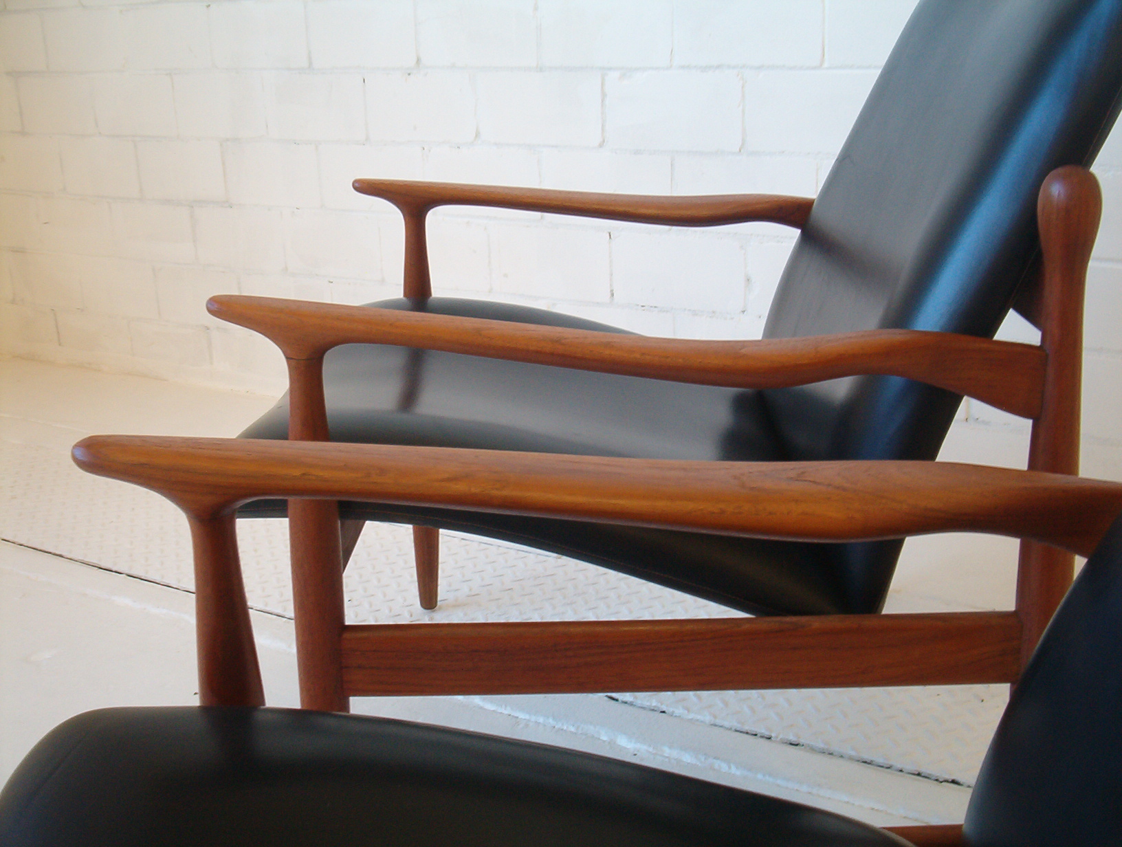 When I first saw these my heart skipped a beat- I thought they were the first Finn Juhl armchairs I’d ever seen in the flesh. I soon realised they were not Juhl pieces but are in fact very rare Parker pieces. I have been actively searching for this type of furniture for five years and this is the first time I’ve seen this particular design by Parker (I haven’t even seen a photo of them before). In my opinion this is the very best work Parker did and in fact of the era. The sculptural elegance of these chairs and the stunning fluidity put this pair in a league of their own. These have obviously been inspired by Juhl’s work and to be honest I am in awe of how Parker have pulled this off. Refined elegance, subtle flowing movement in the design and the completely SOLID construction vintage Parker items are renowned for. One of my staff agree that these are just stand-out pieces and amongst the best items we’ve ever stocked. These are a very solid investment, it’s a design you will probably never see again and in a very popular style that can’t be readily reproduced. If chairs of this quality were made today they would fetch at least $3000 to $4000 the PAIR because there’s a lot of work involved- much of it done BY HAND. These have a lot more work in them compared to any other Parker chair and I’d say the extra cost meant they didn’t sell many at the time which accounts for why there are so few around- a great investment for the astute buyer.