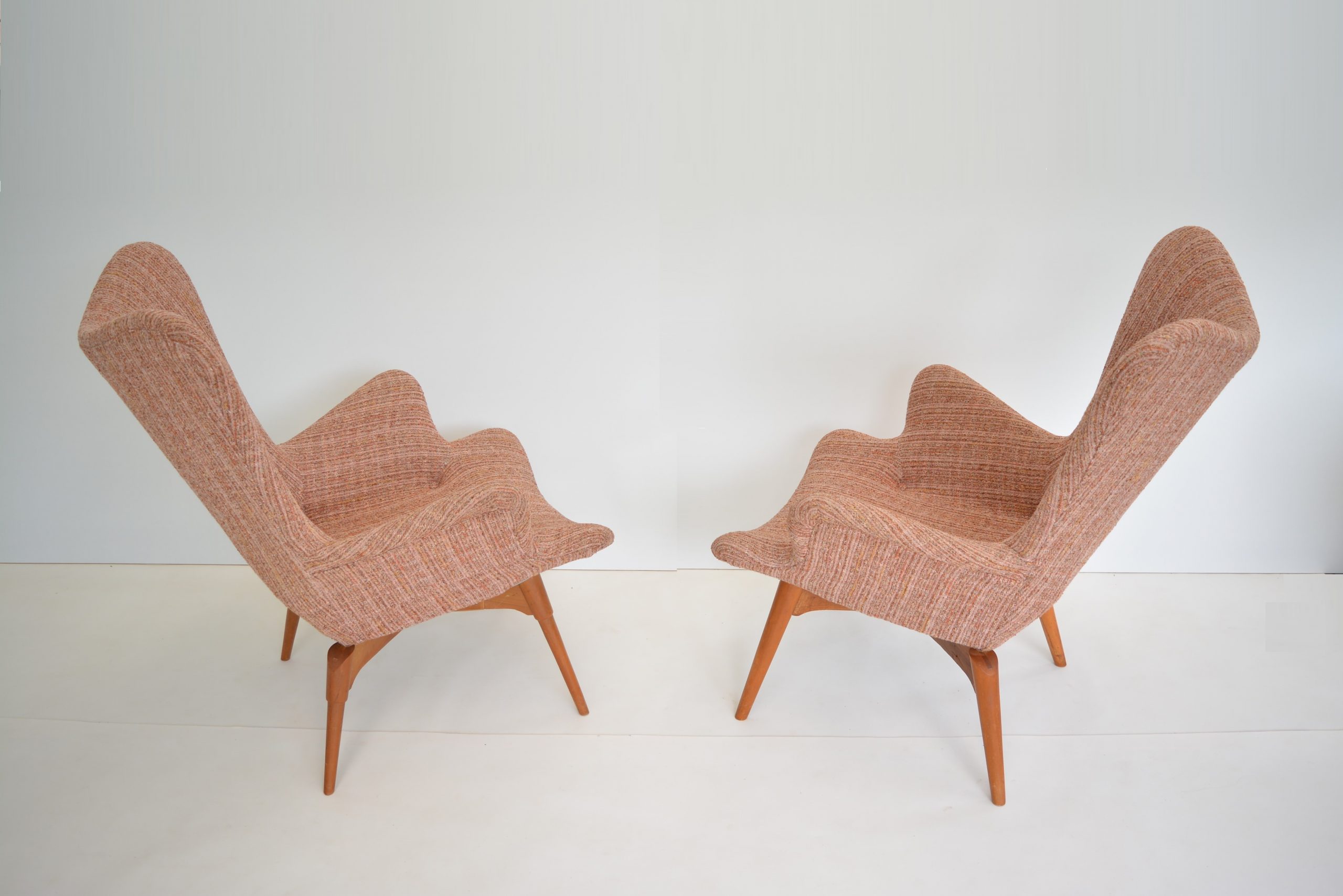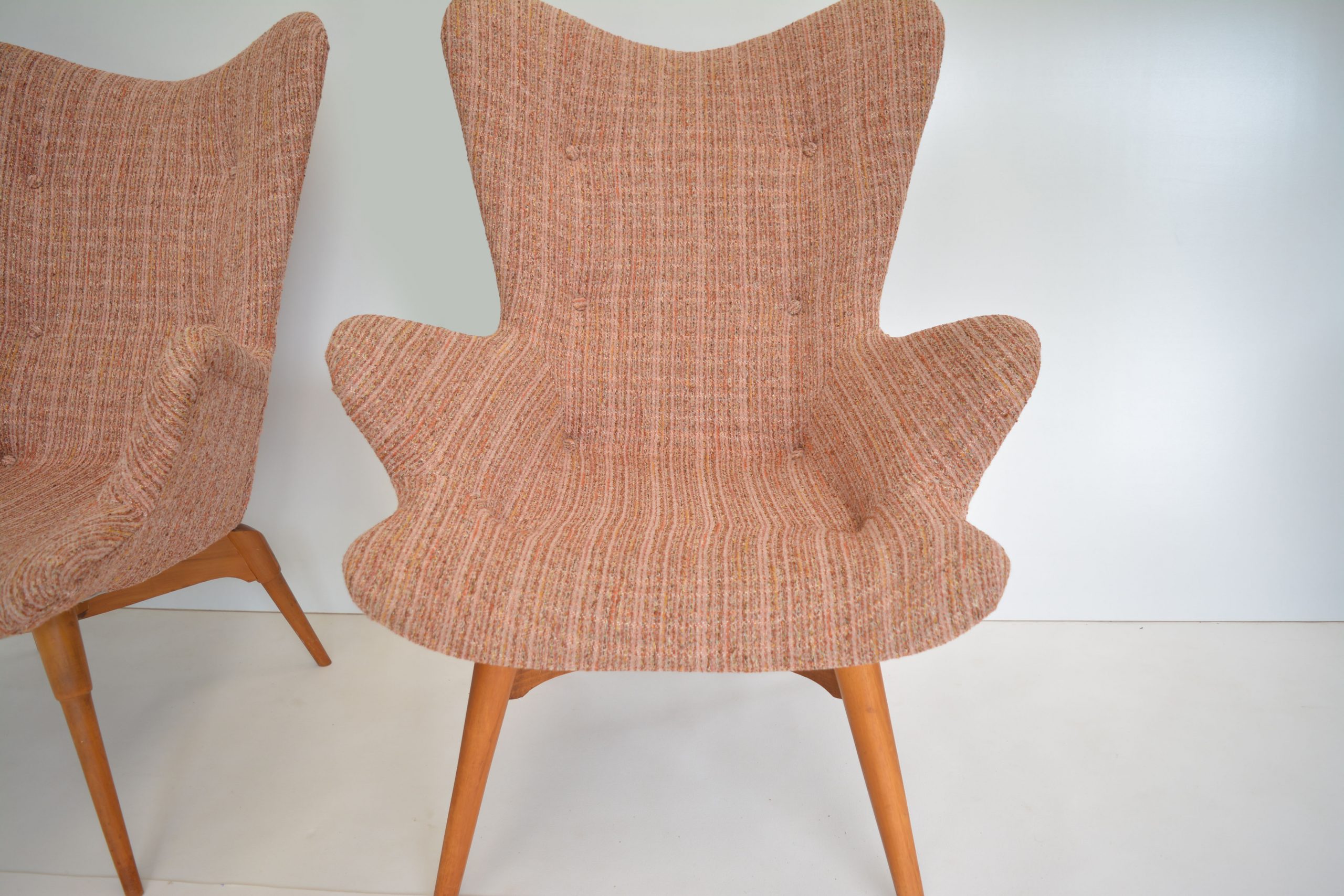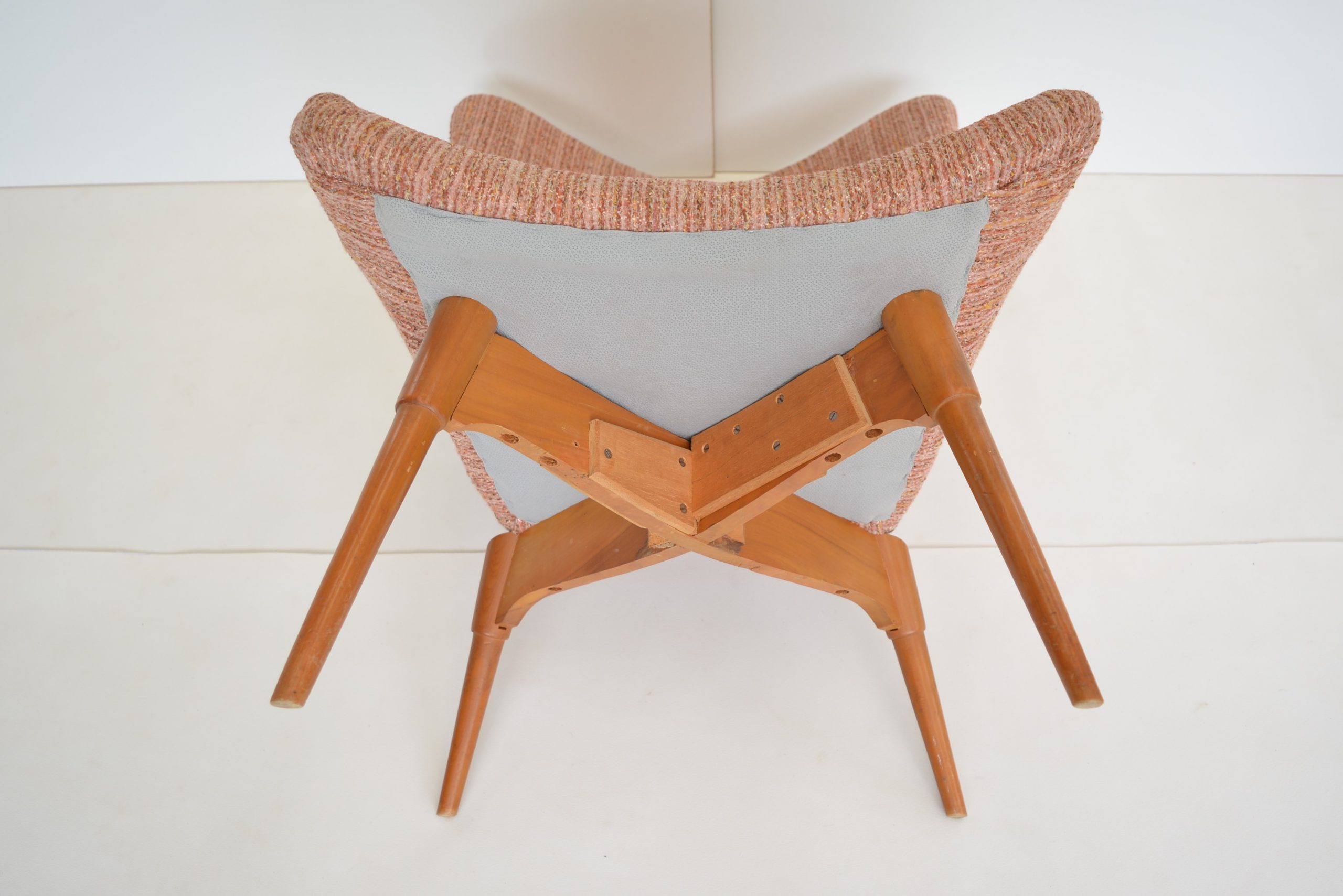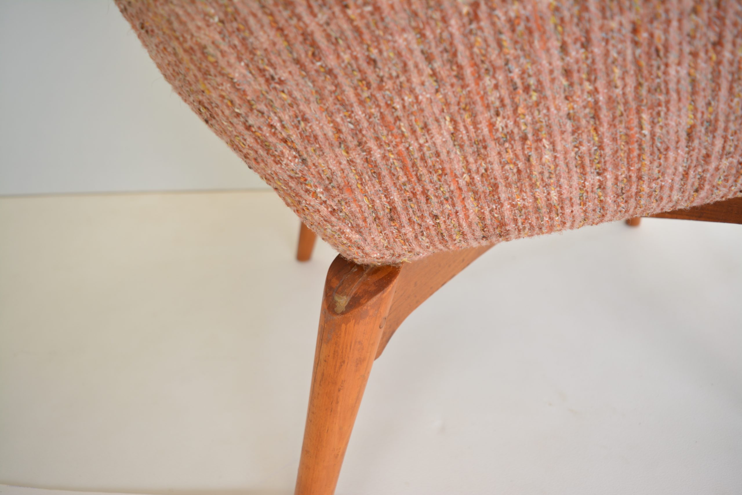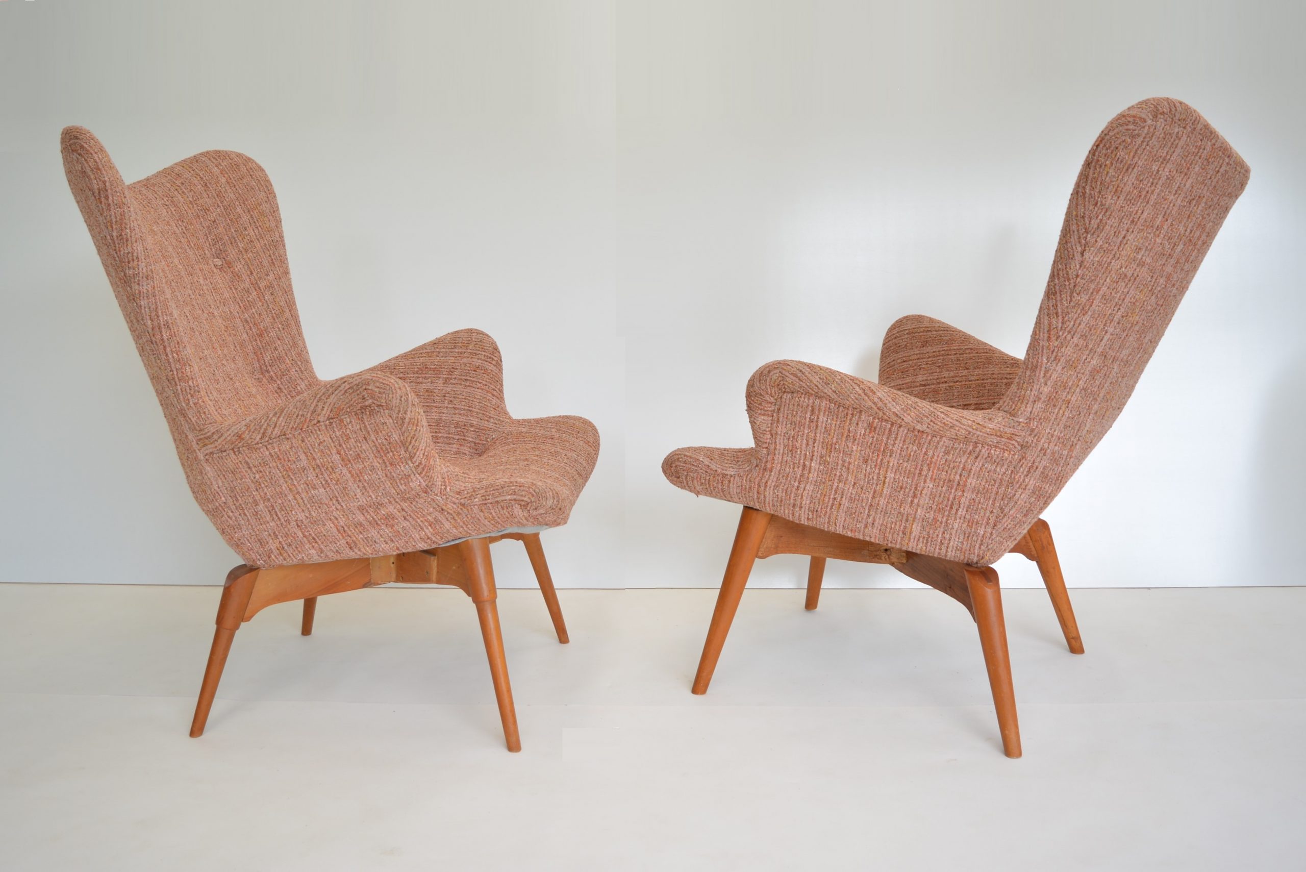 Re-upholstery is never an option for these chairs. It’s a fabric choice you’d want in any space but the retro soft tweed fabric is also inviting to sit in AND still looks brilliant. The originals are almost 70 years old so should have a distinct vintage look. The value of the originals is completely dependent on the upholstery on the chairs. (Featherston originals re-upholstered after the 1980’s will never have the value of these. (None others I’ve come across in over 20 years of trading come close to having the investment appeal of this pair.)