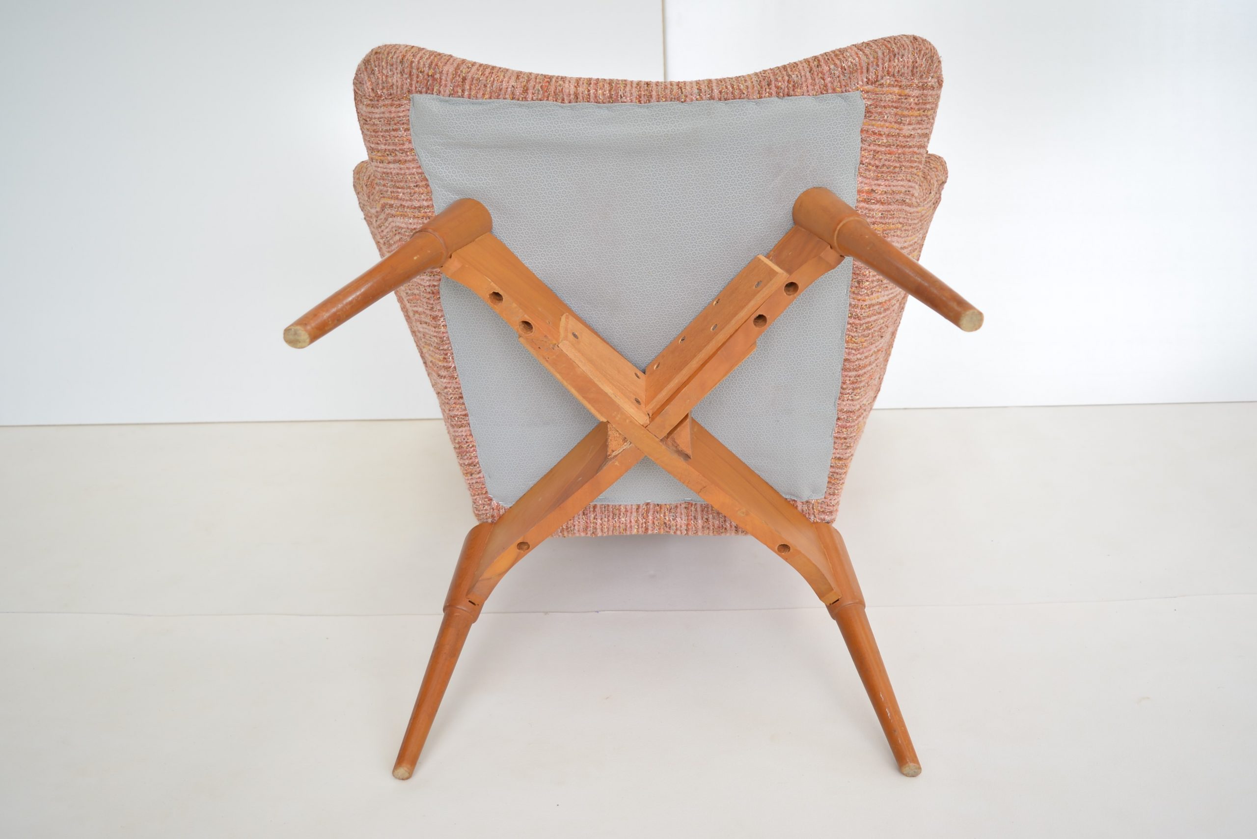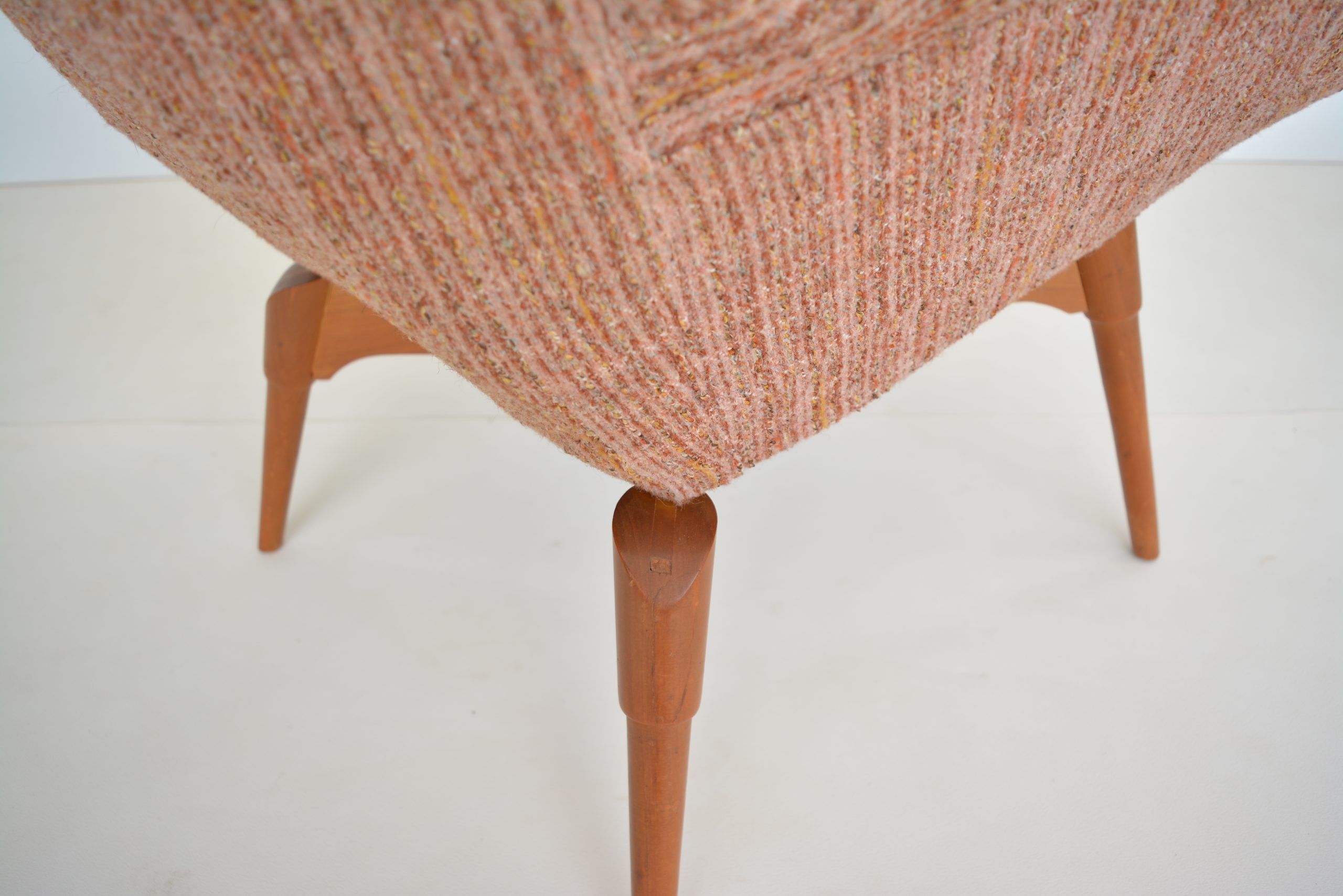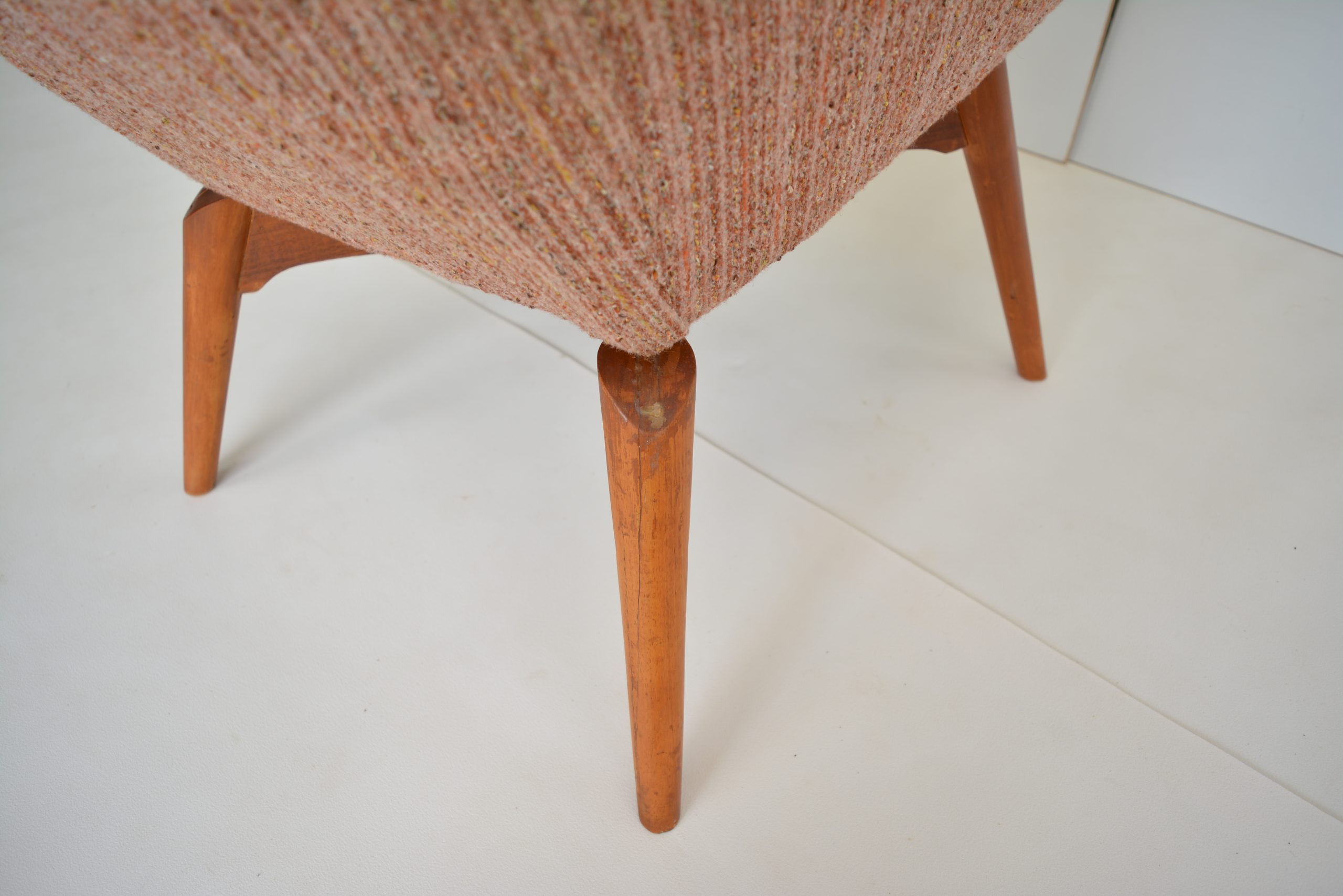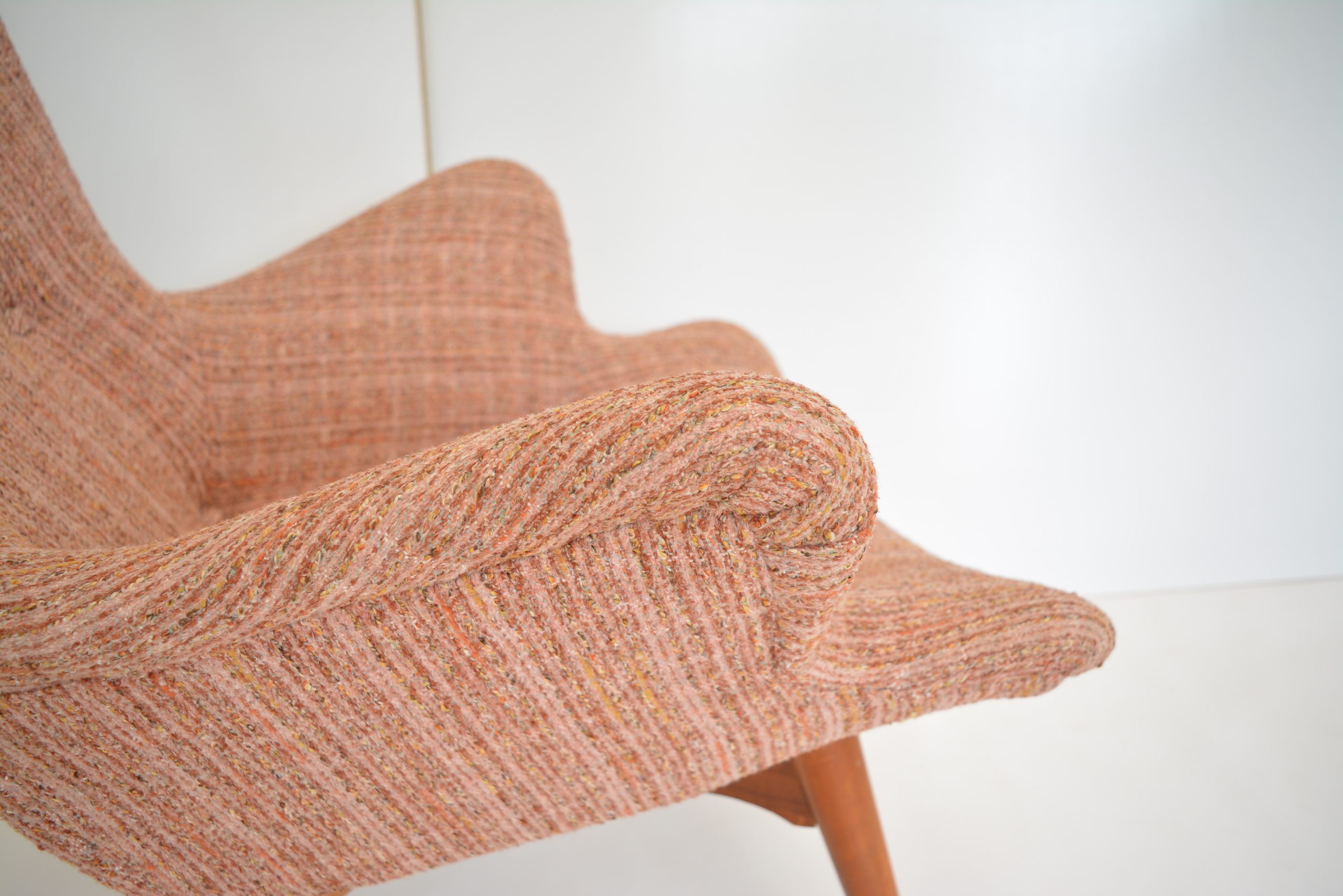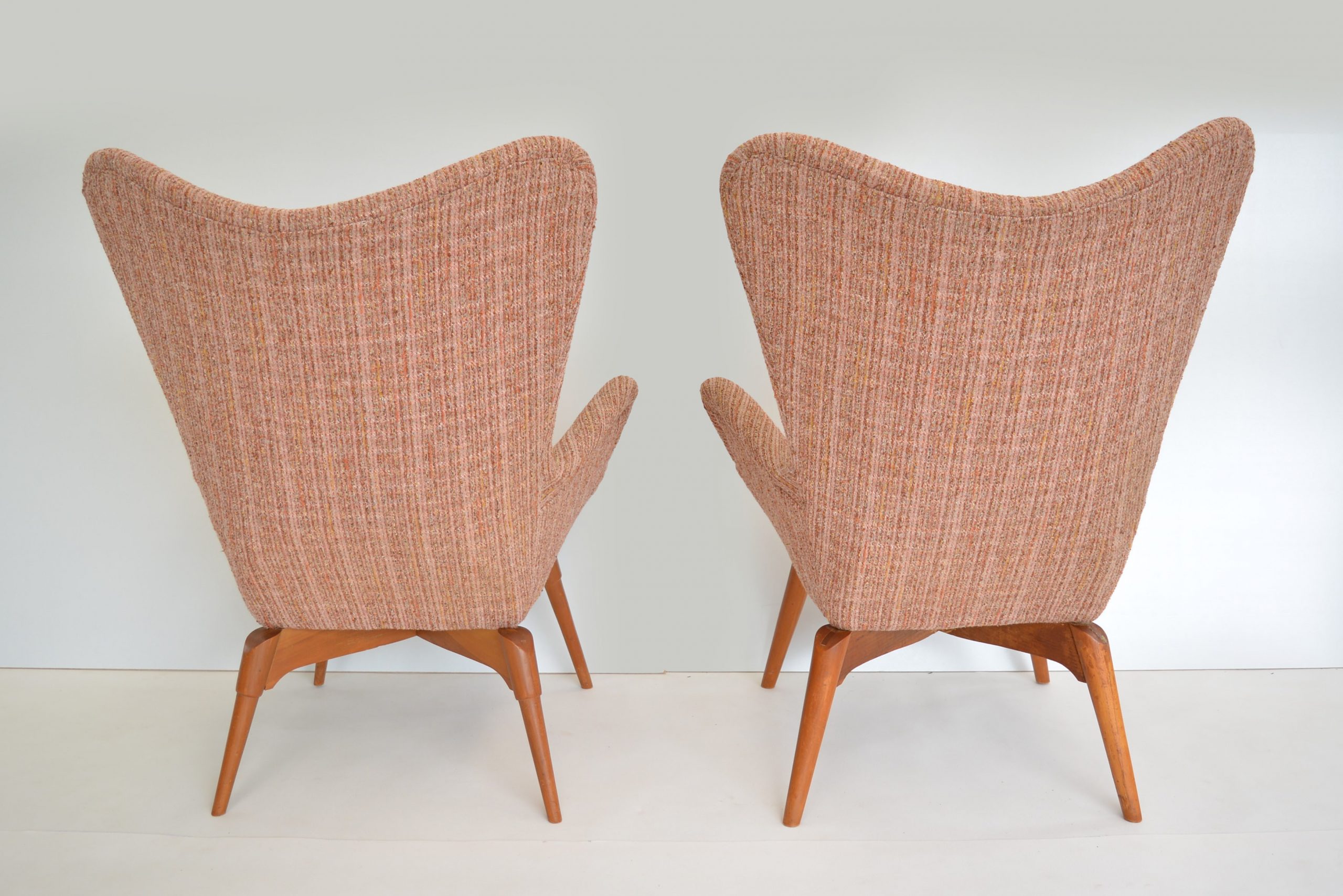 Re-upholstery is never an option for these chairs. It’s a fabric choice you’d want in any space but the retro soft tweed fabric is also inviting to sit in AND still looks brilliant. The originals are almost 70 years old so should have a distinct vintage look. The value of the originals is completely dependent on the upholstery on the chairs. (Featherston originals re-upholstered after the 1980’s will never have the value of these. (None others I’ve come across in over 20 years of trading come close to having the investment appeal of this pair.)