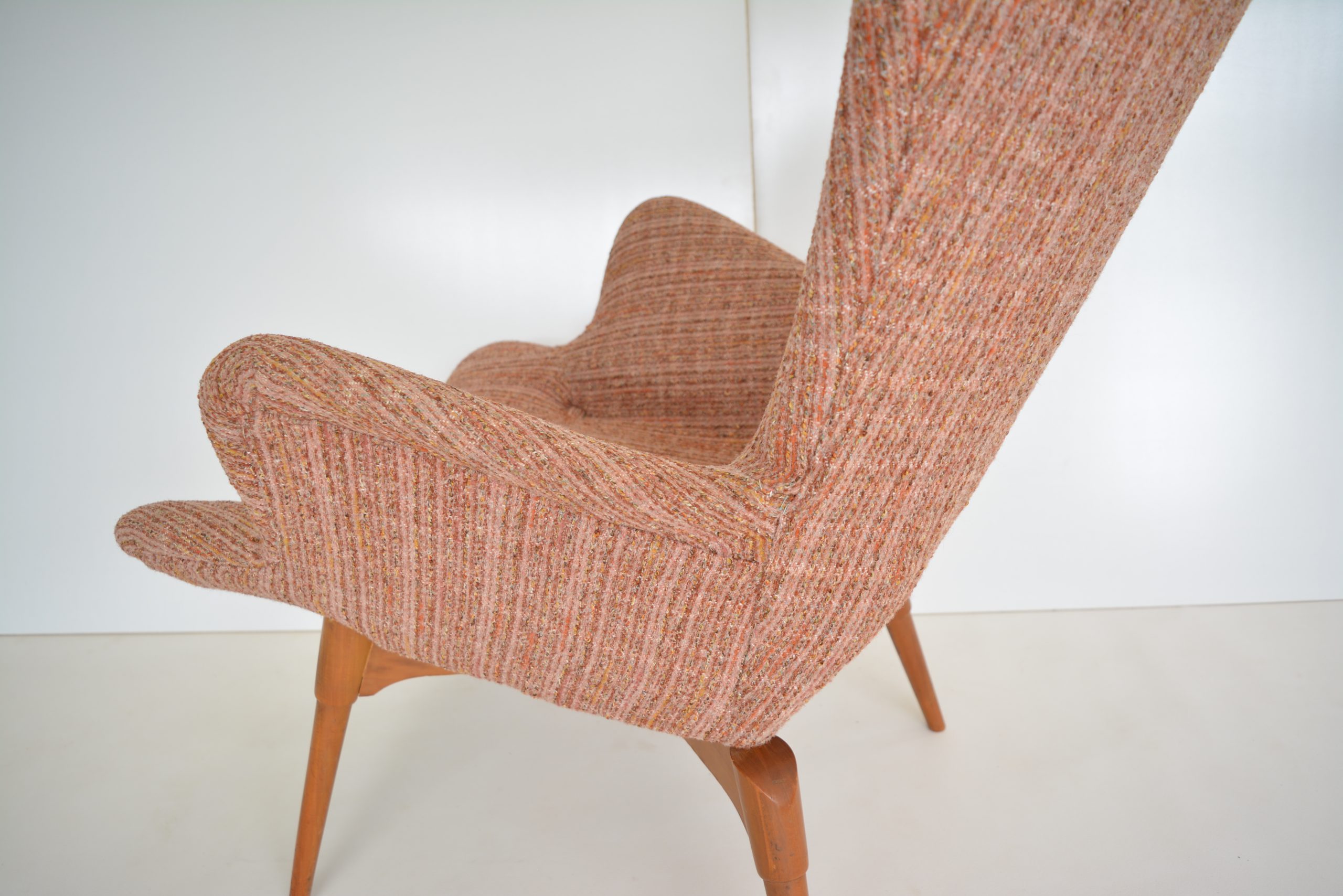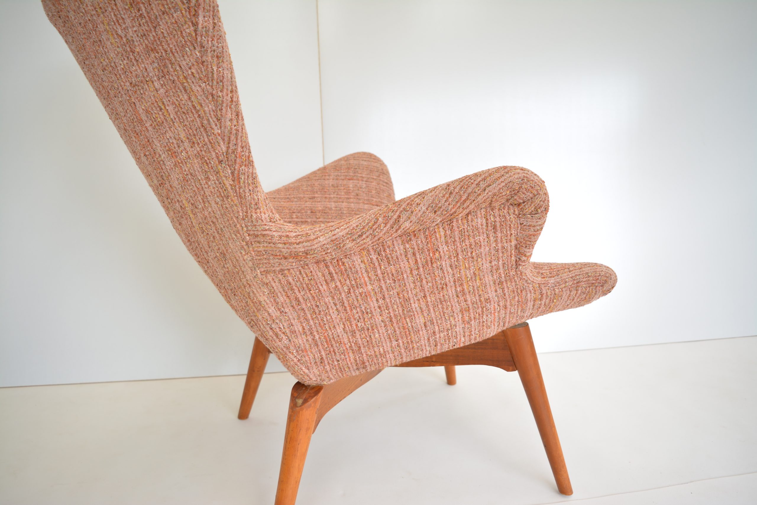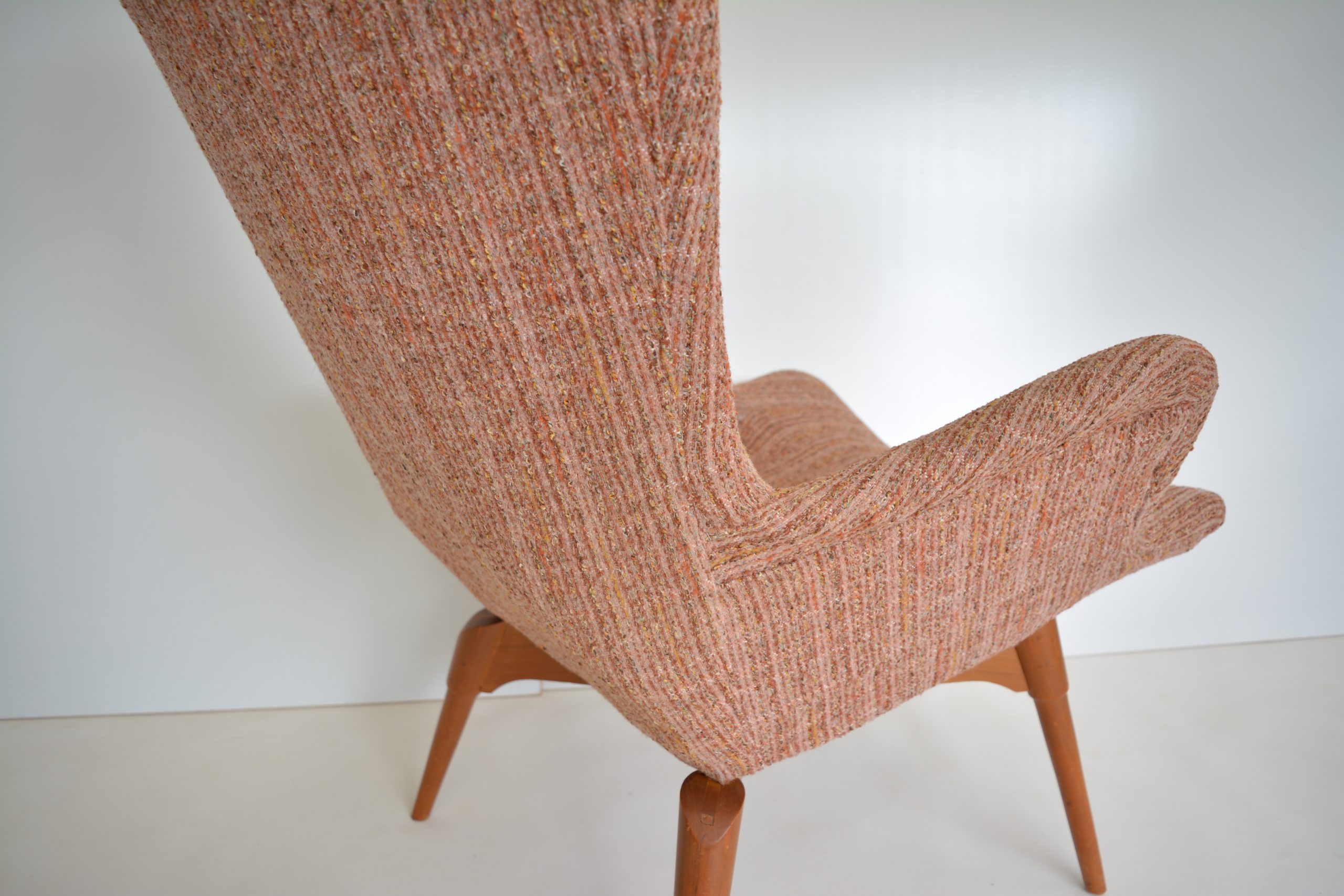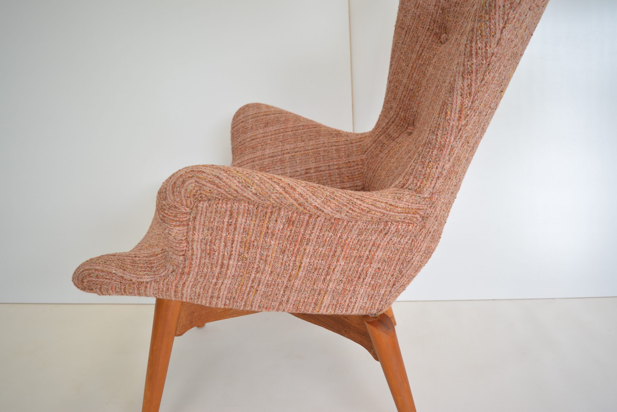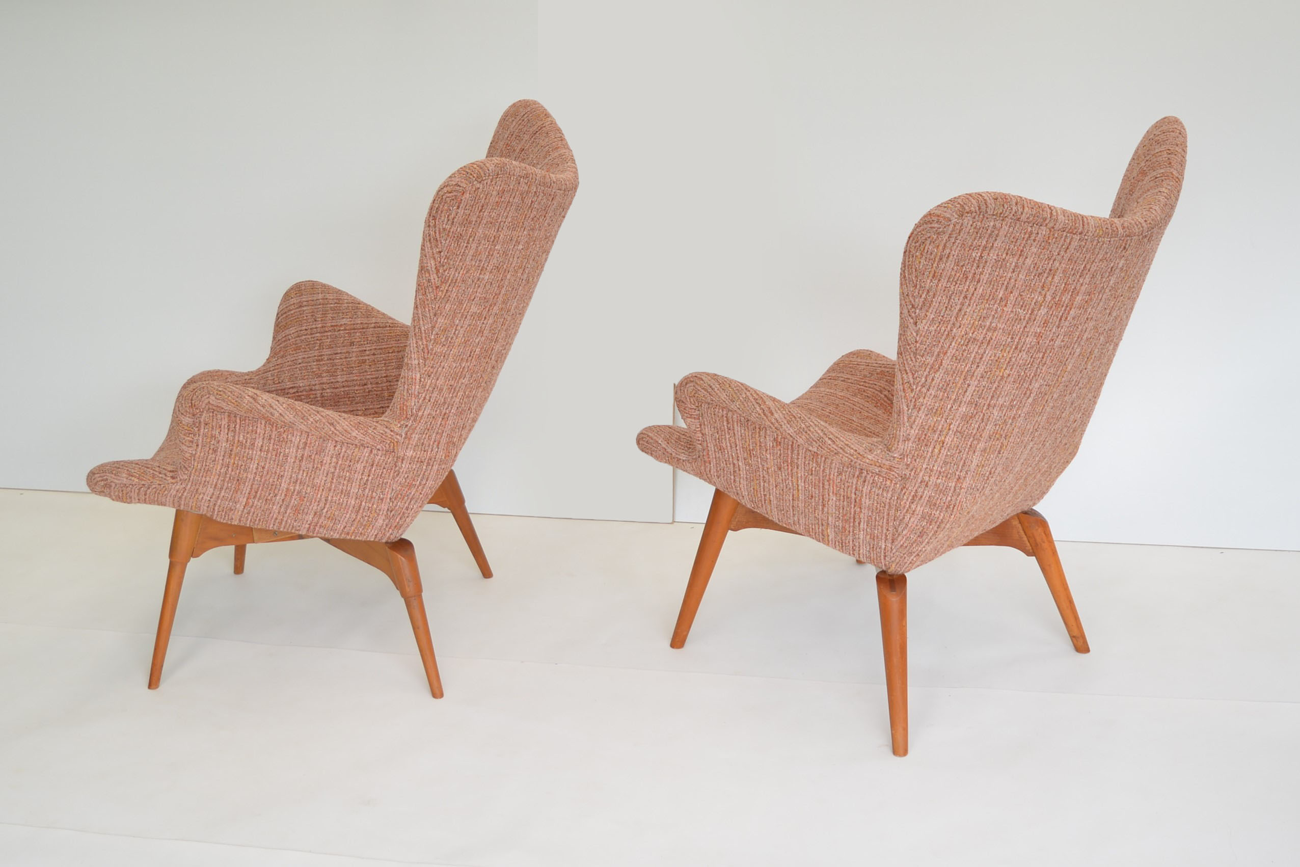 Re-upholstery is never an option for these chairs. It’s a fabric choice you’d want in any space but the retro soft tweed fabric is also inviting to sit in AND still looks brilliant. The originals are almost 70 years old so should have a distinct vintage look. The value of the originals is completely dependent on the upholstery on the chairs. (Featherston originals re-upholstered after the 1980’s will never have the value of these. (None others I’ve come across in over 20 years of trading come close to having the investment appeal of this pair.)