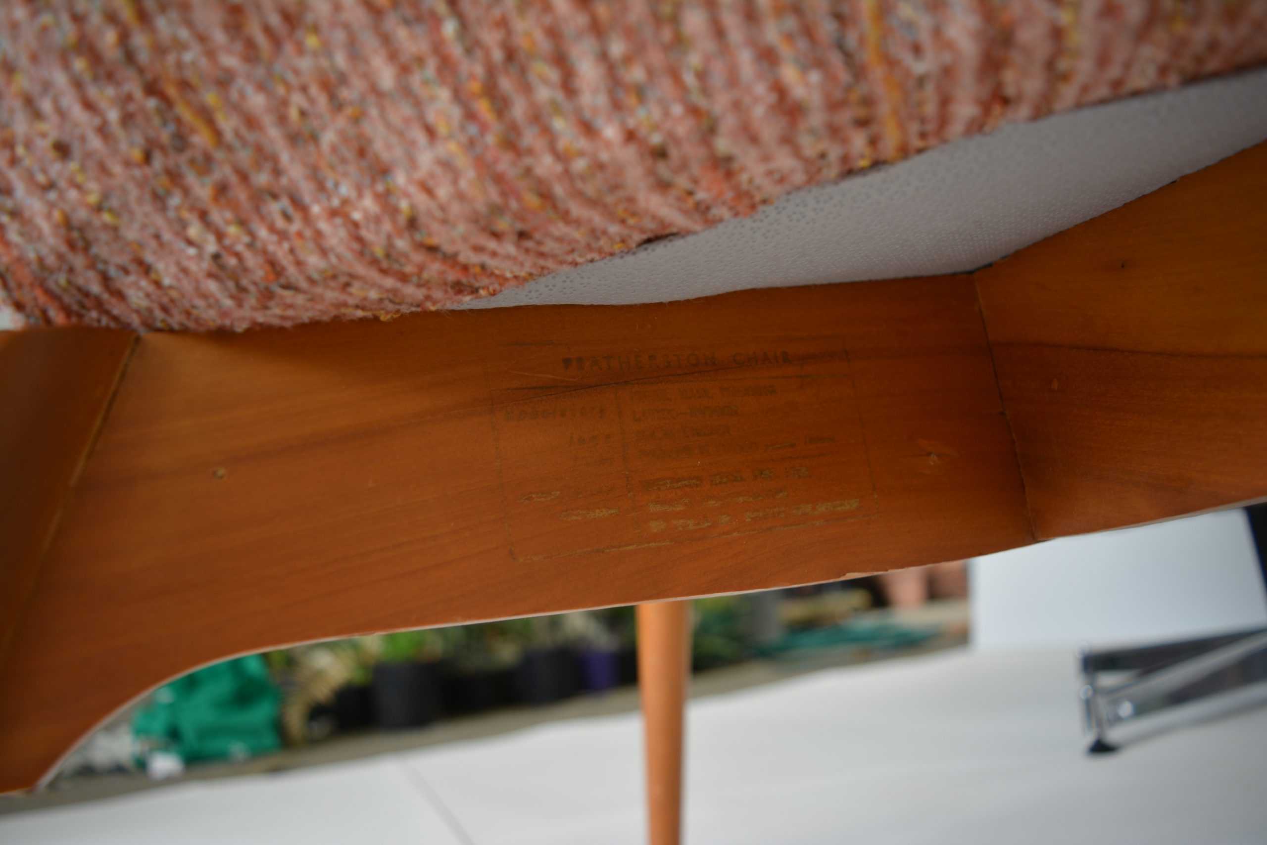 I also need to write about an important part of the story of this particular pair. The base of one chair is good for a Featherston contour chair of this age. The other one had a major base-repair in the early-1980’s. (The one with the repaired base has the original Featherston ink stamp from the 1950’s on it- the other one doesn’t). This means that the stamped one is valued at the same or possibly a bit more than the one without the stamp (even though the base of the other one is in better condition). I personally like the one with the repaired base. Some would say it has been “butchered” and yes I agree but I like the chair just the way it is. I honestly would NOT change this base. The repair is only noticeable when you get on the floor and peer closely at it- please get a life if you do such things! I like the repaired base because it tells another story about this chair and further adds to the history of this piece/pair. Featherston contour chairs are notorious for the poor structure of the bases- the seat section / seat-shells are extremely solid and durable but the same can’t be said for the bases. This one was broken by the people who owned it PRIOR TO the current owners. When that chair-base was broken, the previous owners took both chairs to get restored.