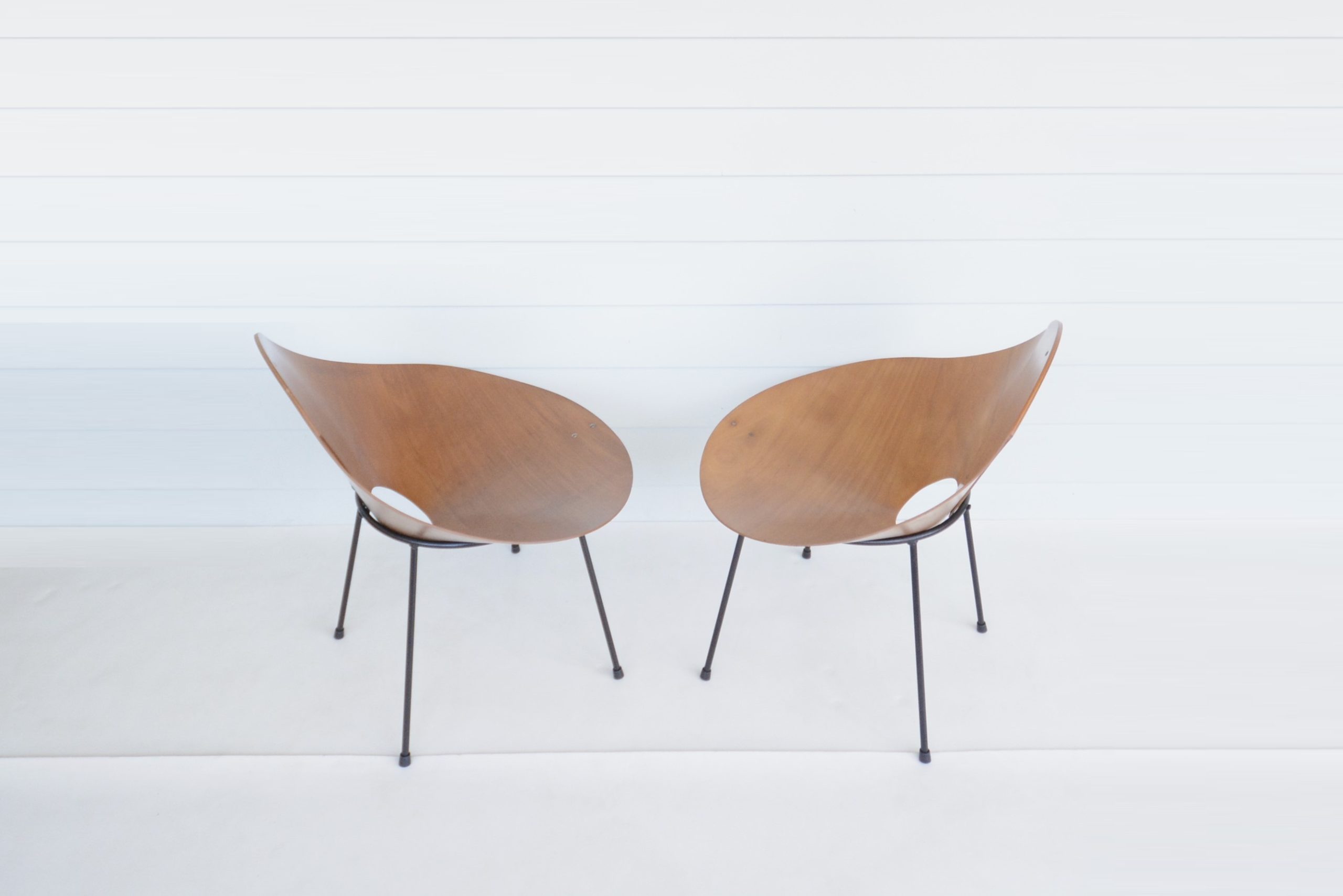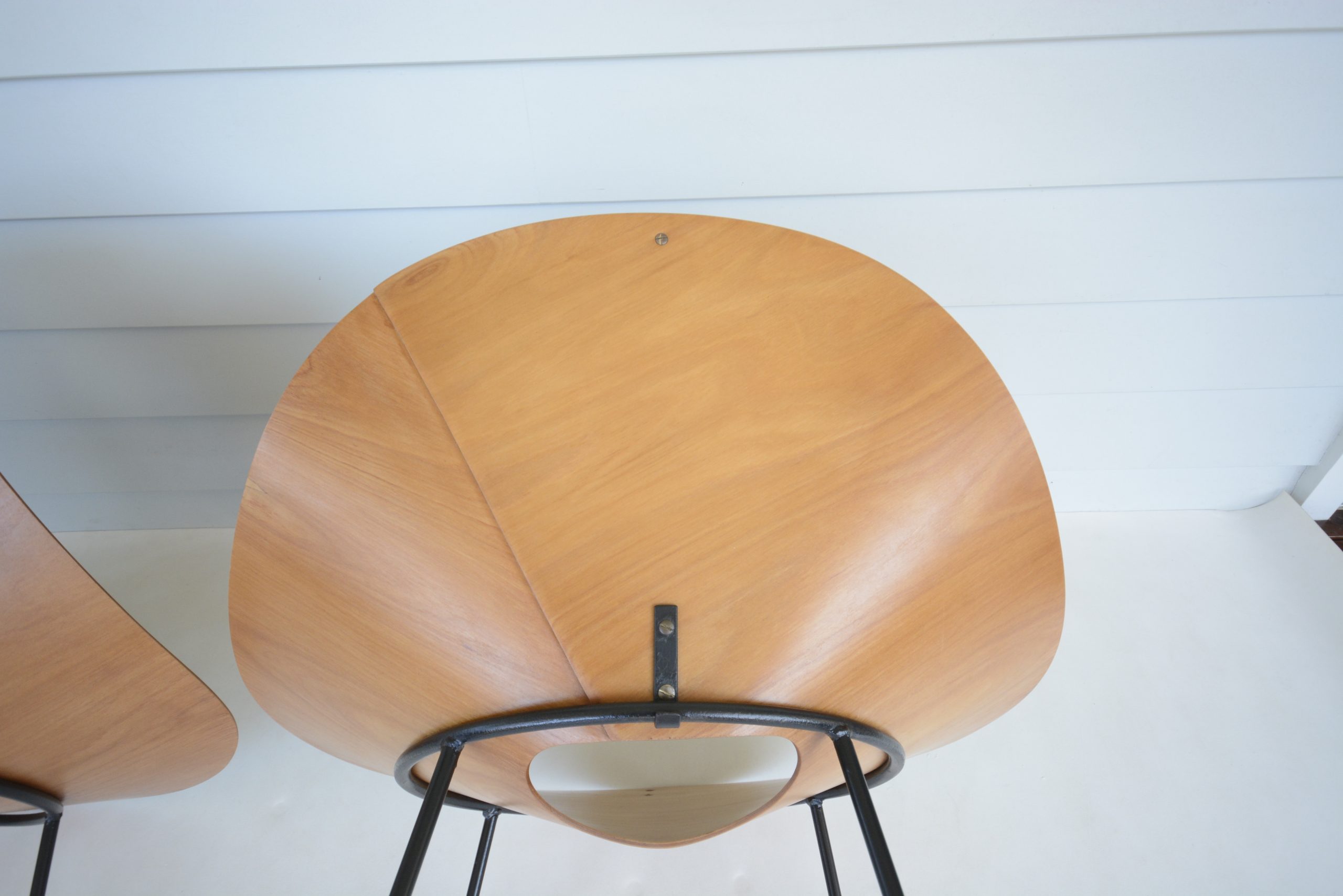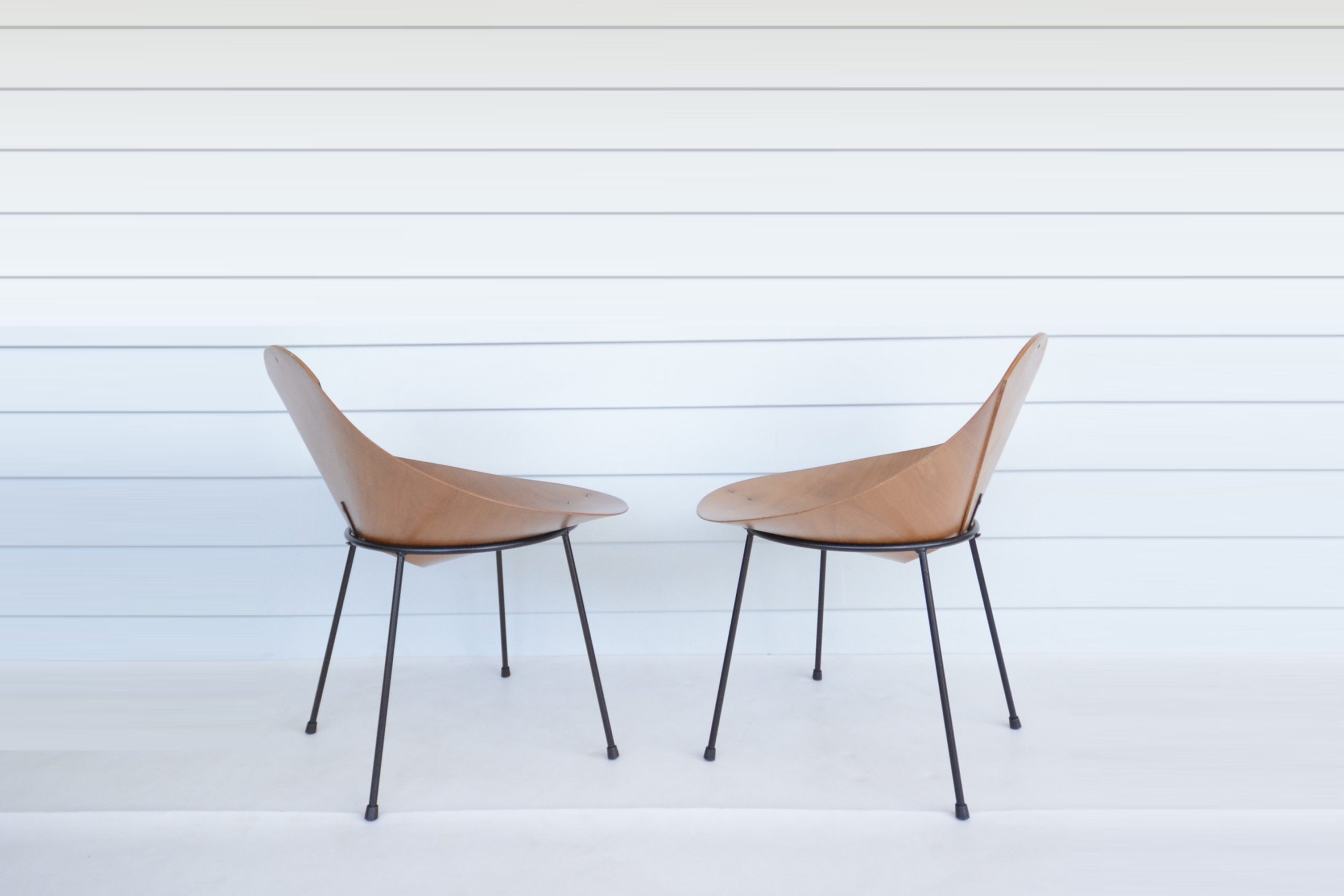 Roger McLay’s Kone chair is an iconic Australian design and ridiculously rare. I haven’t come across another pair of McLay Kone chairs I could seriously consider stocking in iNVISeDGE since 2006. Roger McLay’s “Kone” chair was the most celebrated of his work and has had a notable mention in virtually every reference book on vintage design ever compiled (definitely Australian vintage design books anyway). Designed in 1948, the Kone chair was made from a single piece of aircraft-grade laminated plywood moulded into a conical shape and attached to a metal base. Most had metal legs although other versions were produced with wooden legs. (Some even had “shag-pile” covers on them and were called the “Poodle” chair! I can just picture someone putting a lead on one and taking it out for a walk!) Initially, the Kone chair was sold only from McLay’s Gloucester Street Studio in Sydney, but it became so popular after winning the 1950 Interior Design Award that Descon was commissioned to produce and sell it in larger quantities. That said, these days there are very very few of these around. Roger McLay’s designs have been archived at the Powerhouse Museum in Australia, preserving and valuing the legacy of the Kone chair for generations to come.