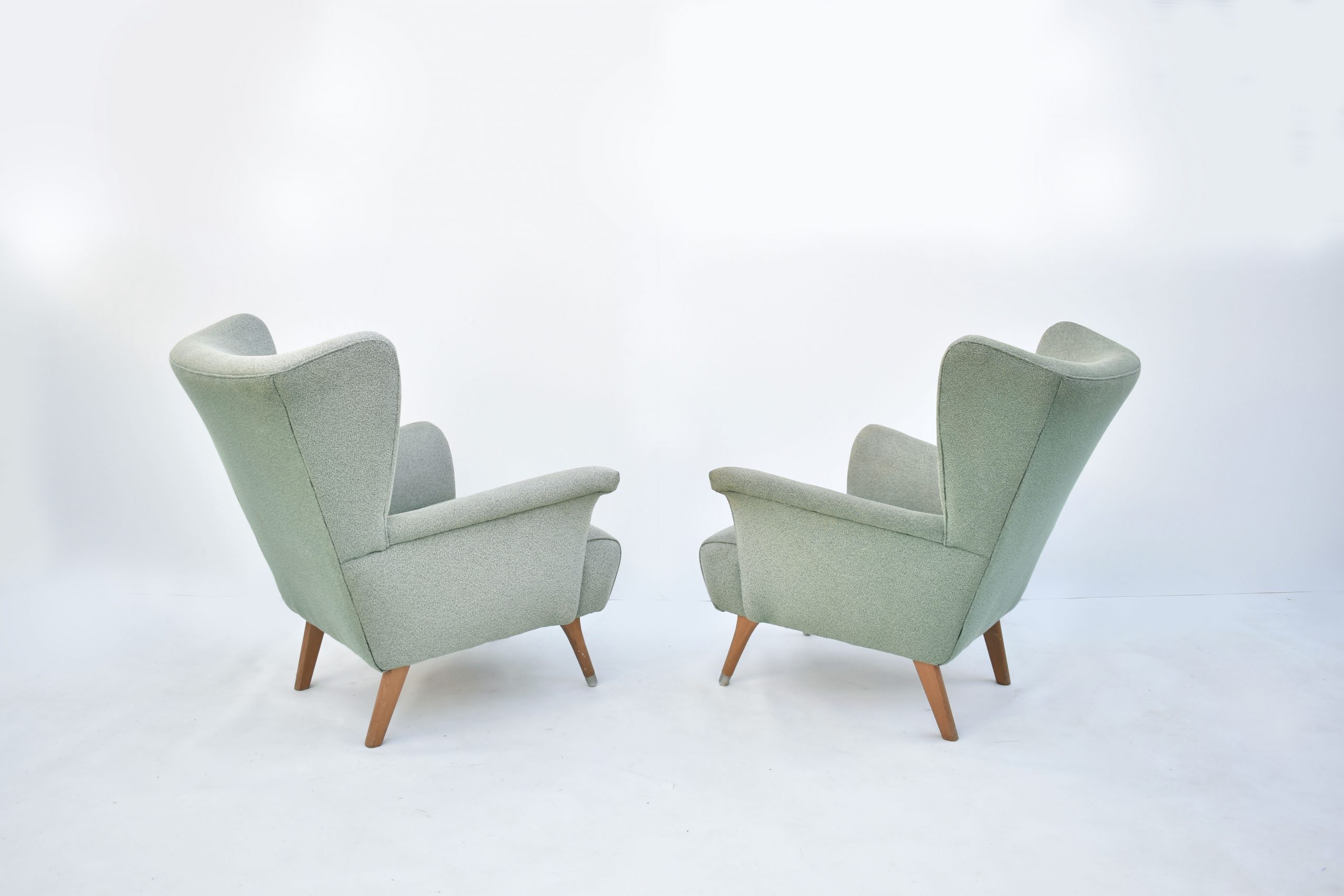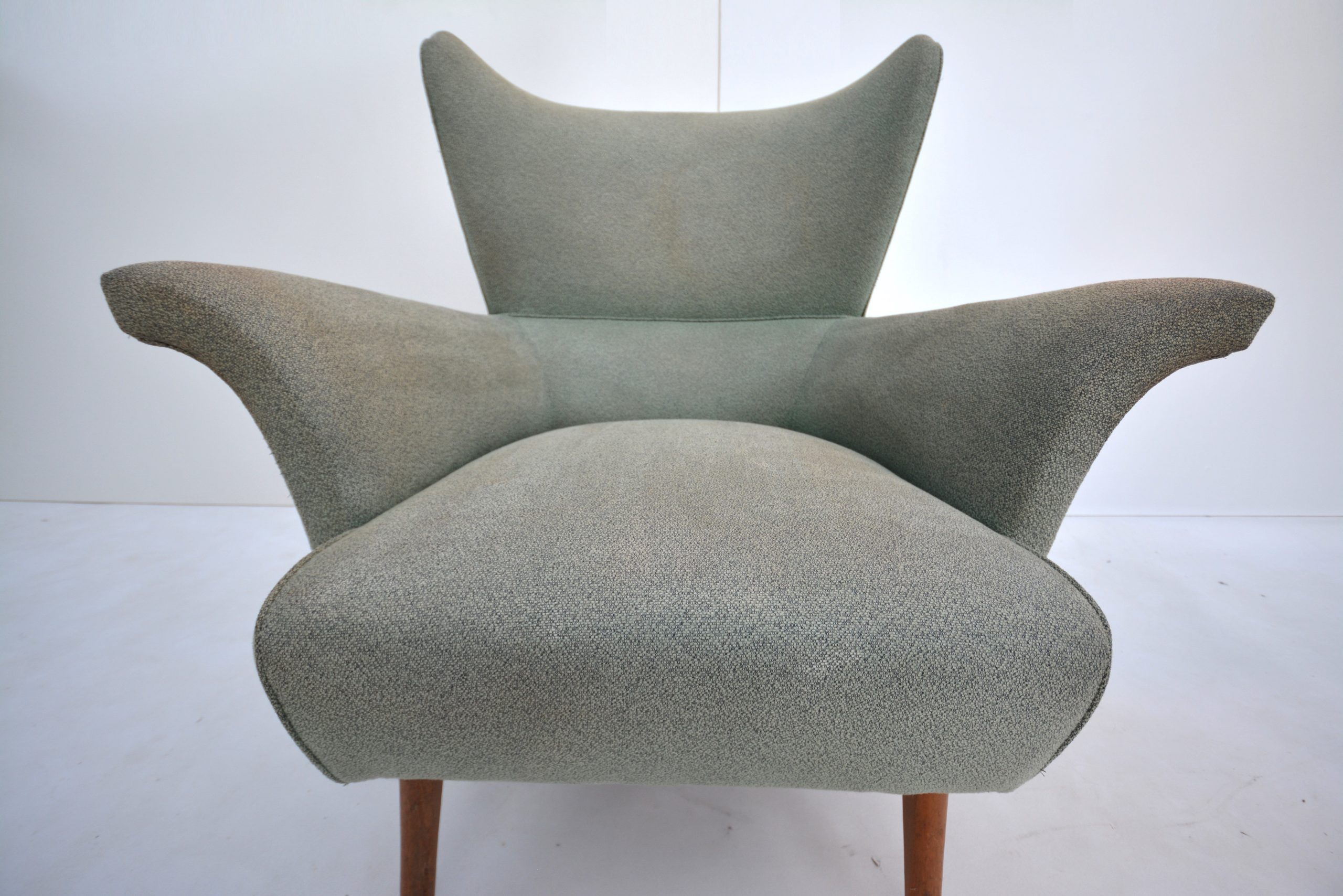 These vintage designer chairs sell themselves with their sculptural shape alone! I love them exactly the way they are. This is the original fabric from the 1950’s or 1960’s, in amazing condition for the age of the chairs. There’s no damage AT ALL, just signs they’ve been used and loved over the years. I like the patina (it’s VERY subtle- as the photos show)- I personally love it when chairs (particularly in a soft fabric) retain the original vintage character. It gives the item an edge over everything else that’s out there because usually these vintage fabrics are long gone. And this fabric has a texture and colour I’d actually choose for a design like this. They have an overall neutral tone with a subtle pop of green. I love putting green into a space- it’s fresh, earthy and adds some life into the room. (Particularly if there’s foliage seen in the space as well- either inside or out the windows.)