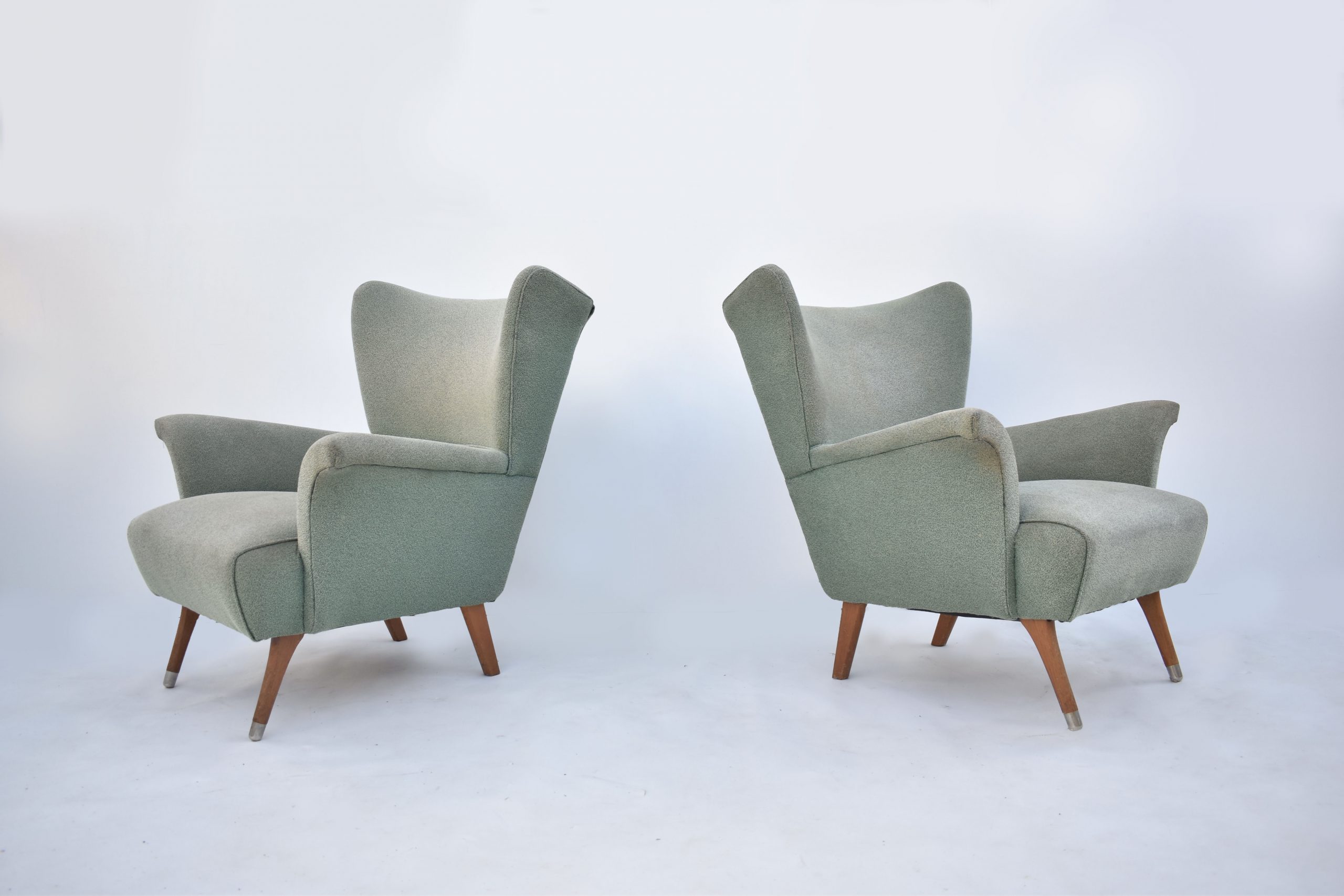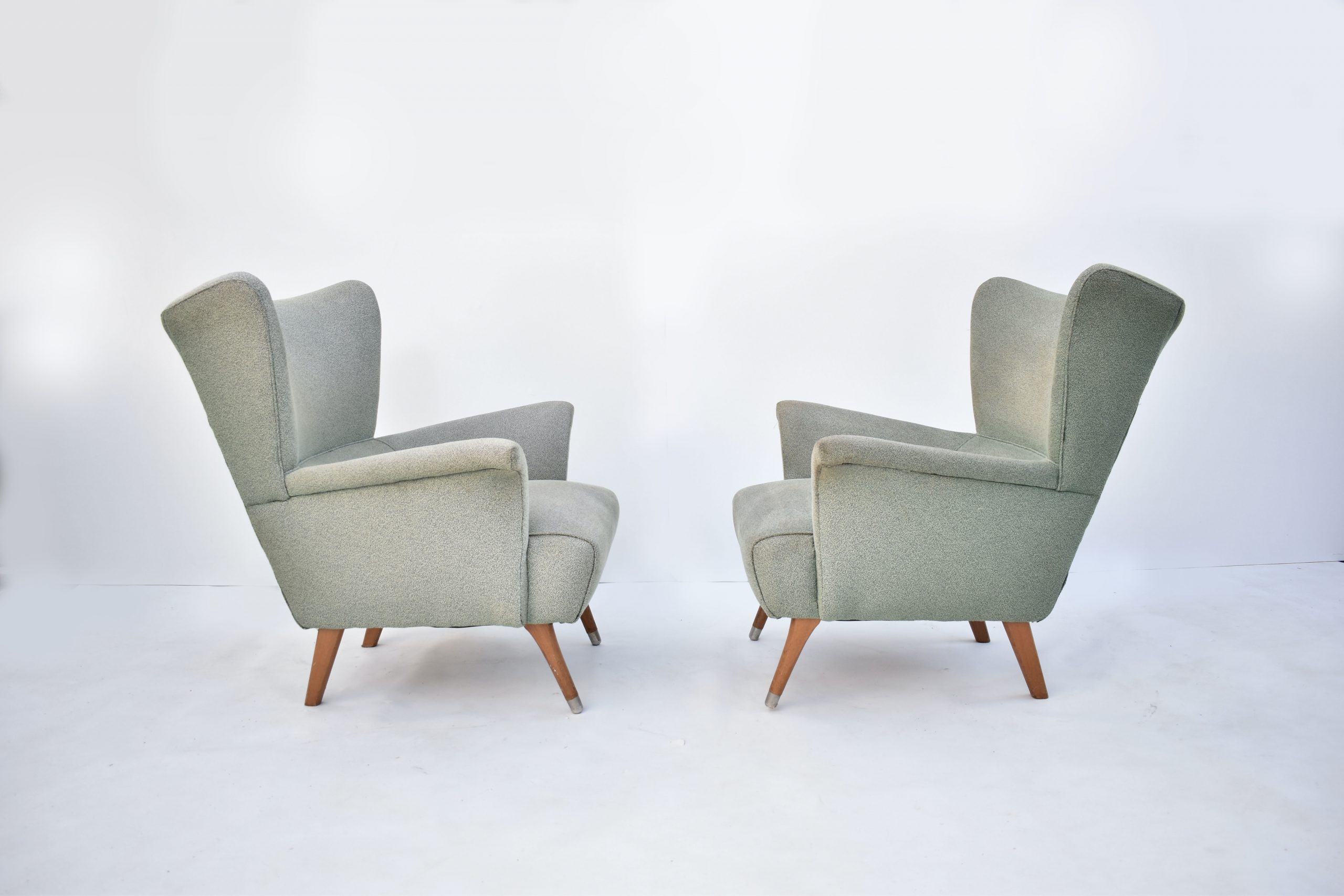 A PAIR of STUNNING wing back designer lounge chairs made in the 1950’s. I have done a lot of research trying to identify these chairs, with no luck- I have no idea who the designer is. I do know they are highly-esteemed though because Smith Street Bizarre in Fitzroy had a pair of these re-upholstered and put in their shop window. Those chairs were exactly the same as these because we bought these as a set of 4 and sold two to Upholstery Direct (who must have sold them to Smith Street Bizarre). I don’t think they are an Australian production- if they were, I should have come across others over the last 22 years I’ve been in this business. (I haven’t). It’s VERY likely they were made overseas. The shape reminds me of VINTAGE G-Plan chairs and 1950’s Italian wing-back designs. One thing is for sure- they’re absolutely stunning! From all angles they are striking but stylish at the same time.