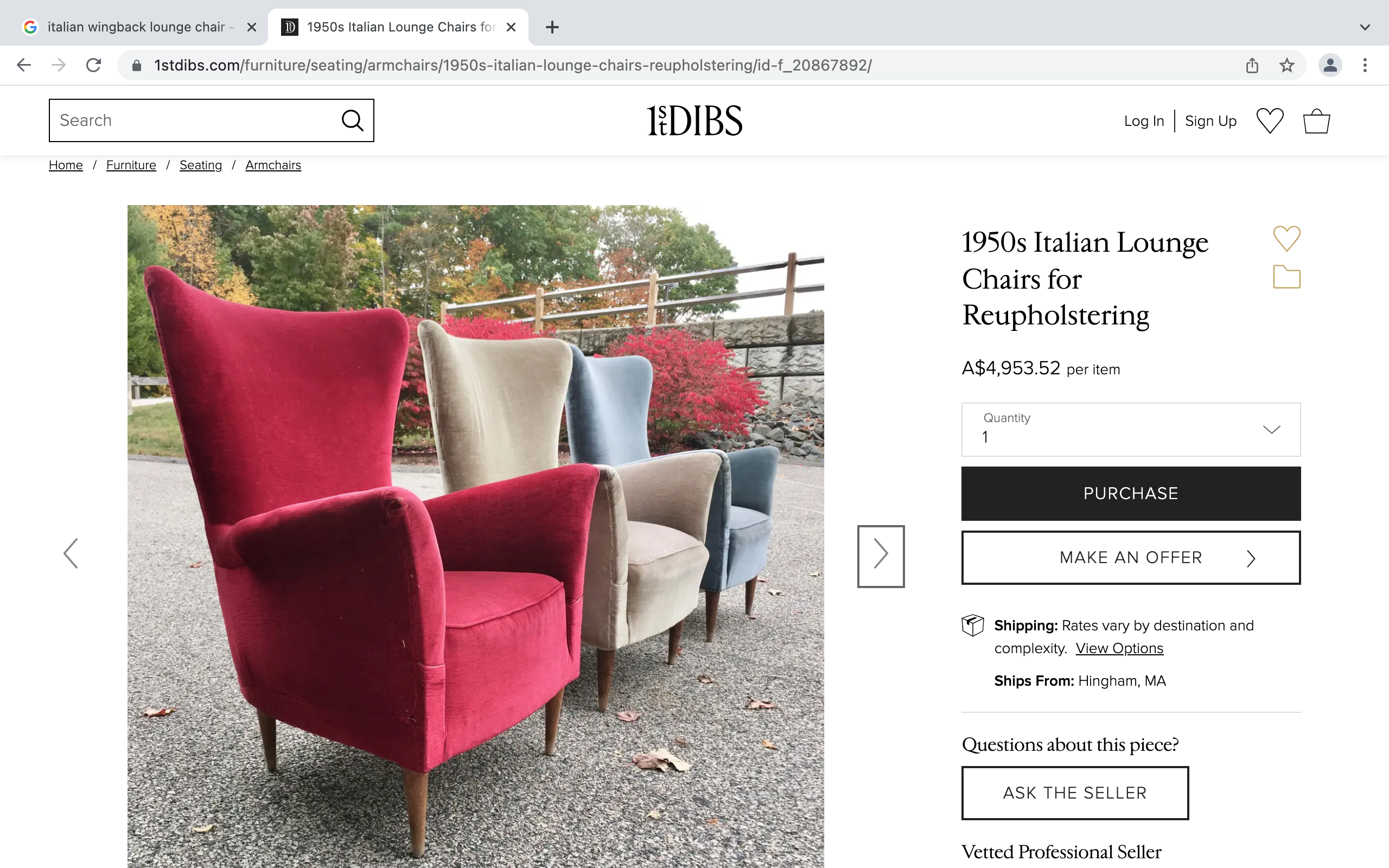 Priced at- $750 PER CHAIR. We have TWO matching chairs currently available. If you want both, come forward quickly because we are prepared to break up the pair if 2 people want only one.