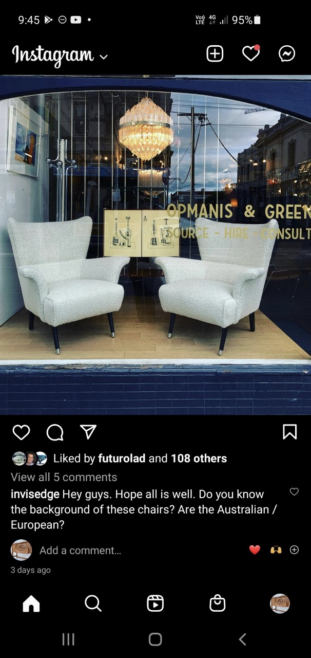 Finally, this VINTAGE pair is a very strong investment- I don’t think they could possibly lose any value … ever! Try getting that from new furniture! They couldn’t even be made new in a developing country for this price (and those new ones would be inferior in quality too). PLUS this vintage pair are in a VERY rare style. A lot of work went into making them back in the day (70 years ago!). Re-upholstered, I’d say the pair that sold through Smith Street Bizarre must have went for at least $5000. Investing in vintage furniture is a wise-move financially and also for our environment. Why? When chairs look like this after 70 years of use, you’re guaranteed of the quality / DURABILITY you’ll be getting and when they could be put on the floor of any furniture design store today and still look the part, you know the design will ALWAYS be in trend. There’s no better way I can think of to invest in your home and reduce landfill.