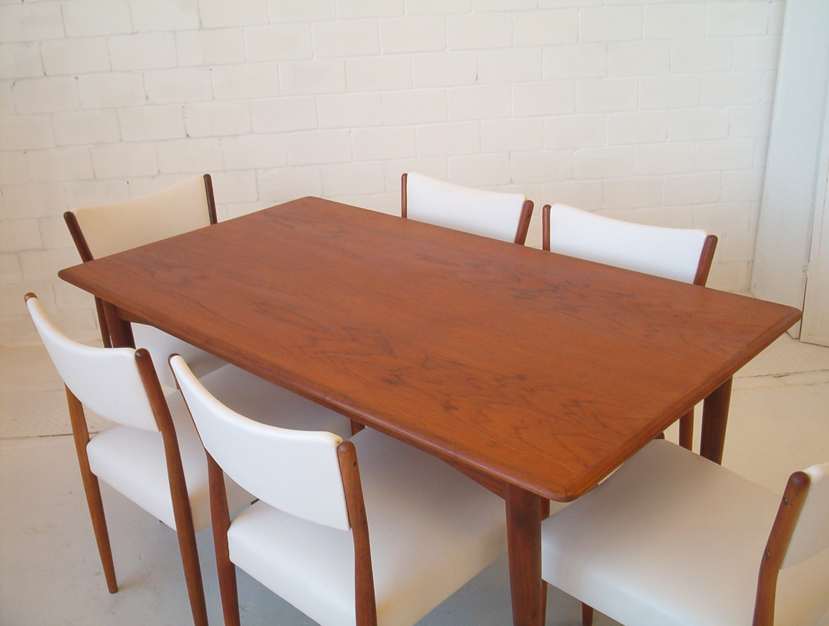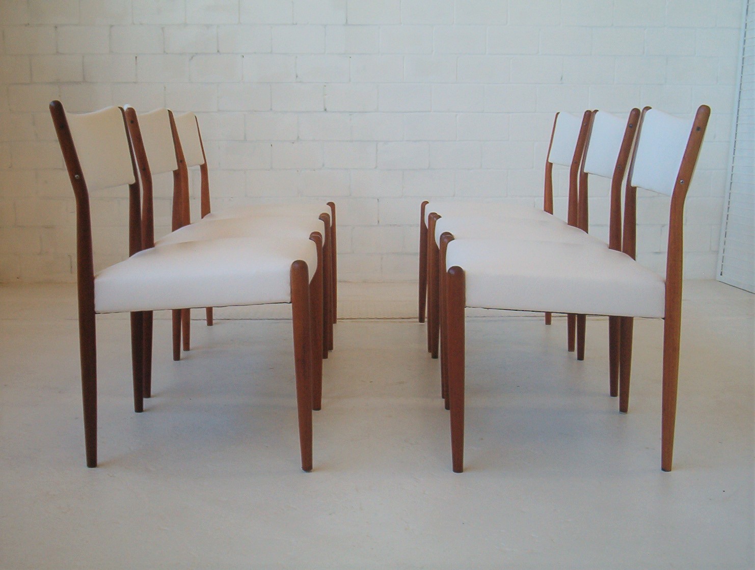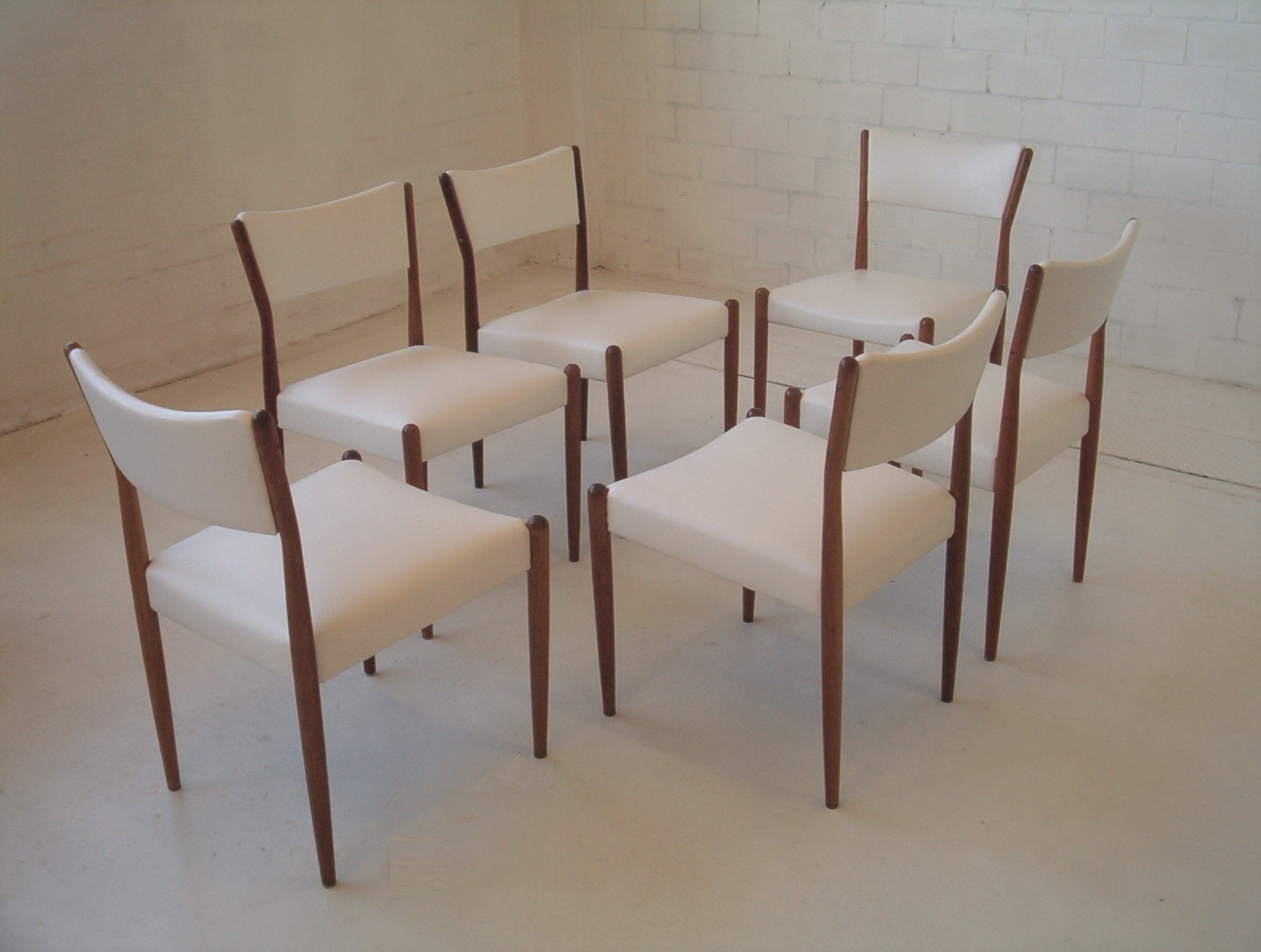 A set of SIX dining chairs in a sleek and refined style by Australian maker, Parker Furniture. Sets of six in this style are hard to find and don’t come up often. These were done in the early 1960’s and have just been reupholstered in a white commercial-grade vinyl. I really like this Parker design- it’s “clean” and refined and has the understated elegance of Danish furniture. These Parker chairs show EXPERT workmanship and are also very comfortable. As far as dining chairs go, these are as comfortable as they get. With our price of $160 each, the average timber chair usually costs well over $200 each in the furniture chain stores but look nothing like these- these chairs are beautifully finished, boast superior construction AND investment appeal. Buying new is only encouraging further deforestation and when you don’t know the construction quality, how long will it be before they end up as landfill? Sets of 6 from this era have to be well built- they wouldn’t have lasted this long otherwise- sets of 6 are getting harder to get which only strengthens the investment appeal of this set.