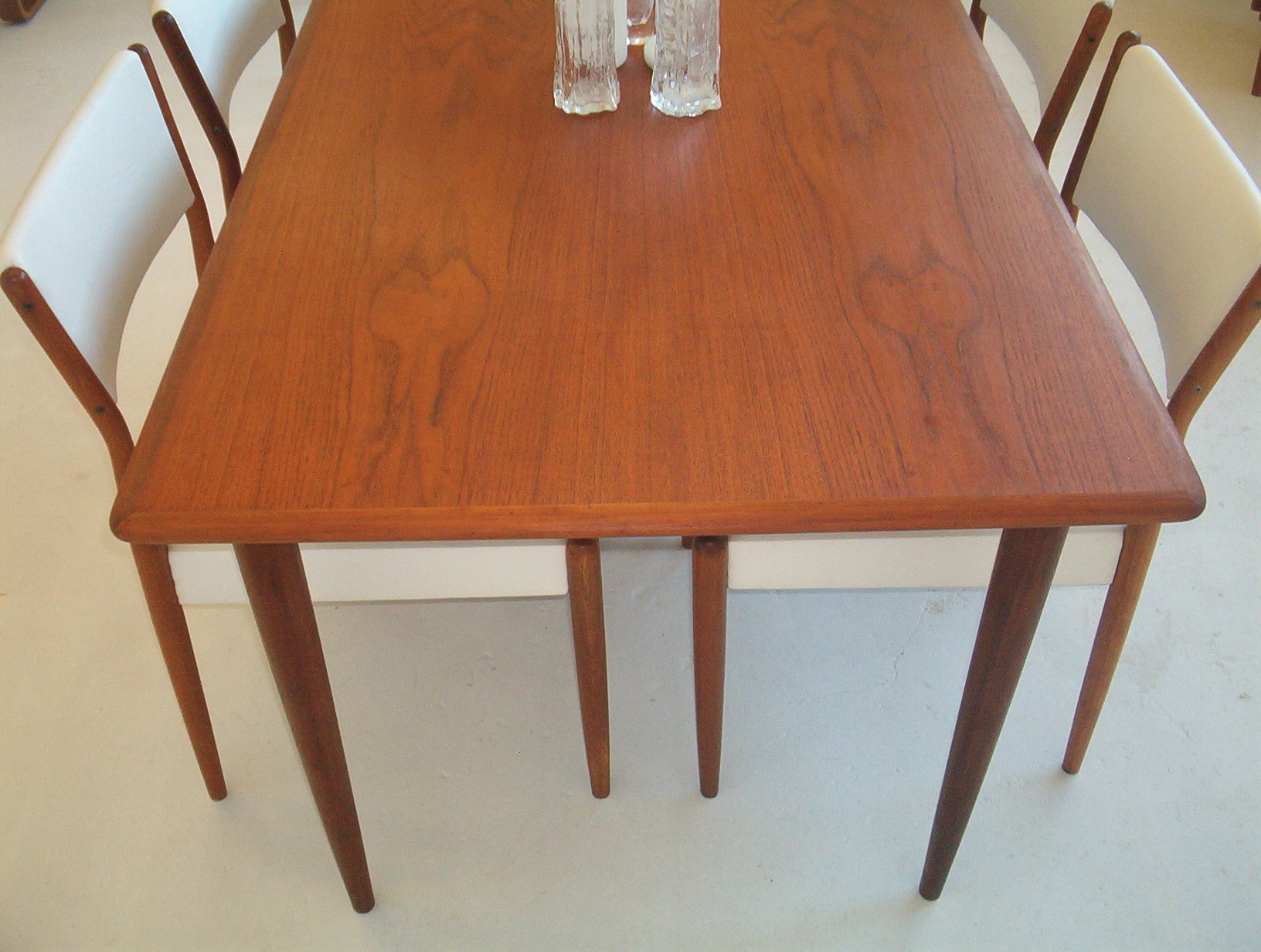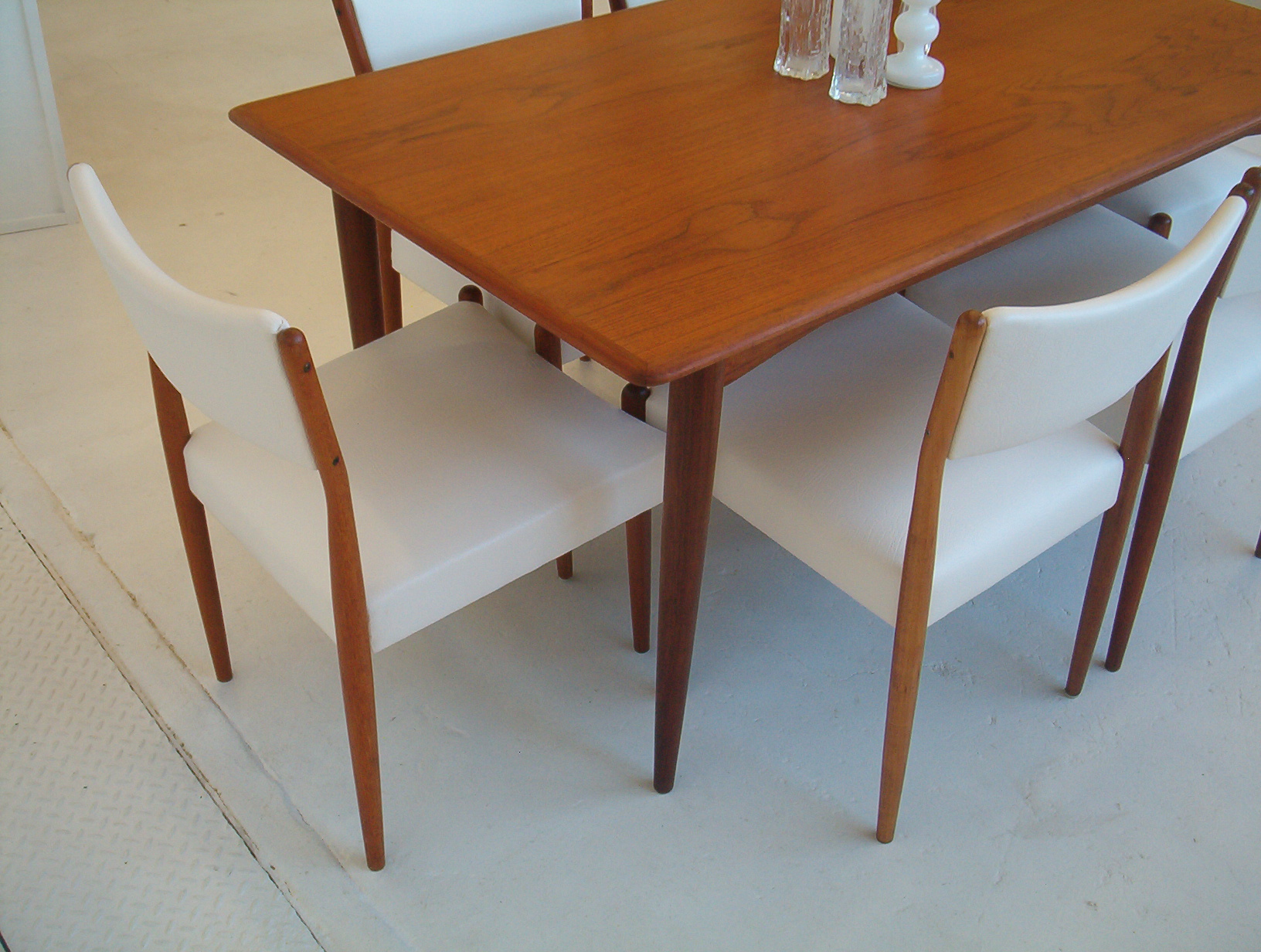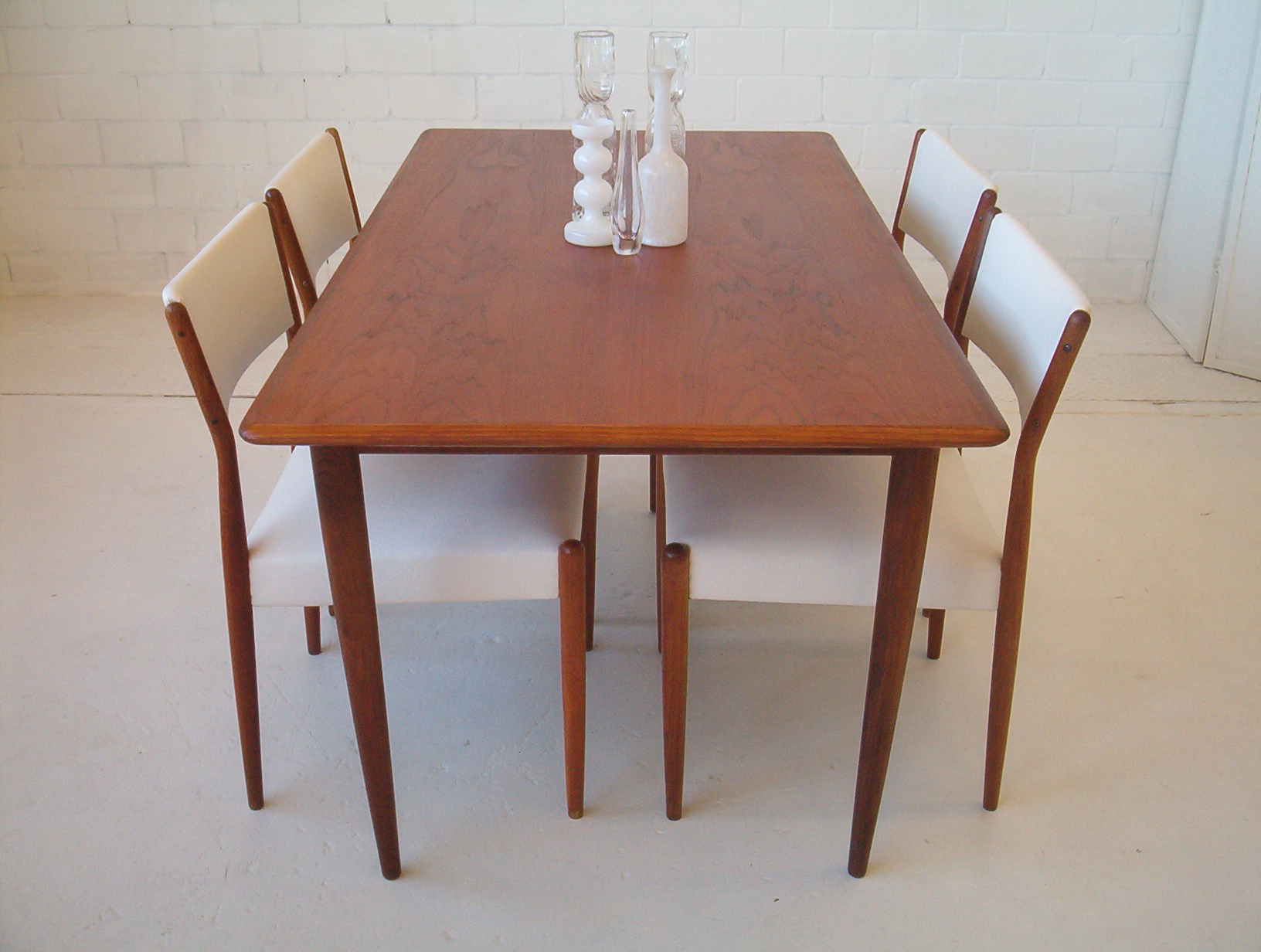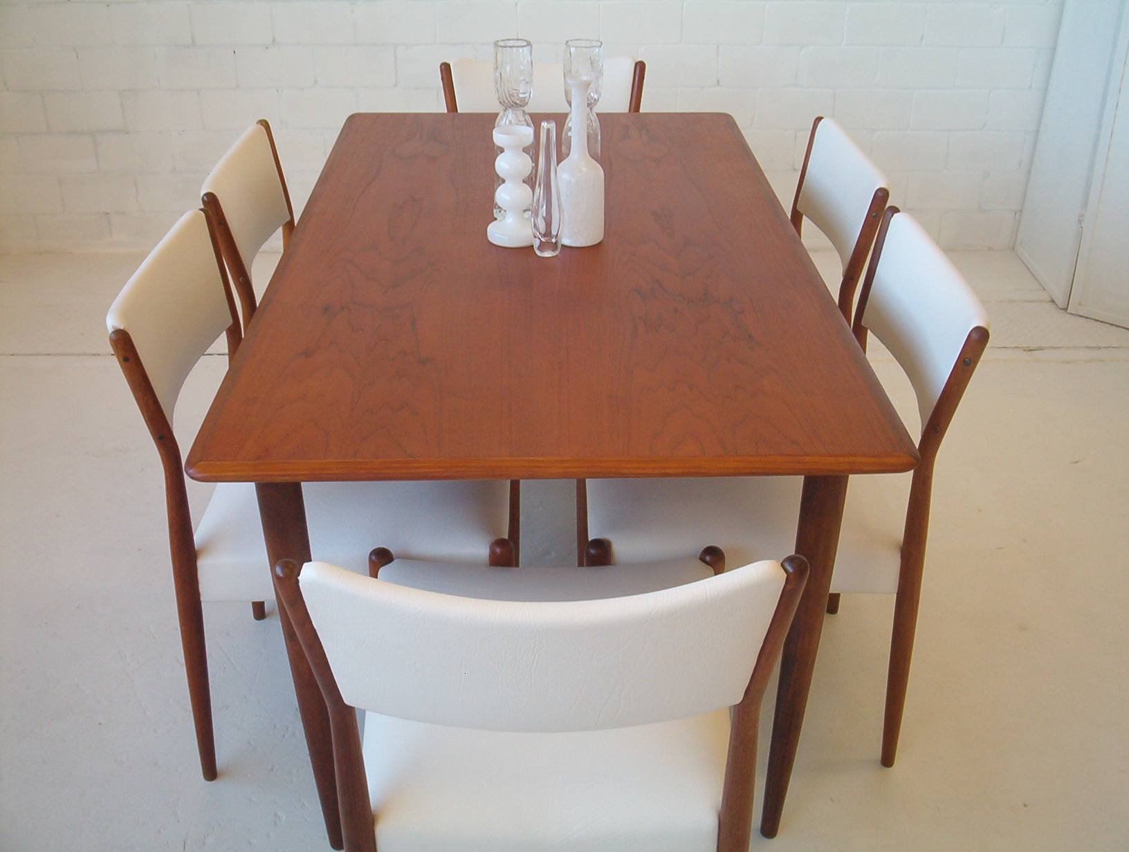 A set of SIX dining chairs in a sleek and refined style by Australian maker, Parker Furniture. Sets of six in this style are hard to find and don’t come up often. These were done in the early 1960’s and have just been reupholstered in a white commercial-grade vinyl. I really like this Parker design- it’s “clean” and refined and has the understated elegance of Danish furniture. These Parker chairs show EXPERT workmanship and are also very comfortable. As far as dining chairs go, these are as comfortable as they get. With our price of $160 each, the average timber chair usually costs well over $200 each in the furniture chain stores but look nothing like these- these chairs are beautifully finished, boast superior construction AND investment appeal. Buying new is only encouraging further deforestation and when you don’t know the construction quality, how long will it be before they end up as landfill? Sets of 6 from this era have to be well built- they wouldn’t have lasted this long otherwise- sets of 6 are getting harder to get which only strengthens the investment appeal of this set.