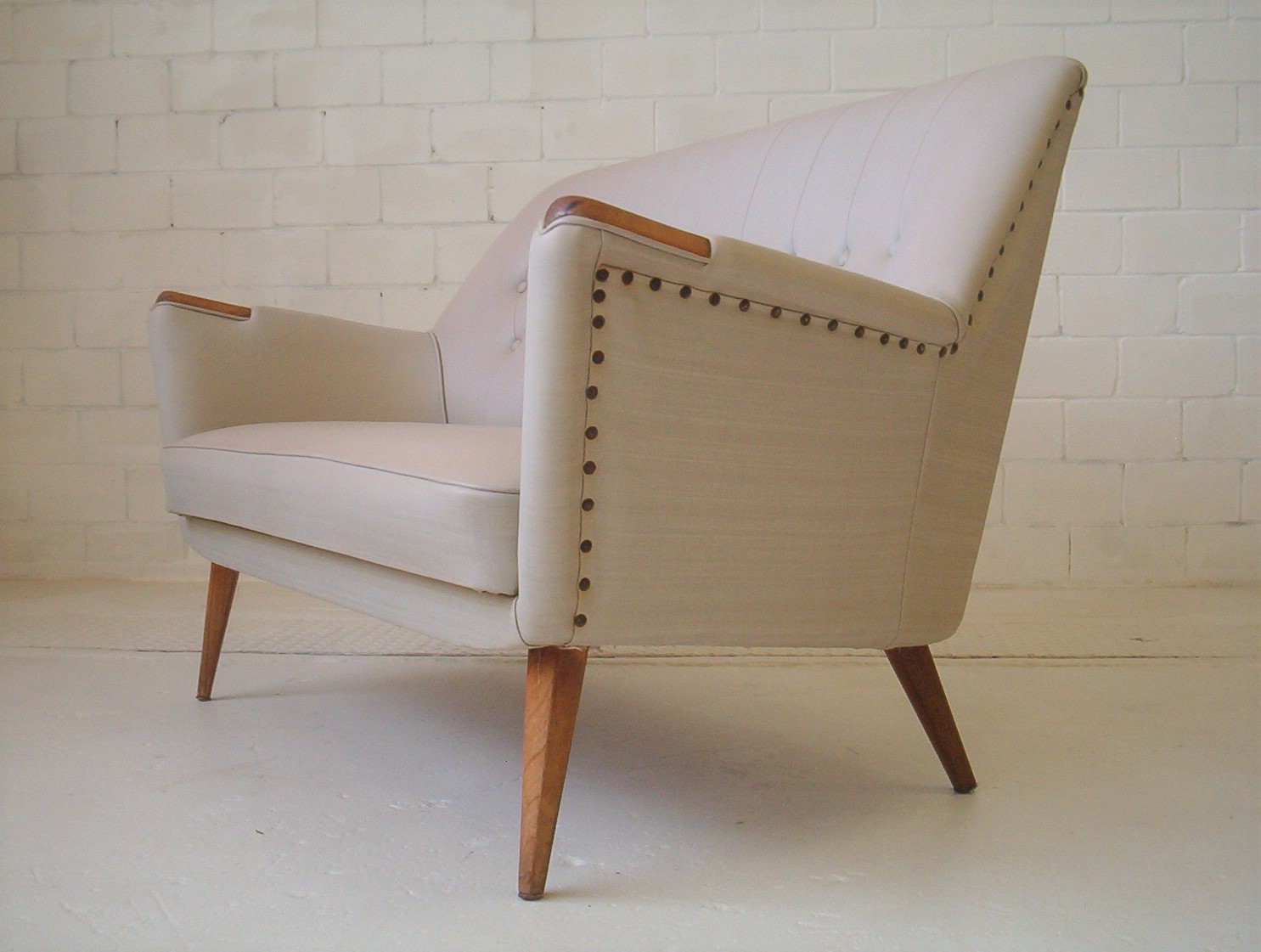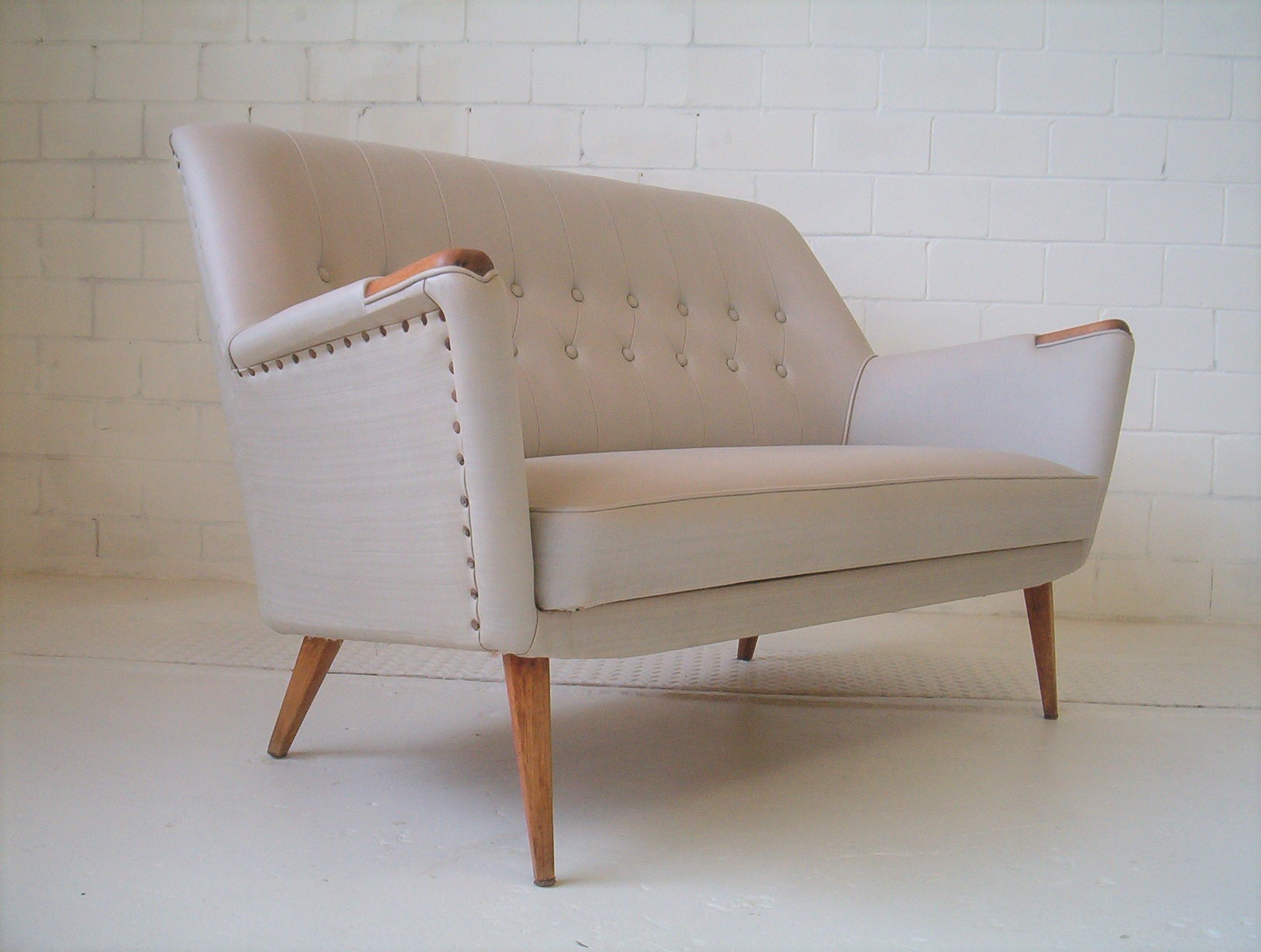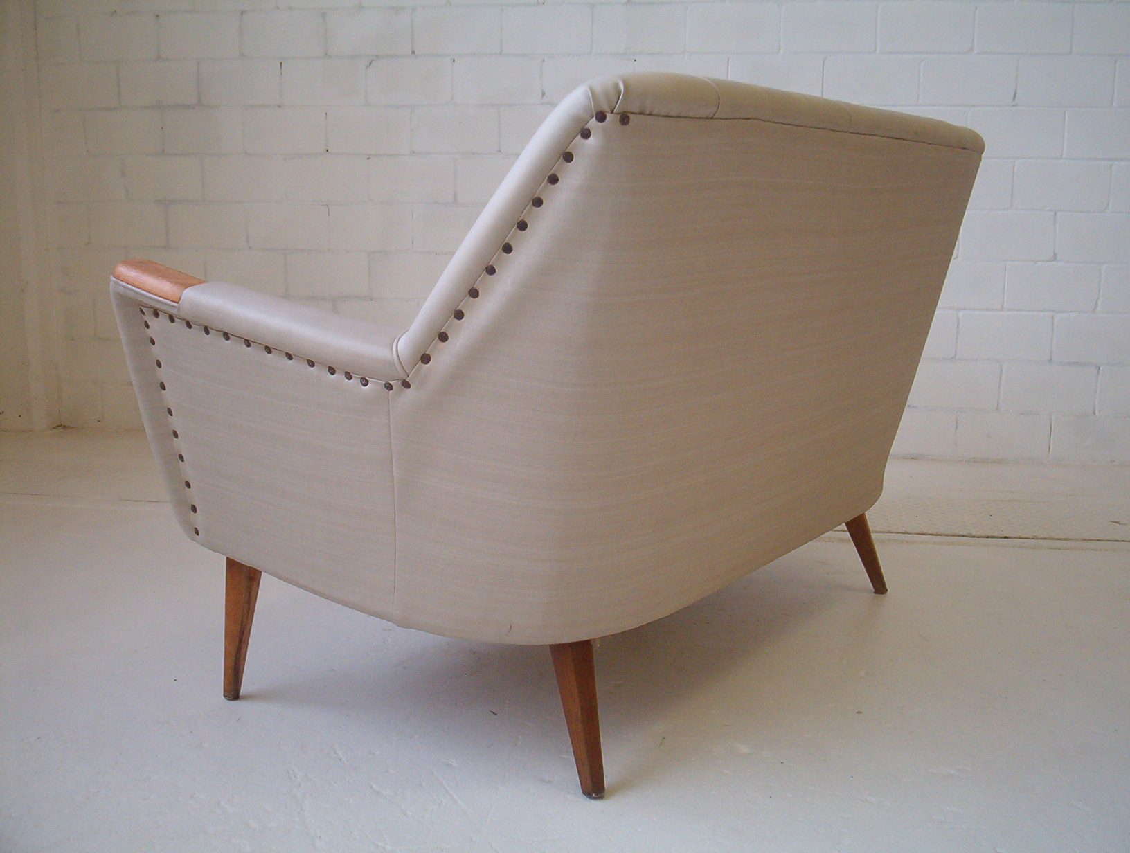 What a fantastic piece! This 2-SEATER lounge has a classic 1950’s design that has drawn a lot of positive attention in my showroom. I have had it suggested that it might be a Featherston piece- it’s NOT. It’s funny how people decide that any lounge with a fantastic 50’s design must be done by Grant Featherston. I am not certain of the designer but am strongly inclined to say it was done by Paul Kafka, a Sydney boutique maker from the 1950’s. English G-Plan also springs to mind but I don’t think it is. I feel this design rivals Featherston’s work but doesn’t have the same price tag. The equivalent Featherston piece is valued at about $8000+. Classic 1950’s pieces have broad appeal and very solid investment appeal. Authentic 1950’s retro furniture has enjoyed everlasting popularity and the fun carefree designs of the 1950’s are set to be with us for a long time to come. This piece boasts top-quality construction and was built to last. Why buy furniture of questionable quality when these pieces have already proven themselves for over 50 years? Also, this is the exact lounge that was chosen to be shown in the 2008 Edition of Celebrity Homes magazine- if you buy this lounge you should get yourself a copy of this magazine!
