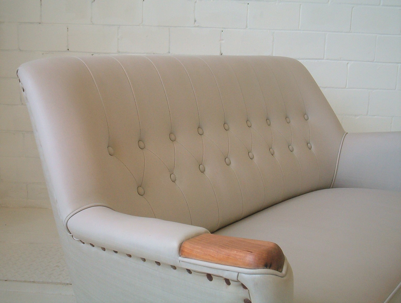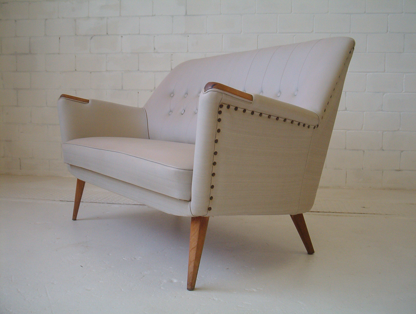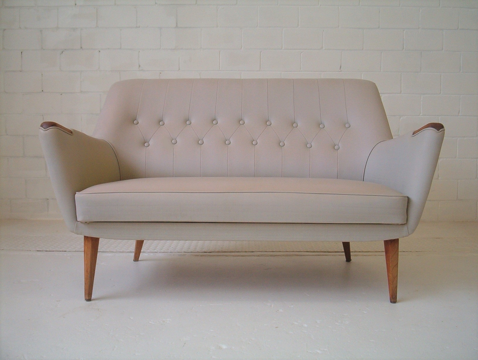 What a fantastic piece! This 2-SEATER lounge has a classic 1950’s design that has drawn a lot of positive attention in my showroom. I have had it suggested that it might be a Featherston piece- it’s NOT. It’s funny how people decide that any lounge with a fantastic 50’s design must be done by Grant Featherston. I am not certain of the designer but am strongly inclined to say it was done by Paul Kafka, a Sydney boutique maker from the 1950’s. English G-Plan also springs to mind but I don’t think it is. I feel this design rivals Featherston’s work but doesn’t have the same price tag. The equivalent Featherston piece is valued at about $8000+. Classic 1950’s pieces have broad appeal and very solid investment appeal. Authentic 1950’s retro furniture has enjoyed everlasting popularity and the fun carefree designs of the 1950’s are set to be with us for a long time to come. This piece boasts top-quality construction and was built to last. Why buy furniture of questionable quality when these pieces have already proven themselves for over 50 years? Also, this is the exact lounge that was chosen to be shown in the 2008 Edition of Celebrity Homes magazine- if you buy this lounge you should get yourself a copy of this magazine!