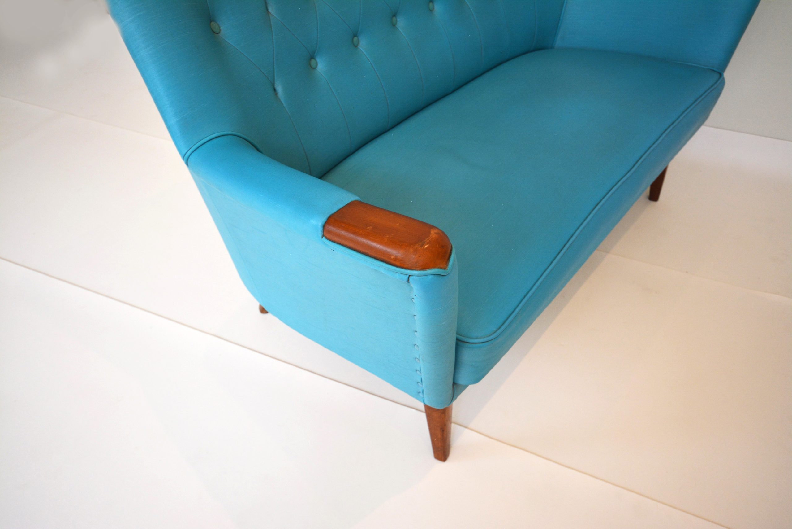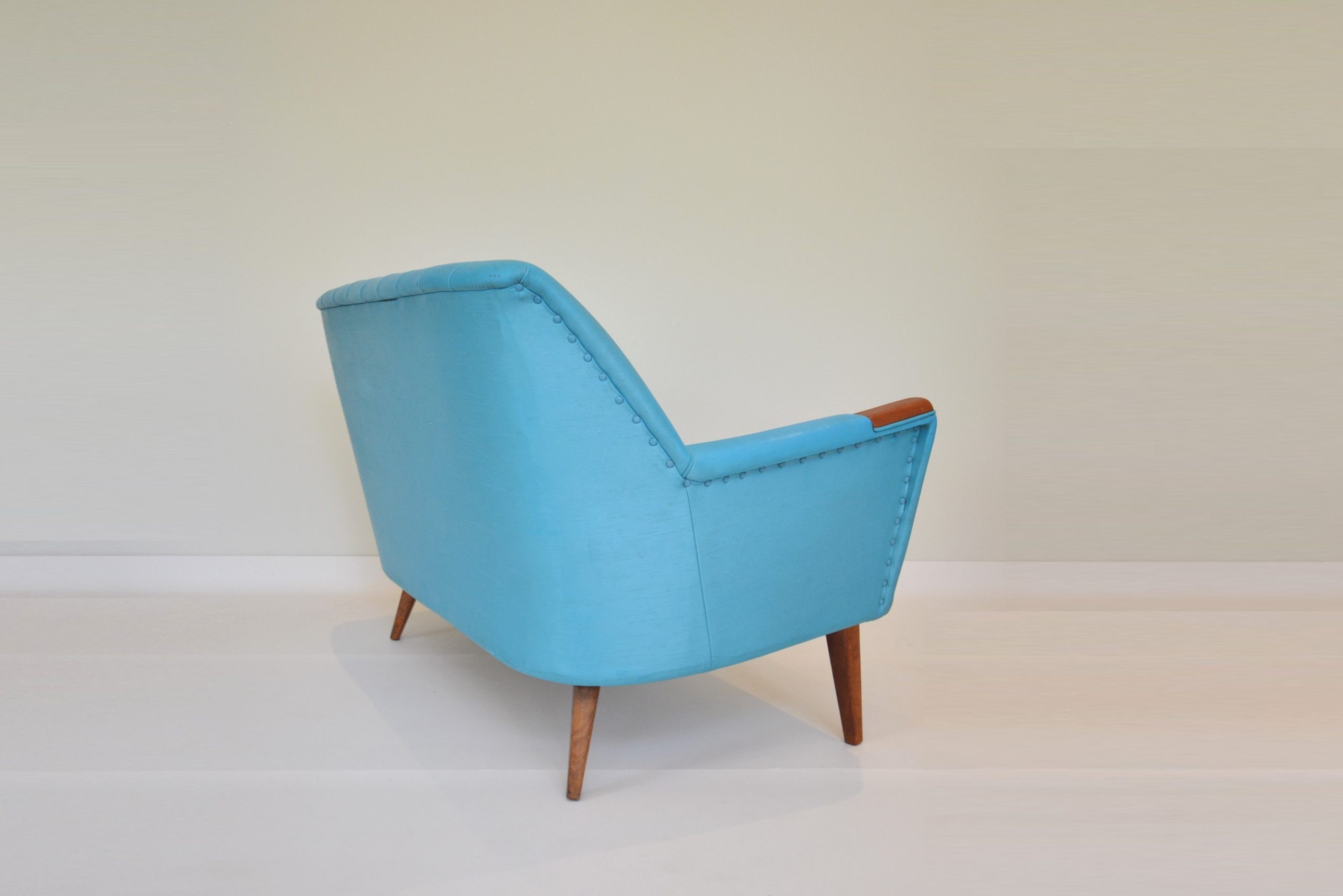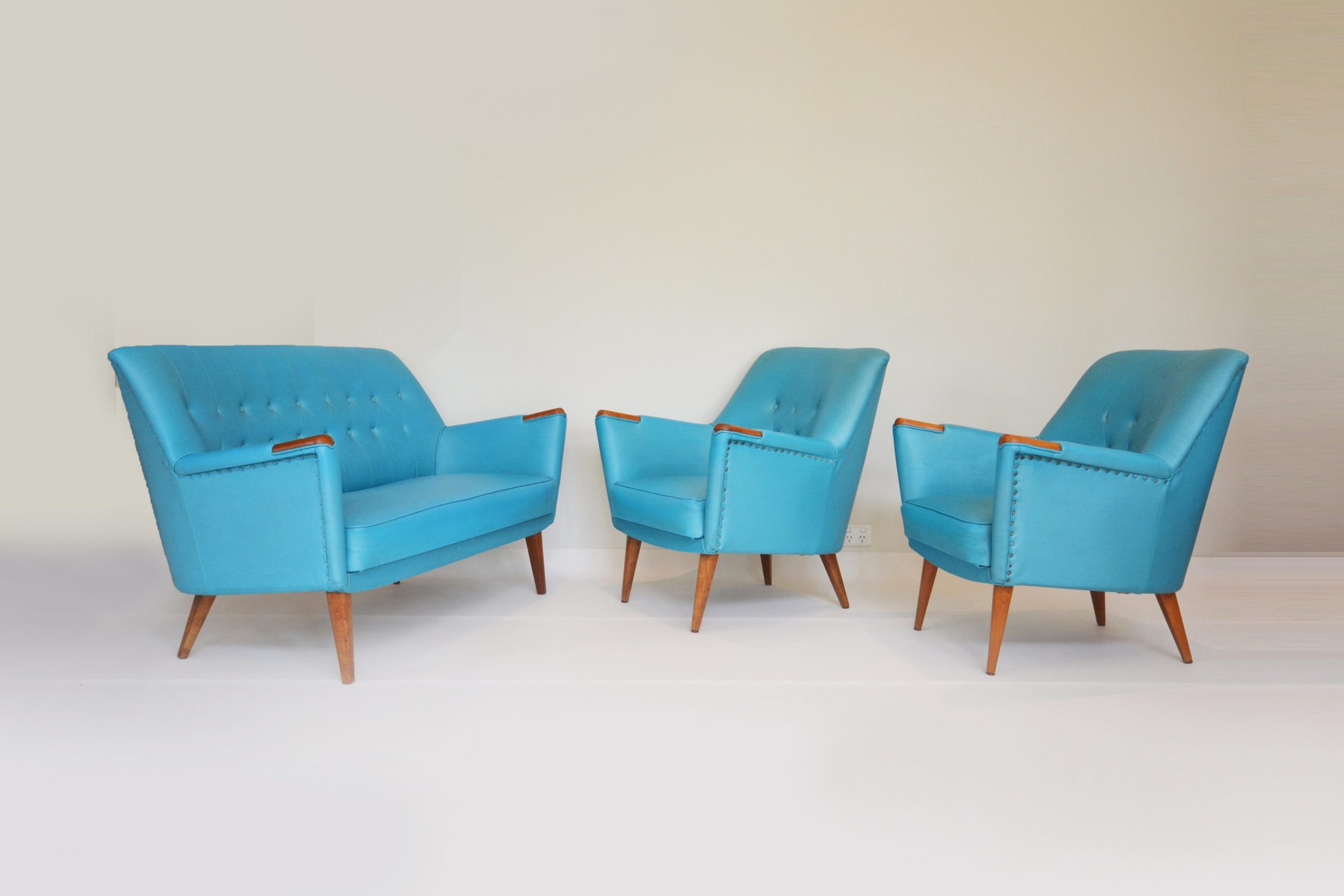 I also love the colour- whilst it has a fun 1950’s vibe, turquoise is constantly in trend. Any colour that’s common in nature is a perennial favourite and not really subject to trends. This suite nestles well in many interiors- views of the sky, bushland or the ocean outside your windows will all work well. This suite belonged to the parents of my vendor. For 25 years it lived in a farmhouse in Bemboka (rural NSW). The pair of chairs nestled in front of the fireplace- the 2-seater sofa went in the formal lounge room where it was rarely used.