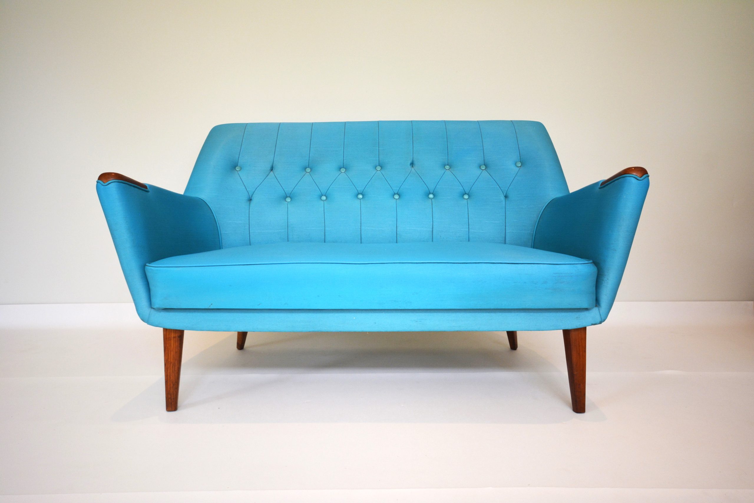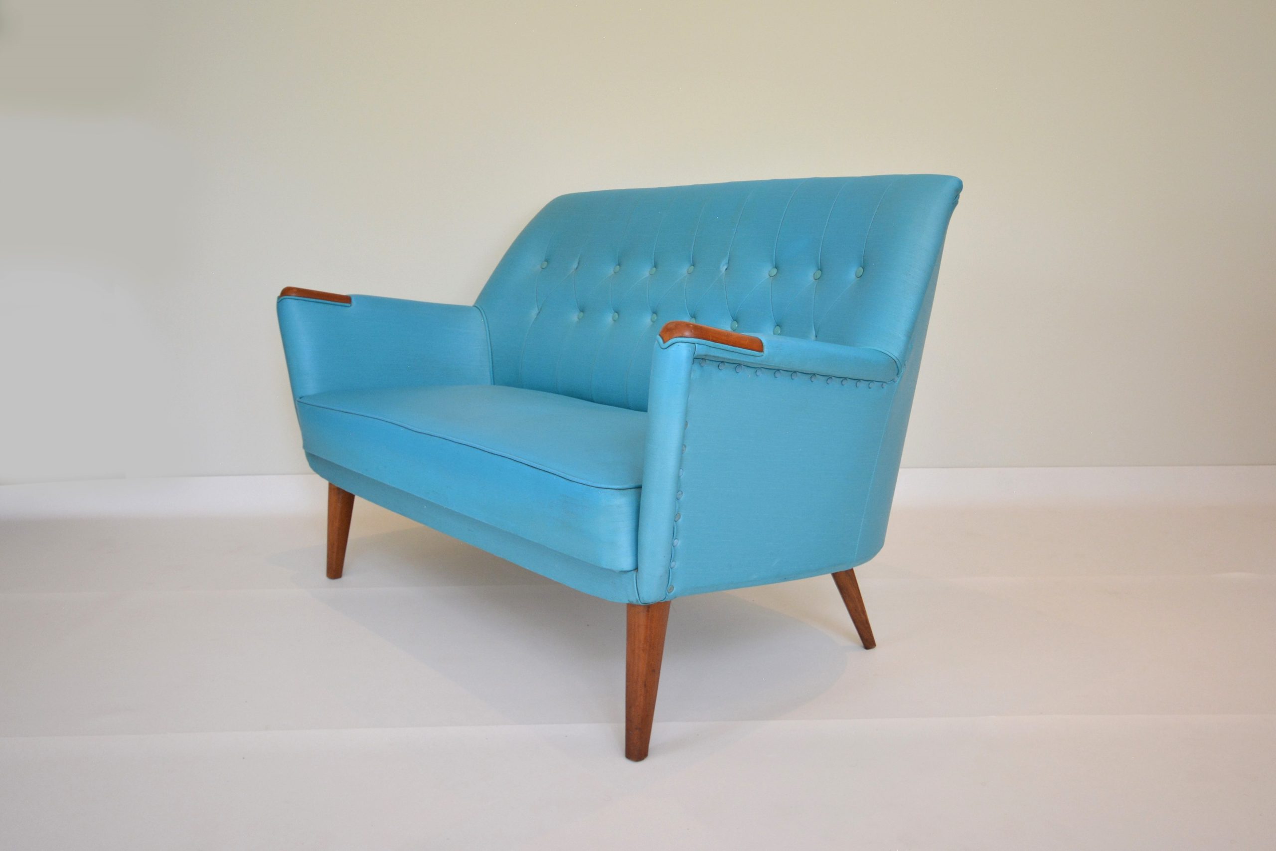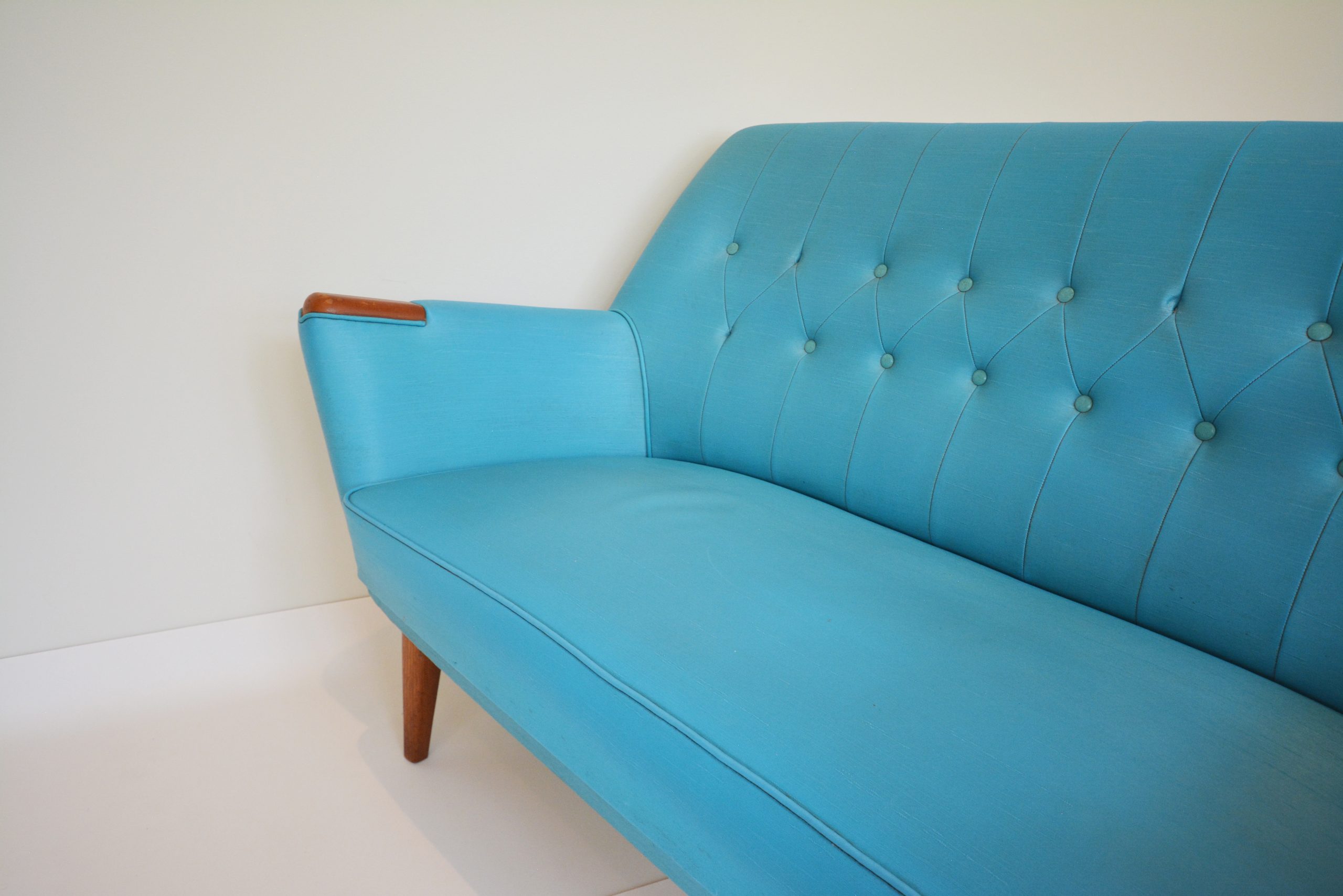 I also love the colour- whilst it has a fun 1950’s vibe, turquoise is constantly in trend. Any colour that’s common in nature is a perennial favourite and not really subject to trends. This suite nestles well in many interiors- views of the sky, bushland or the ocean outside your windows will all work well. This suite belonged to the parents of my vendor. For 25 years it lived in a farmhouse in Bemboka (rural NSW). The pair of chairs nestled in front of the fireplace- the 2-seater sofa went in the formal lounge room where it was rarely used.