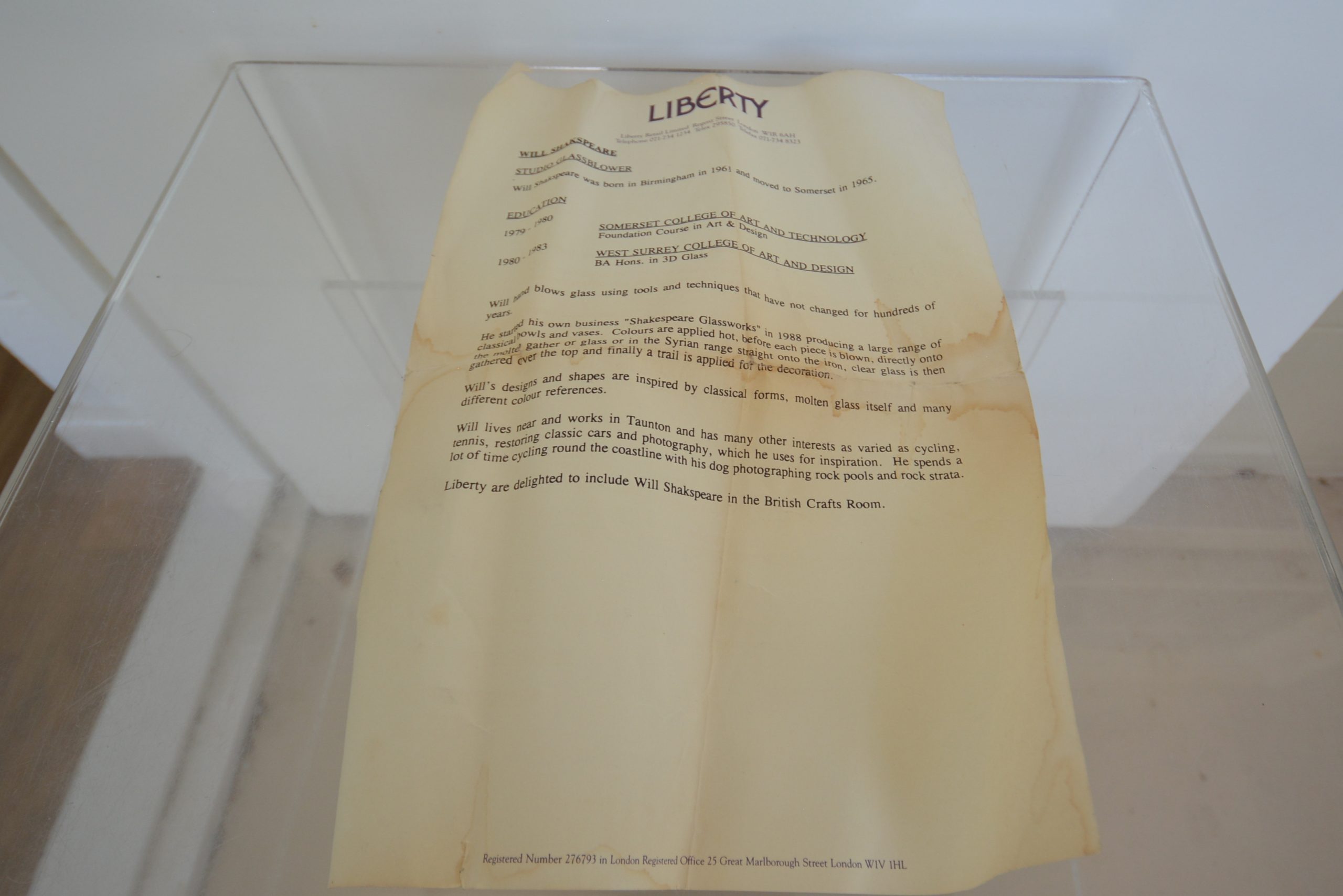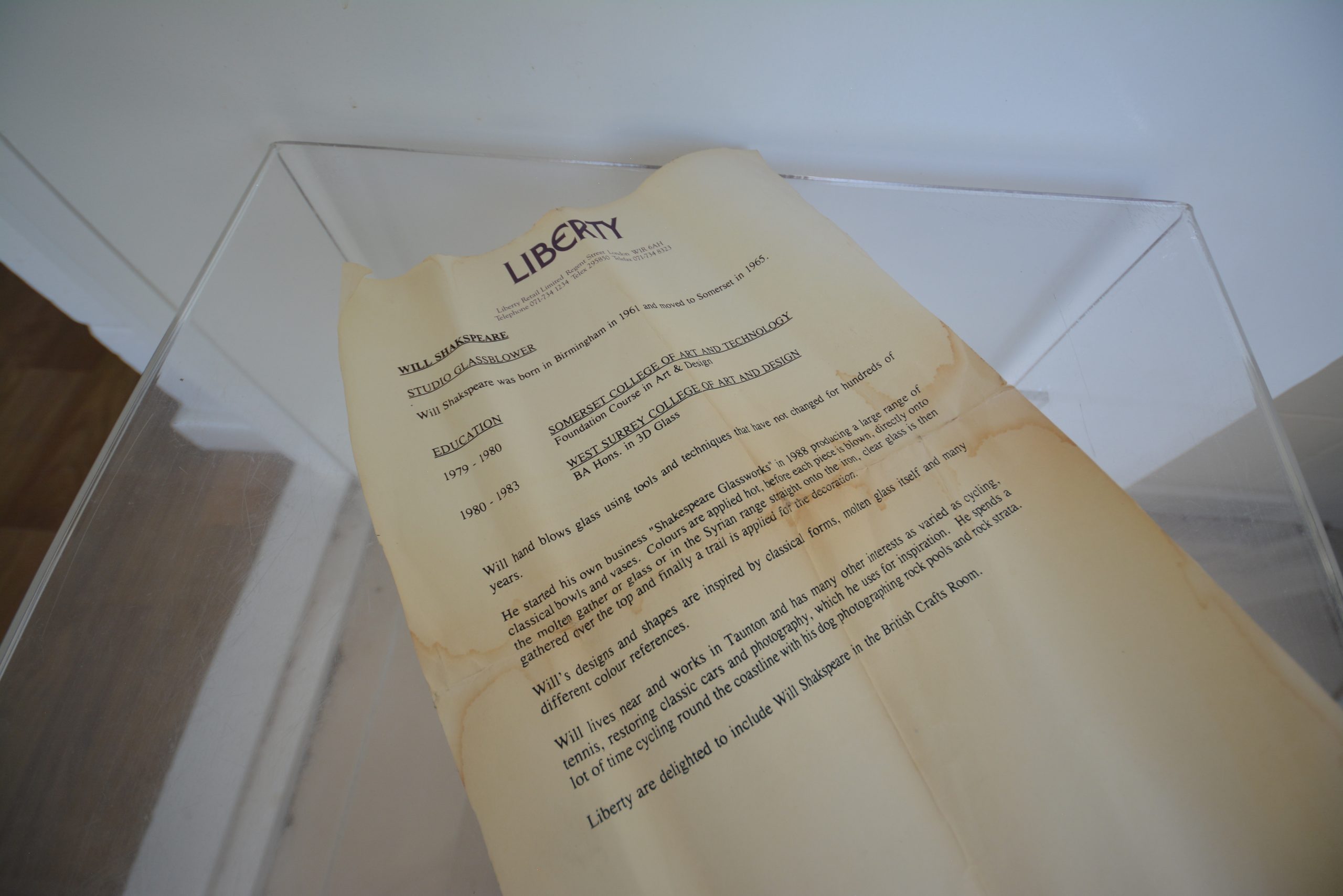 Will Shakspeare is one of Europe’s best known glass blowers. He has been featured regularly in the press and on TV including Inside The Factory, Kirstie’s Allsopp’s Homemade Home and Kirstie’s Homemade Christmas plus the Telegraph Magazine with David Nicholls. Will set up Shakespeare Glass Ltd in 1988 and has supplied many galleries and well-known stores throughout the years. As of 2022, the studio still operates in Langport (in the UK).