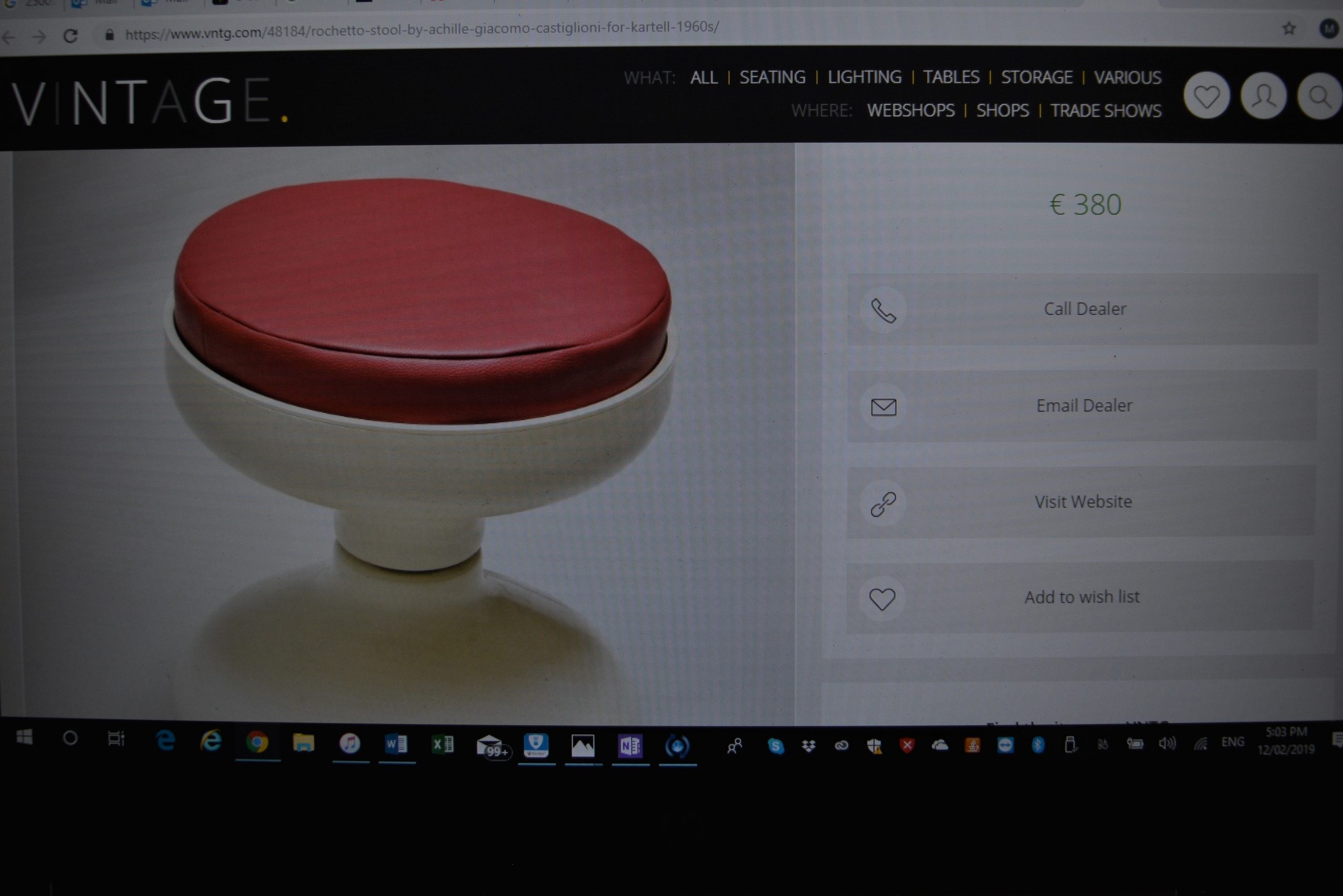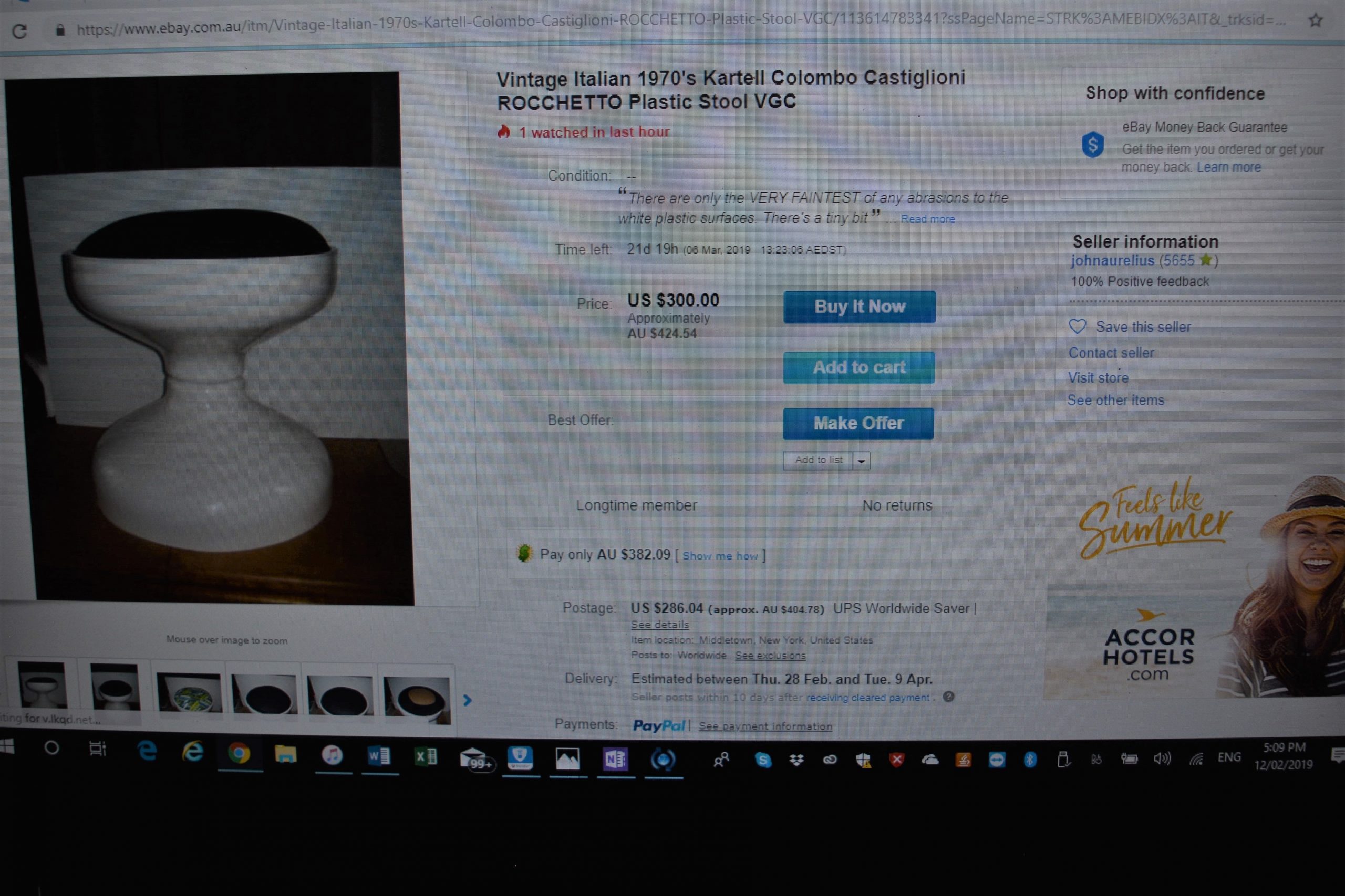 A Kartell “Rocchetto” ABS / Plastic stool / Side Table. This stool was designed by well-known Italian designer, Joe Colombo, in collaboration with Achille Castigilioni (and manufactured by Kartell). I’ve seen very few of these around in recent times. They’re rare on a worldwide platform and with the cushion they consistently fetch around AU $500 EACH. (See the screenshots in this listing- one is 300 euro = AU $478.) The screenshots show the only 2 Kartell Rocchetto stools I could find for sale on a WORLDWIDE platform at the moment (written in 2019). At that time there were NO Kartell Rochetto stools for sale in Australia.