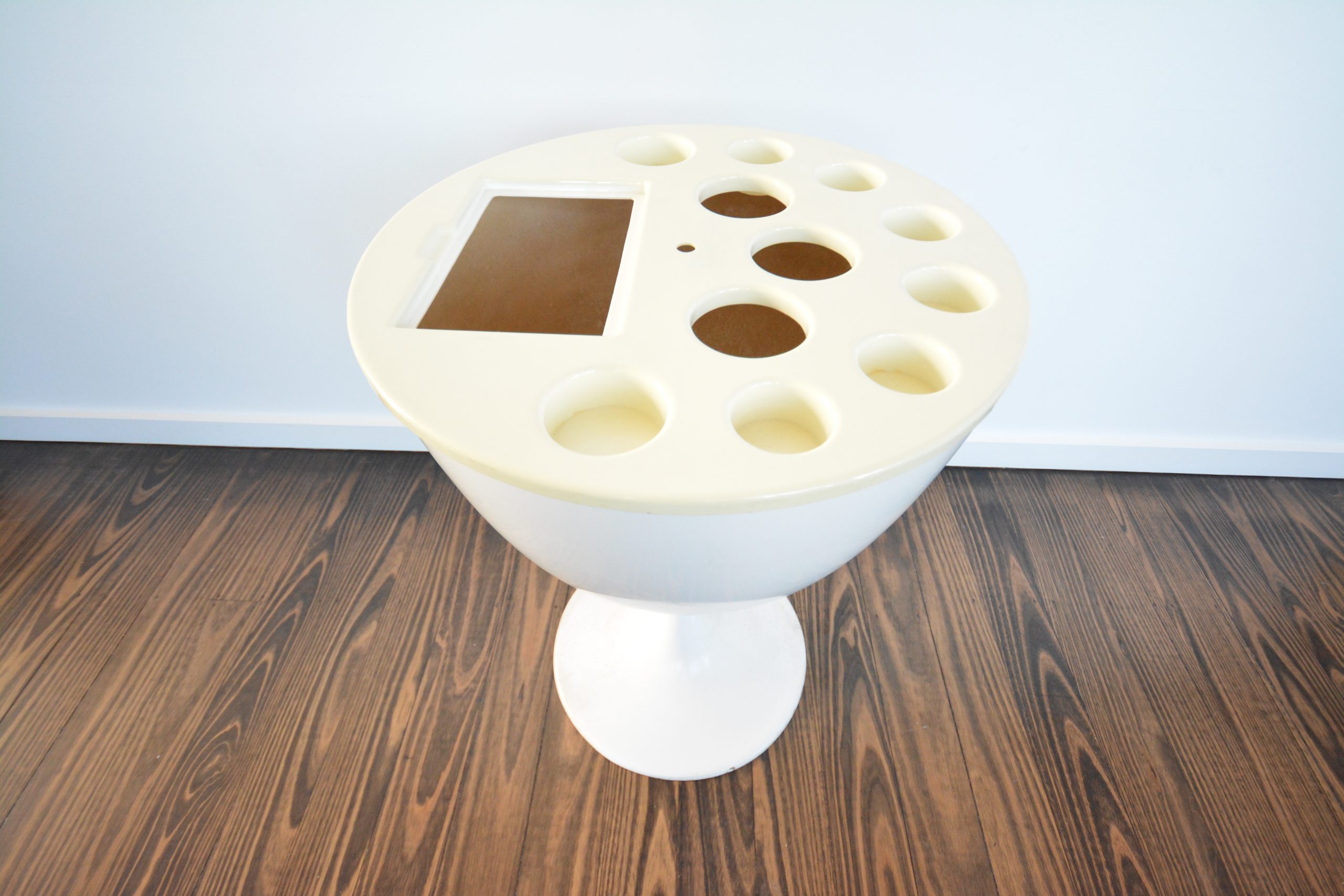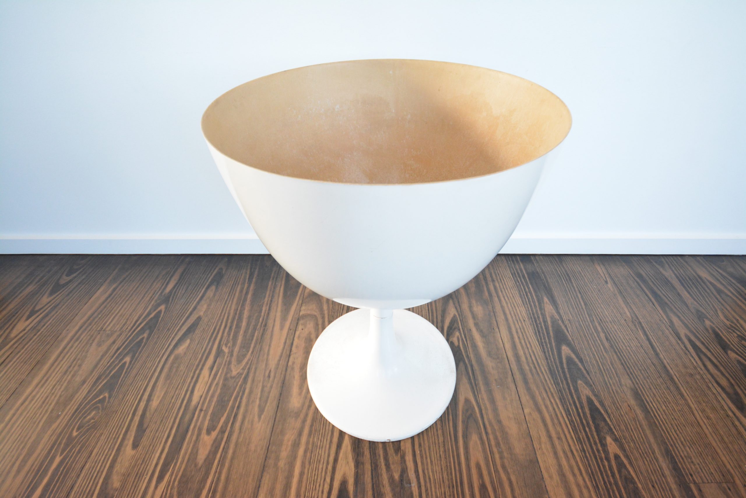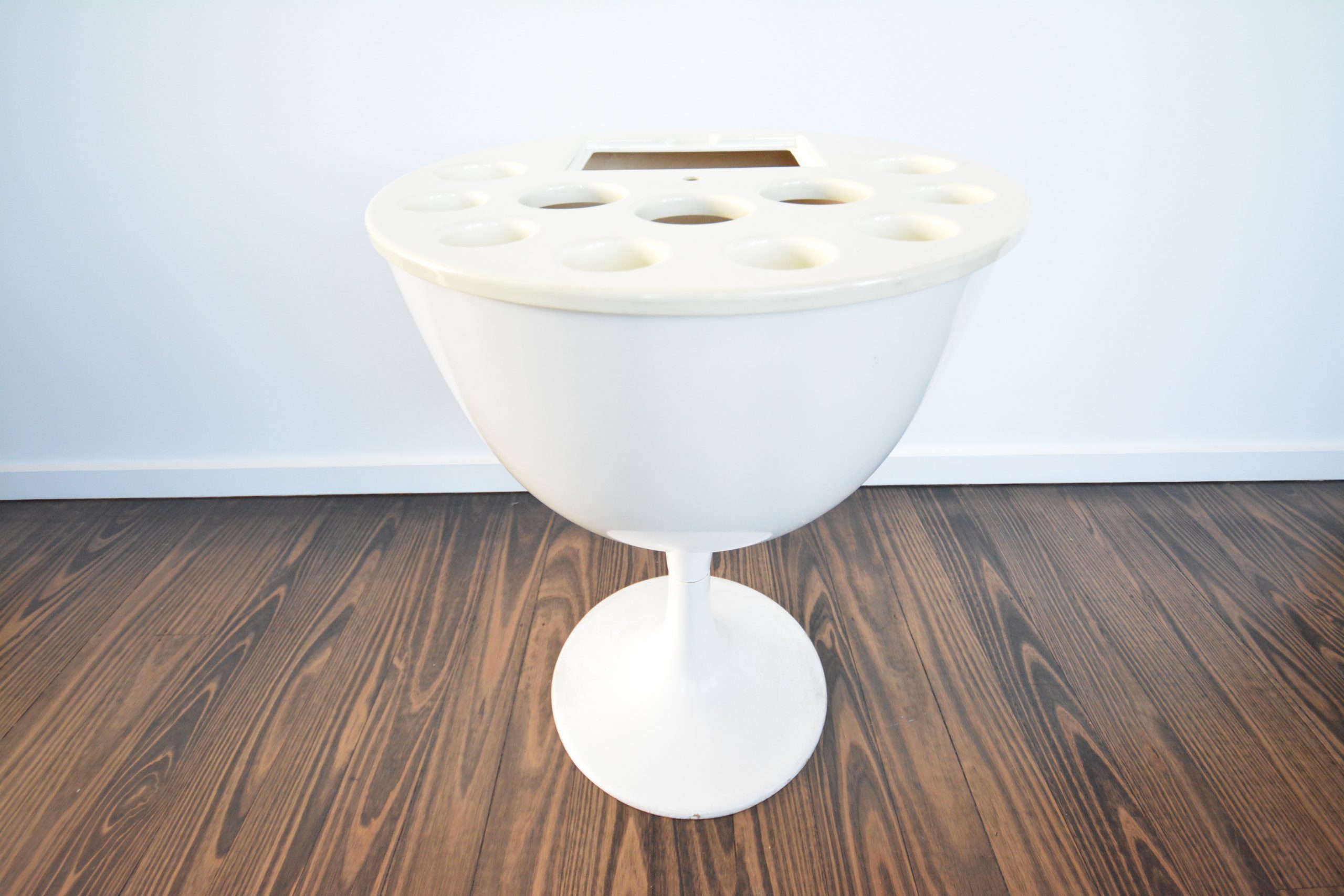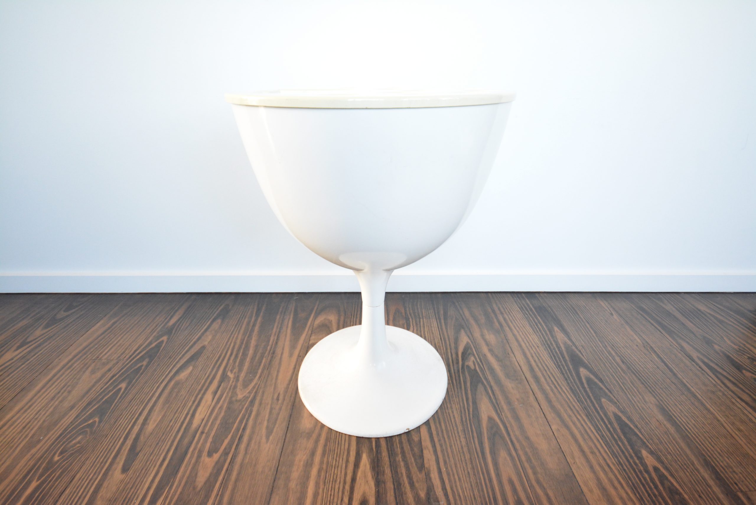 Vintage Fibreglass Bar Unit with wine-glass stem. Stunning hour-glass shape and in WHITE (most desirable colour for something like this! Very cool (and RARE)! You could put a piece of glass on top to stop the piece filling up with rain-water and give you an outdoor table as well. You could also take off the top and use it as a fibreglass planter. Would be perfect for an under-covered outdoor area as both a bar unit or table (if you rest a top on it). I’d say this piece was made in the 1970’s- it definitely has decent age to it. I doubt you’ll ever see another one again.