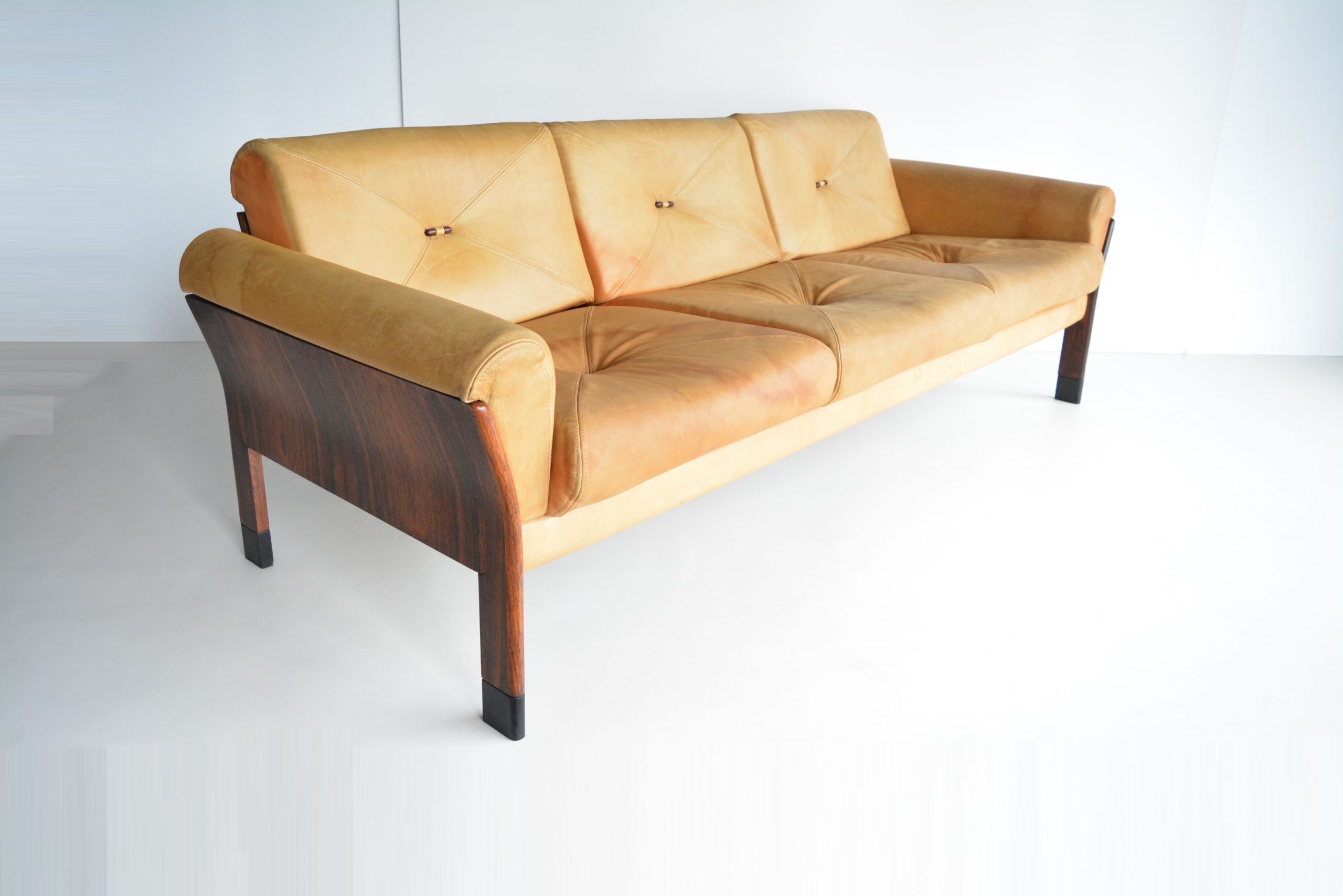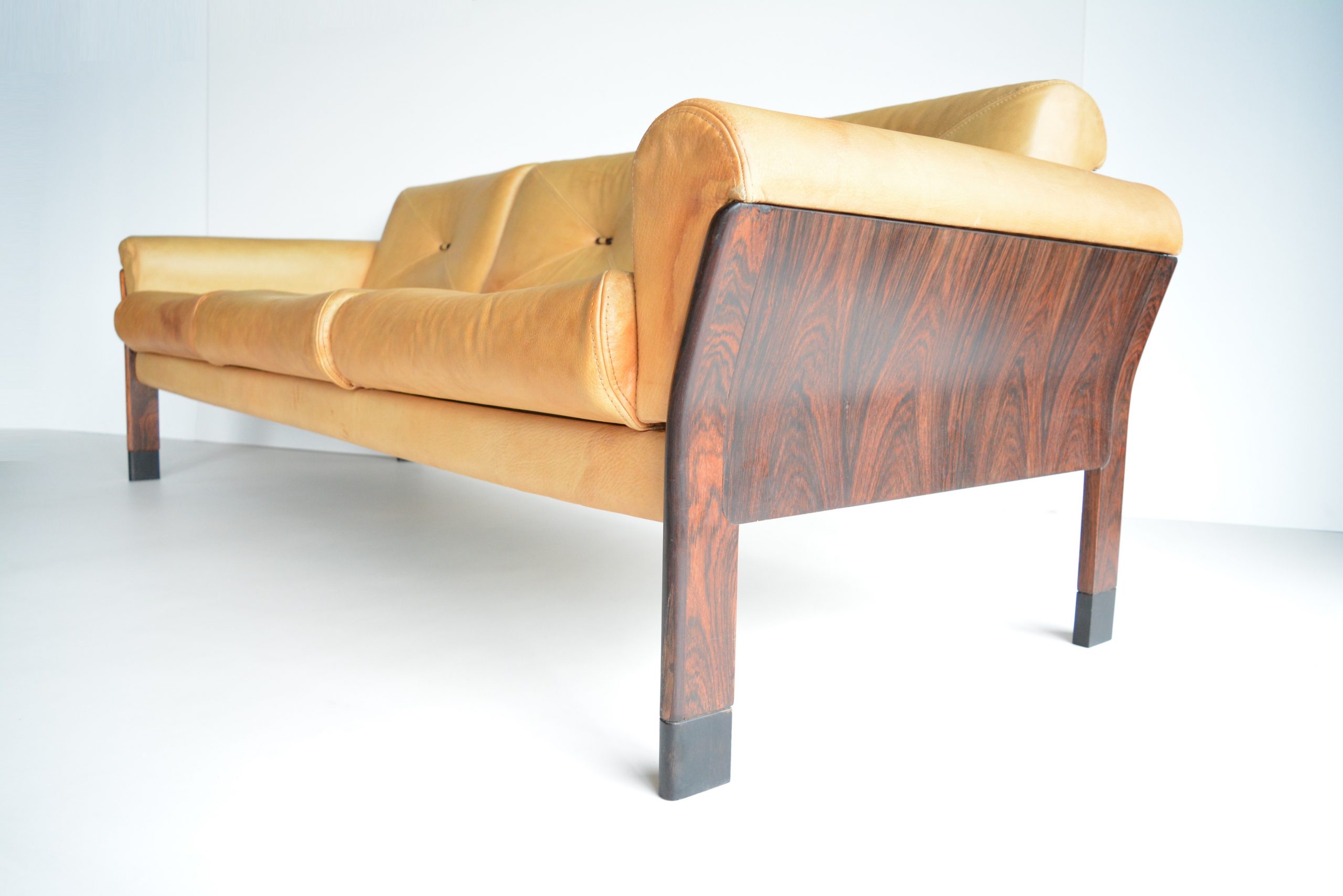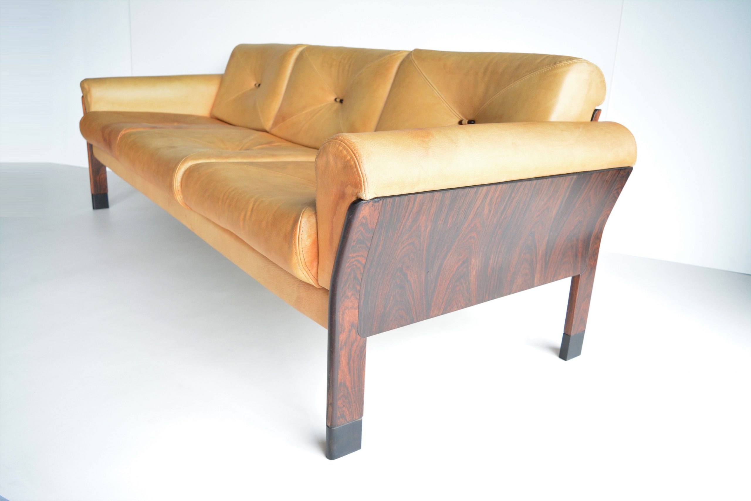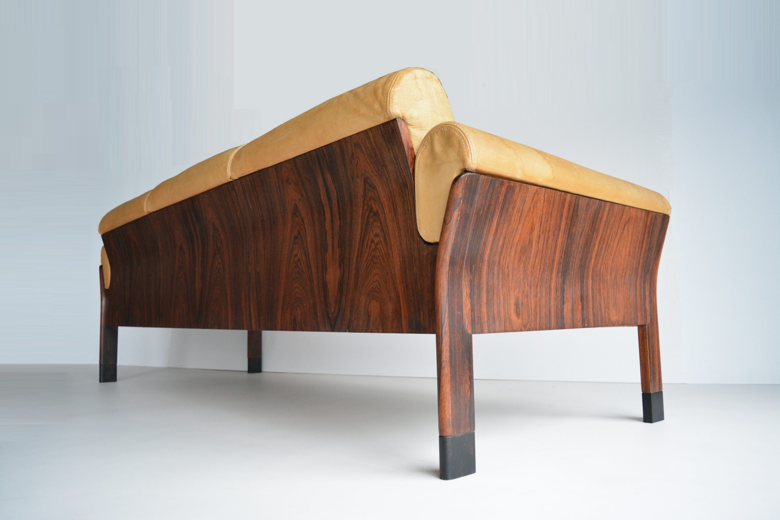 A 3.5 seater AUTHENTIC DANISH-made lounge sofa by Svend Ellekjær in stunning Pallisander Rosewood. Incredibly RARE on an international platform, there are various Svend Ellekjær coffee tables for sale online at present (all of them overseas) but NO lounge sofas I could find at all. This is an early 1960’s piece and in Australia a stand-out piece of design. It’s something I’ve never come across before in 15 years of trading. Beautifully refined in shape and style, the stunning figuring in this highly-prized timber takes focus as does the top-quality construction. Aniline Buffalo leather has been used which is probably the highest quality vintage upholstery you’ll find. It’s incredibly thick and hard-wearing and wears beautifully in a way only quality leather will. Look at it after almost 60 years of use! Total luxury to sink into, you’re not sitting on paint (which is the norm with leather) but full-grain leather that has been treated with natural dyes. (This piece has very HIGH prana (life energy) that synthetic coverings will never have.) Rosewood is extremely rare and sought-after because in the mid-1970’s (15 years AFTER this sofa was made) various furniture manufacturers took an environmental stand against the continued use of Rosewood because these trees were becoming endangered. This means all vintage Rosewood pieces are RARE and sought-after world-wide, particularly Australia. I can count on one hand how many Rosewood pieces I’ve sold in 15 years of being on this business.
