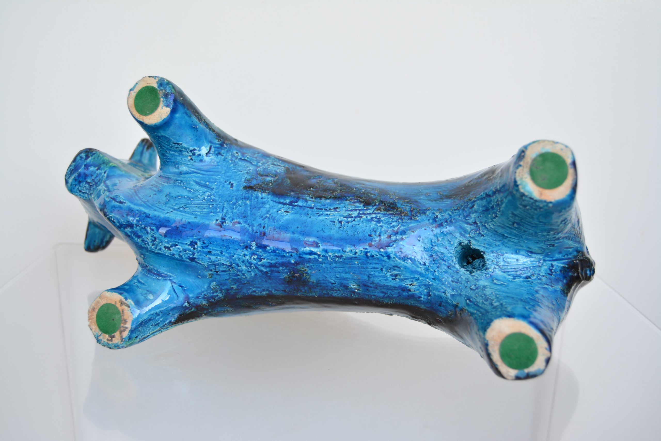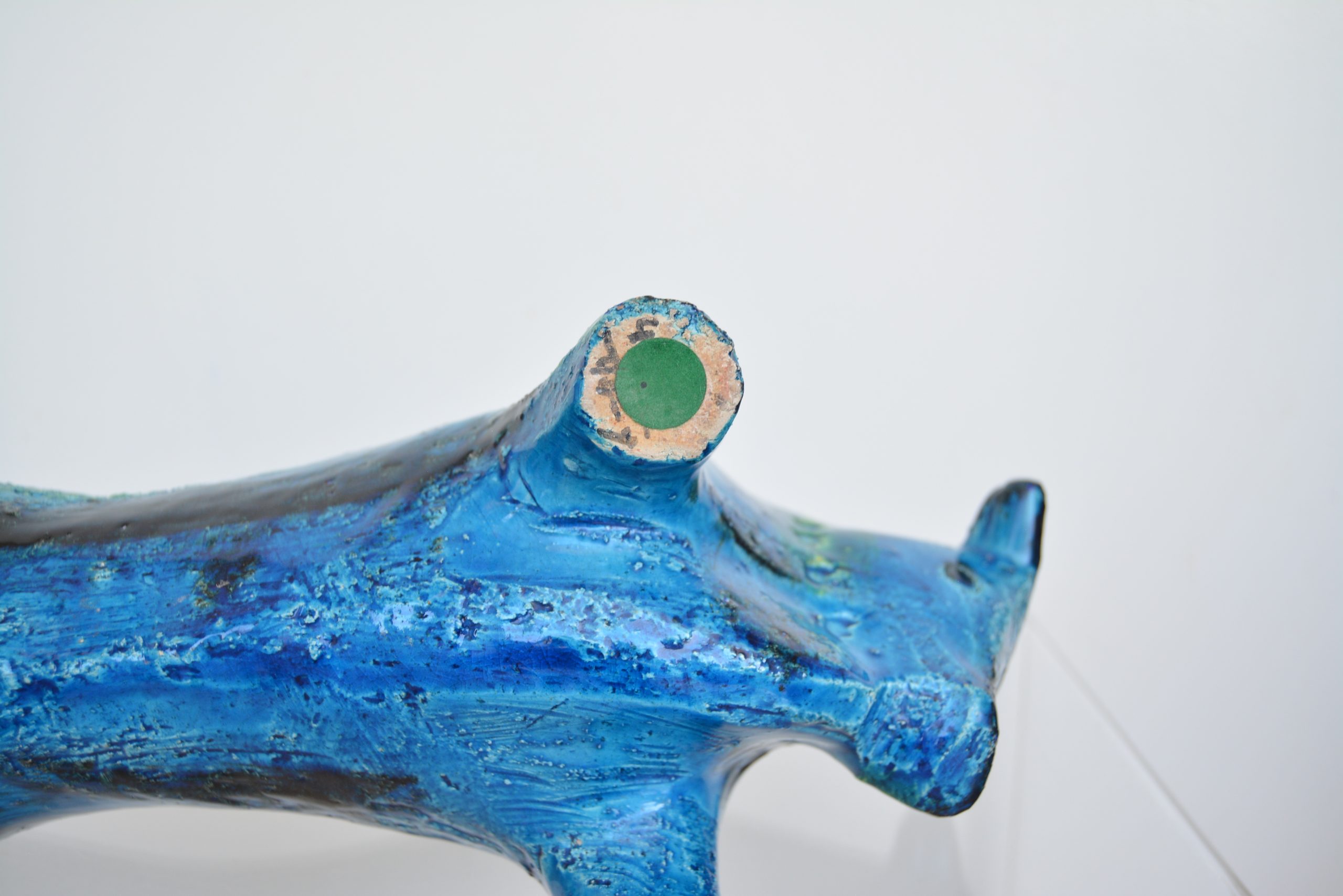 Designed by Aldo Londi and created by the world-famous Italian firm Bitossi, these animals captured the attention of the world and cemented Bitossi’s already world-wide reputation. To my knowledge, Bitossi pieces were never retailed in Australia back in the 1960’s- they’re incredibly rare here and much-loved by Australian collectors. Bitossi animals in Australia are about 20 times rarer than America. This piece is also marked on the foot, Italy, with the design number. (A common- AUTHENTIC- marking for an early original.) Many vintage Bitossi animals AREN’T marked- this gives this Bitossi piece very strong investment value. It’s DEFINITELY a vintage original and NOT a modern re-issue- many aspects of the piece confirm this. (Call me if you want to discuss why. The most obvious sign he’s vintage are the many tooling marks you see on this one which proves he’s been HAND-worked.)