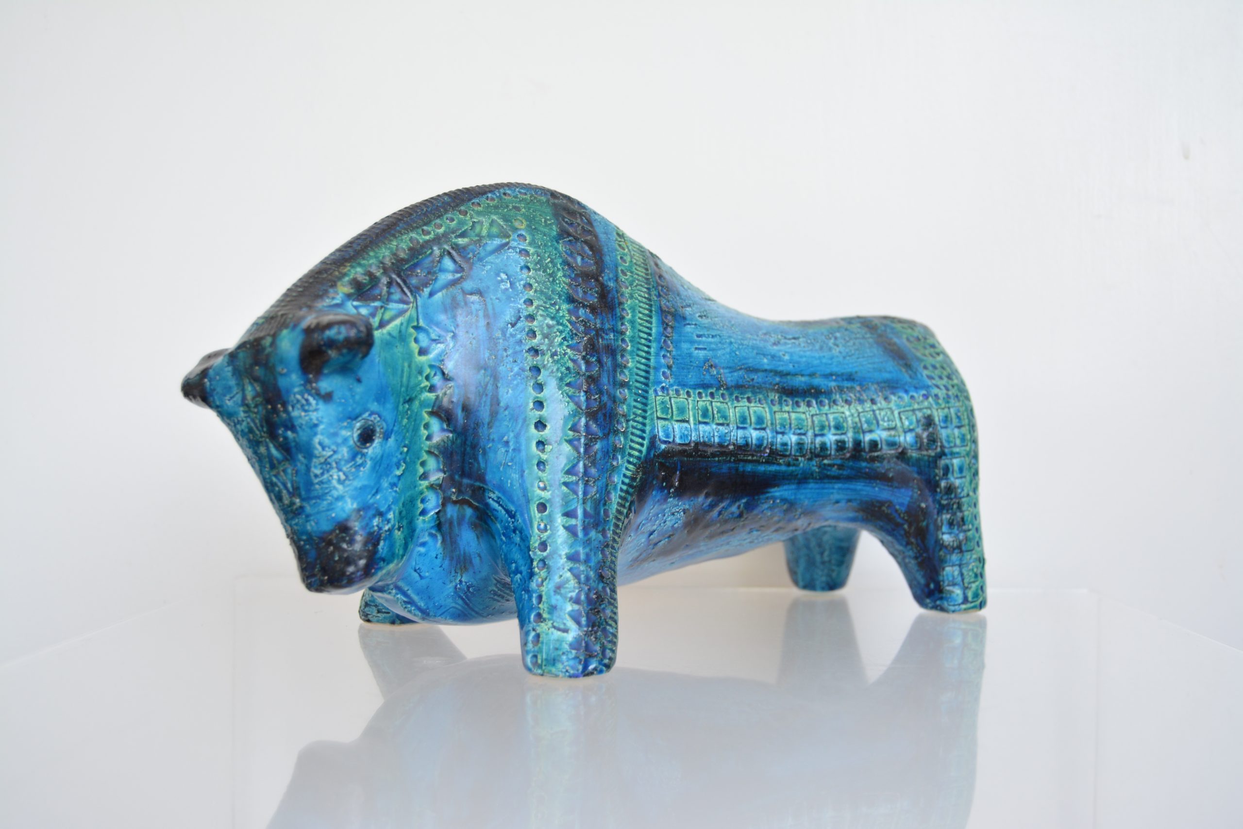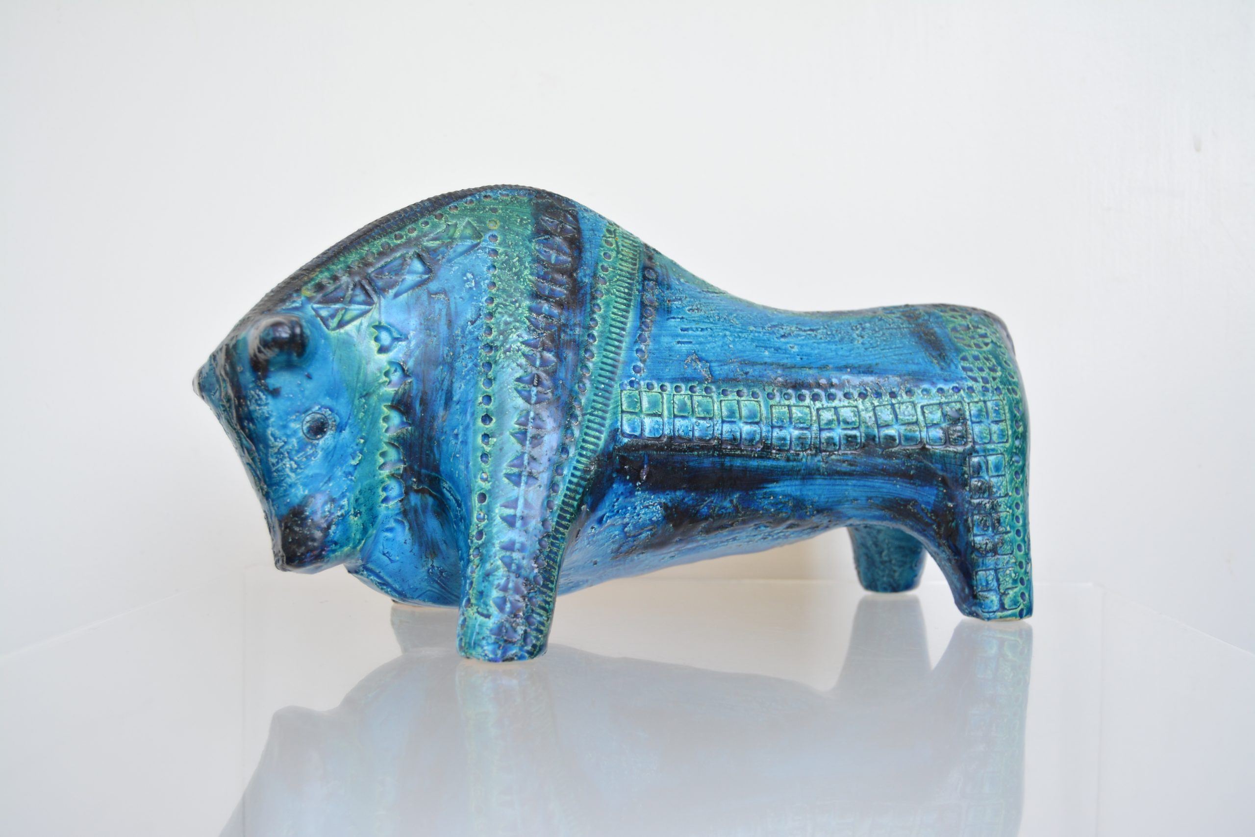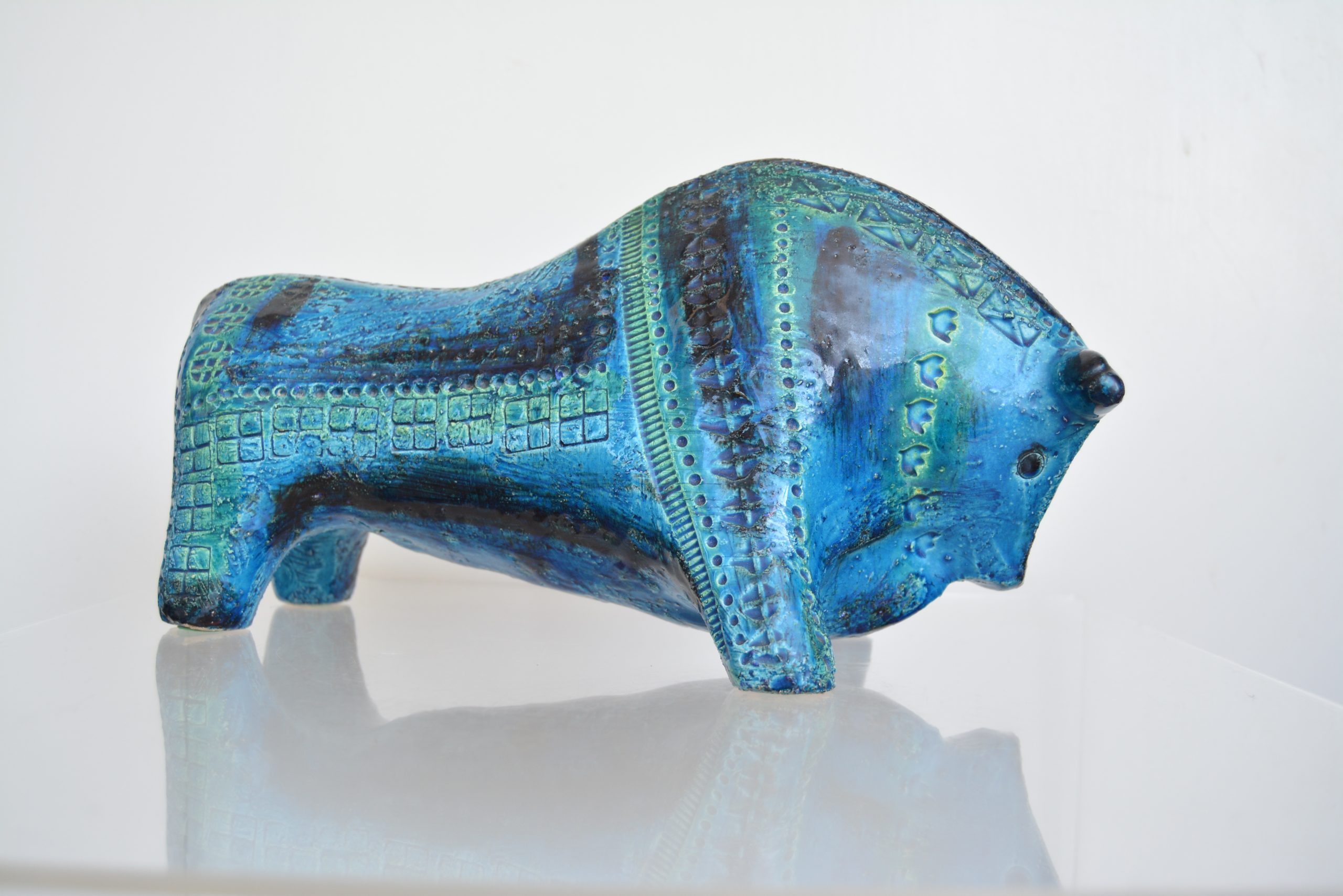A vintage Bitossi bull made in Italy in the late 1950’s or 1960’s. He measures 34cm in length which makes him large enough to stand proudly on his own on a sideboard and not look swamped. The bold stance gives him an extra air of authority. The bull is the quintessential Bitossi piece and the hardest to get- this is the third one I’ve had (in 20 years of being in this business). VINTAGE Bitossi pieces were all done by hand- the incisions on the outside, the paint decoration and moulding have been done by the hands of an artist making every Bitossi piece individualistic. The new re-issues are little more than replicas. The re-issues are NOT made by hand- NONE of it- which gives the new ones virtually no collector appeal. (I’m not entirely convinced the re-issues were even made in Italy- in this day and age, just because something has Made In Italy printed on it doesn’t mean it is. (Many new pieces labelled with “”Murano” these days are NOT made in Murano, the island in Italy, but China instead.)